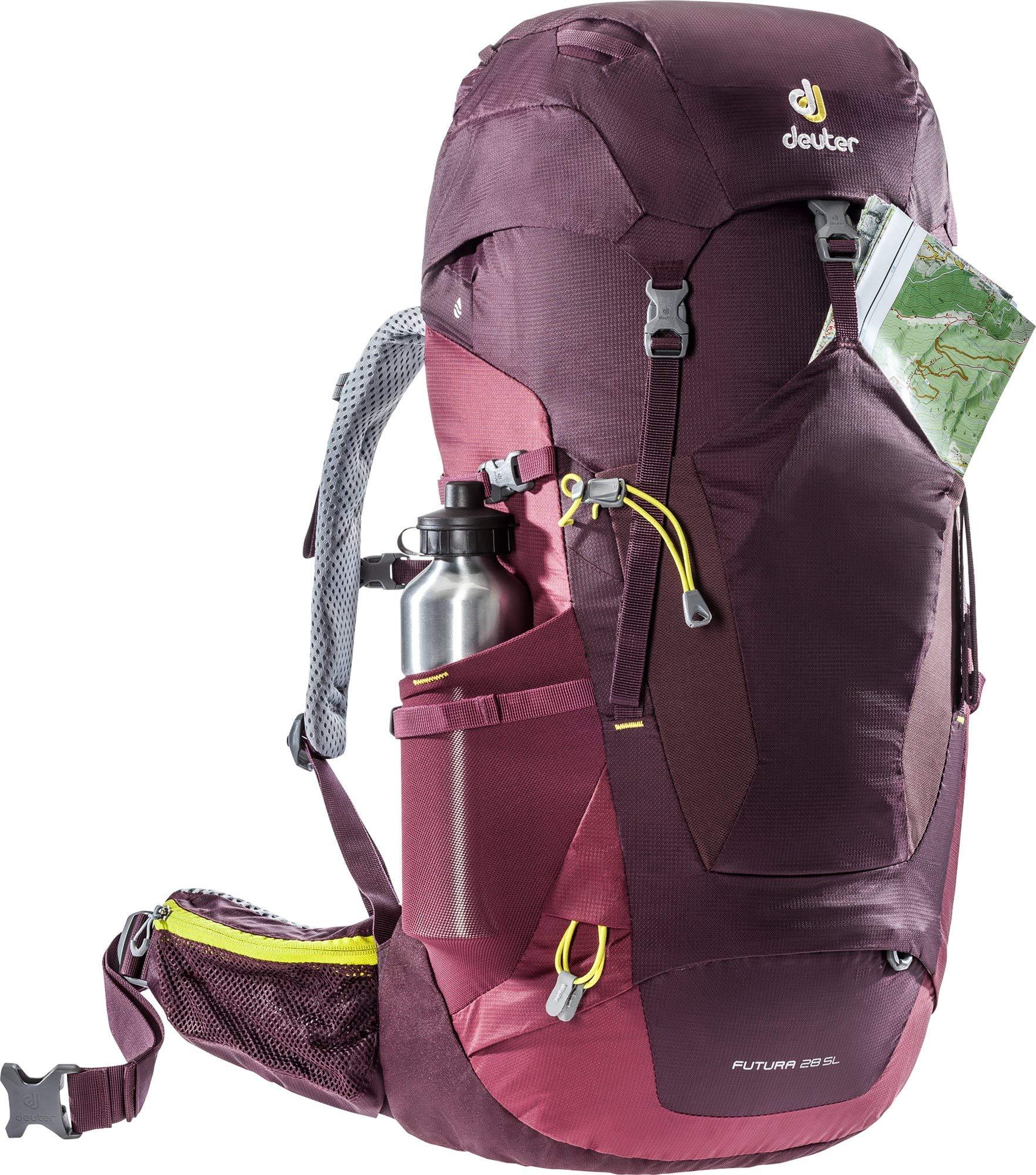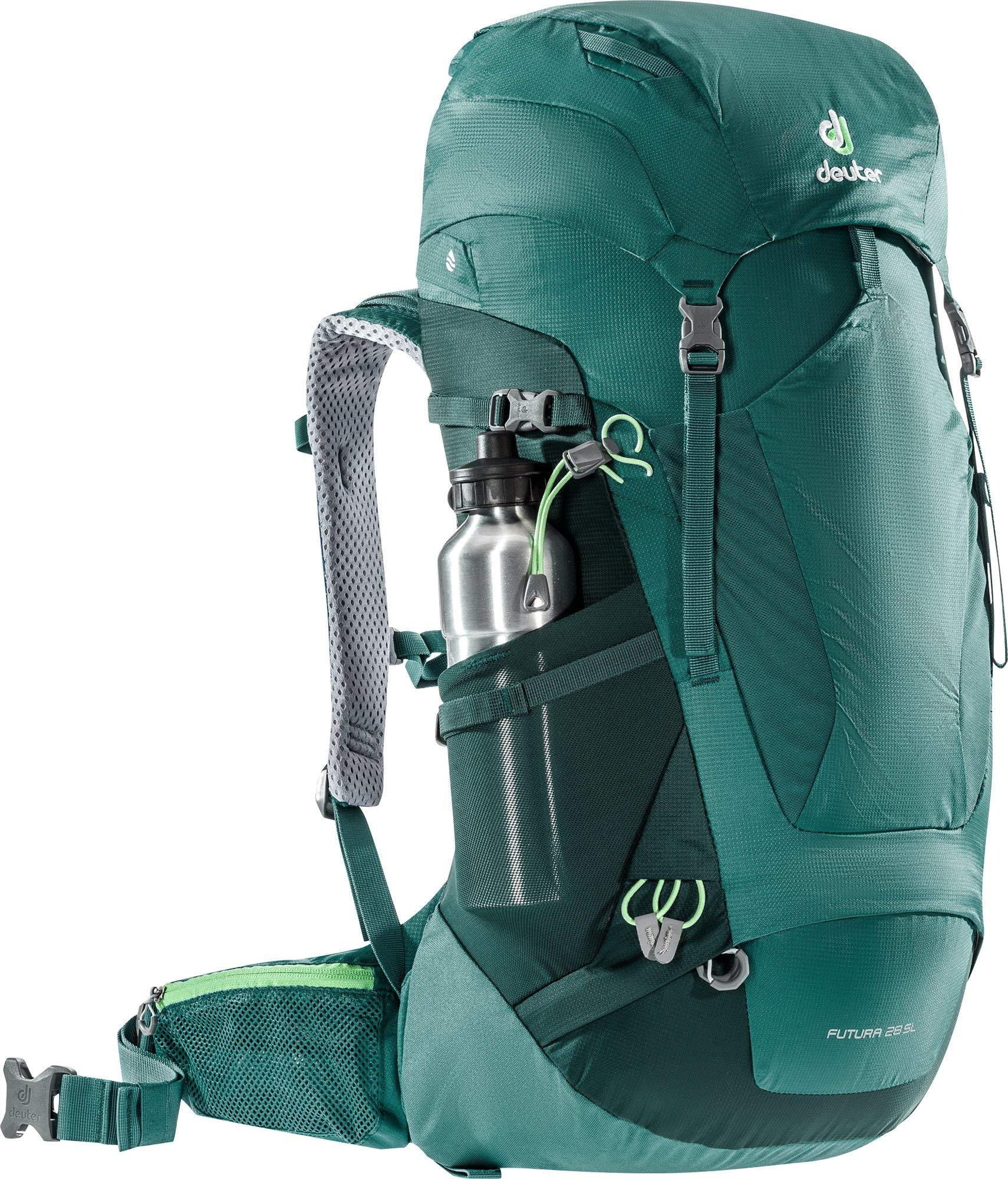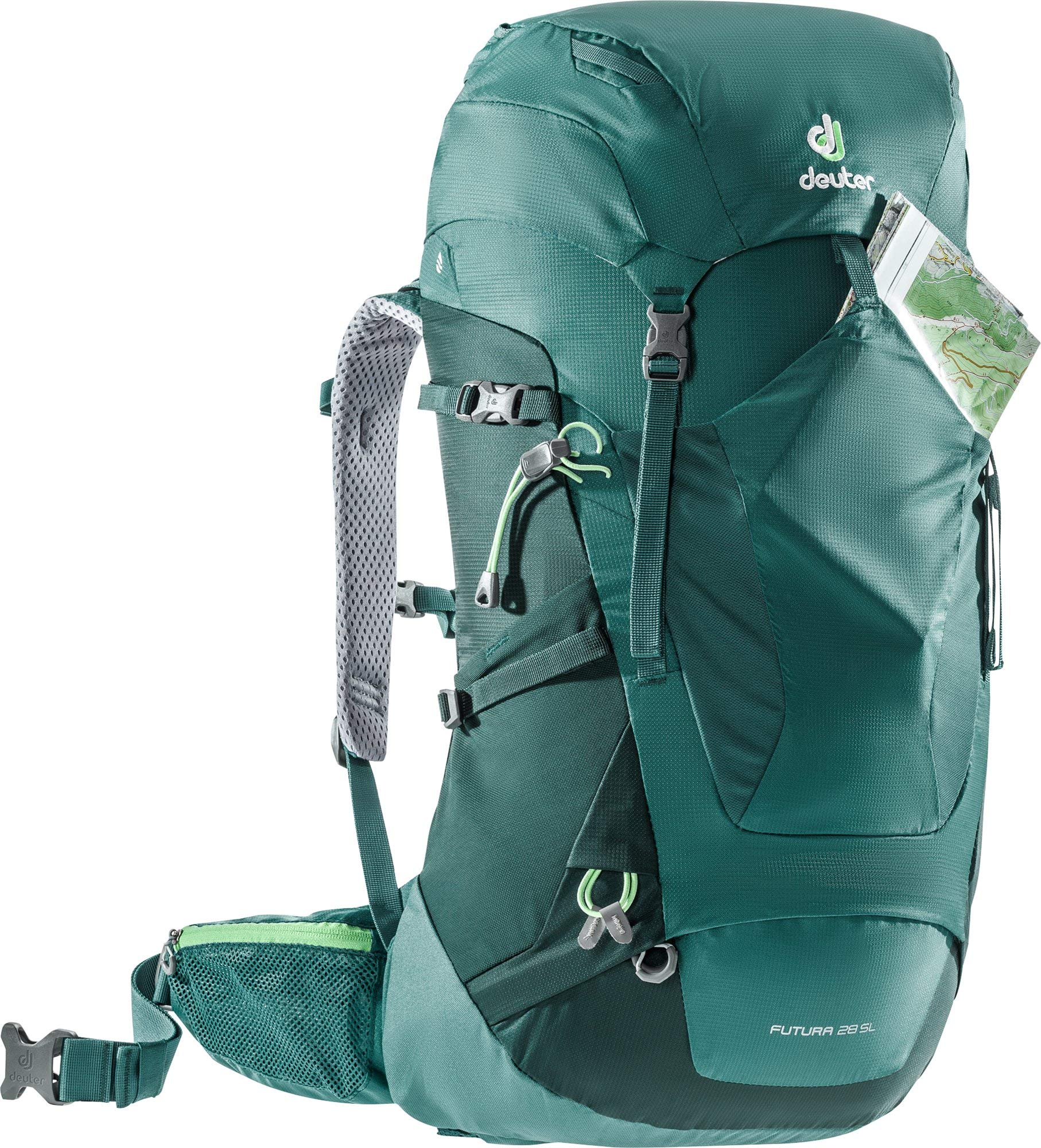 An athletic daypack for easy hikes, city trips, or viaferratas, the Futura 26 SL offers sophisticated solutions for all kinds ofdemands. Its accommodating 26-liter capacity, ultralight weight of 2 lbs. 12oz., and abundant ergonomic features make it one of the most functional packsfor on the market for advanced-level hiking and climbing excursions, no matterthe season or weather. Read more The Aircomfort Sensic Backsystem On small tomedium backpacks that are at home with nimble loads in all types of terrainDeuter strives for maximum ventilation with the Aircomfort Sensic system. It'sflexible spring steel frame is extremely durable, providing stable tension forthe airy back mesh and creating a space between the pack and the wearer's backfor moist warm air to dissipate. Having invented the first mesh back system in1984 Deuter has over 30 years of innovation and design into the active fitshoulder harness and air mesh padded hip belt that effectively adjust to eachwearer and achieve fantastic carry comfort through stable construction andeffective load transfer. Read more Engineered For Women Deuters womensspecific fit packs were designed for women by women. Featuring a slightlyshorter back length (14-18inches), narrower shoulder harness, and conicalshaped hip belt the SL design will move with you and adjust to each wearerthrough the active fit pivoting shoulder harness and dual density foam hipbelt. Read more Pack Features Dual zippered pockets on hip belt Hiking poleattachment loops Side compression straps for regulating pack volume Stretchside water bottle pockets Large front stretch pocket Height and widthadjustable chest strap Integrated detachable rain cover with reflector logoHydration system compatible Separate bottom compartment with zippered dividerRead more