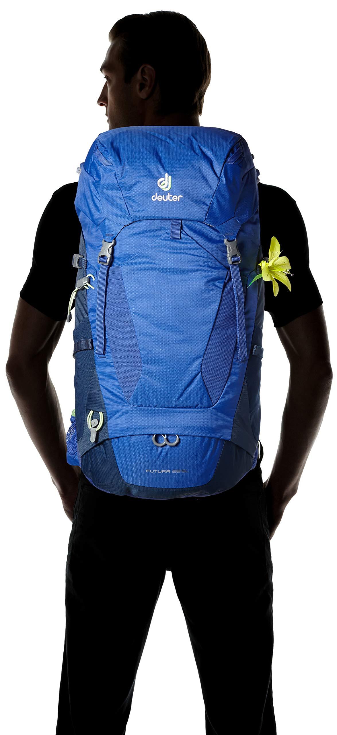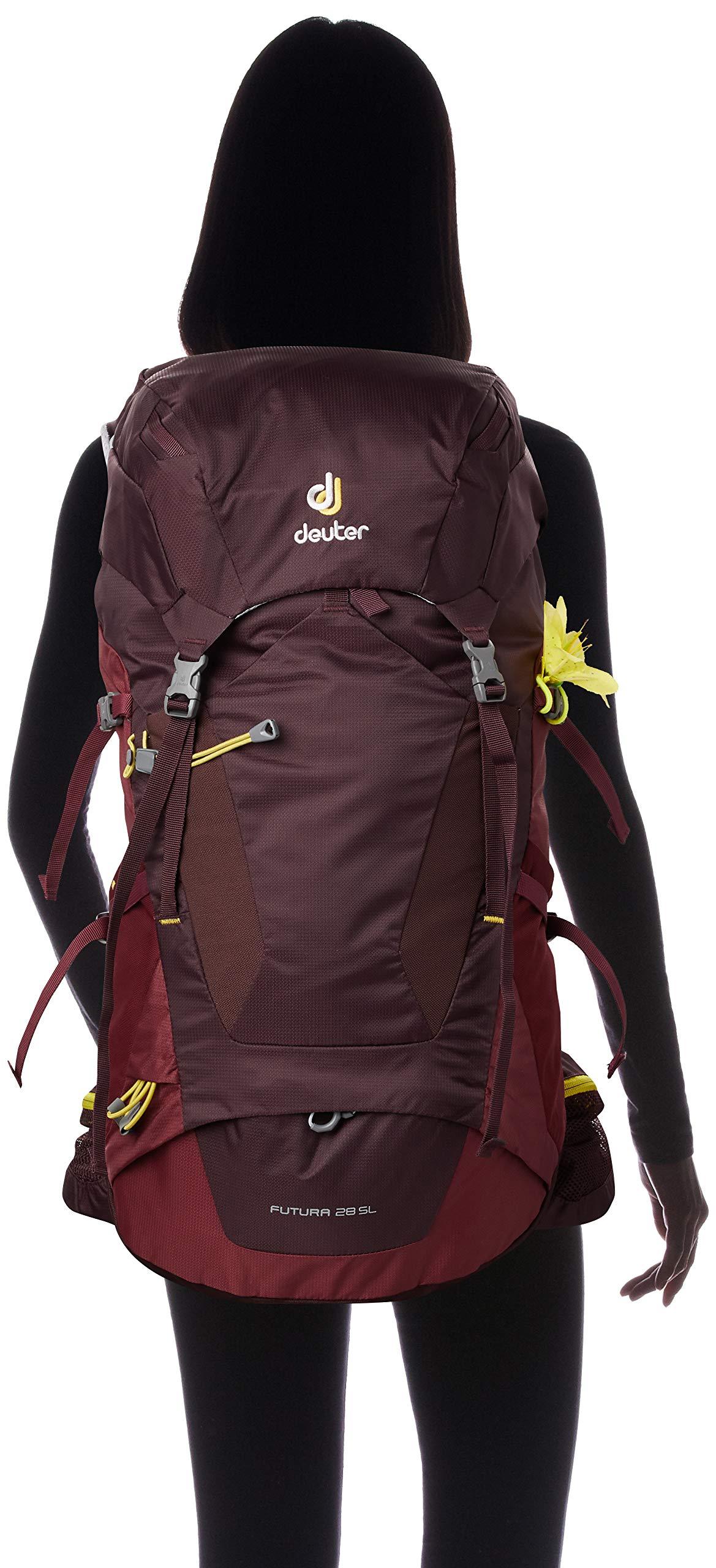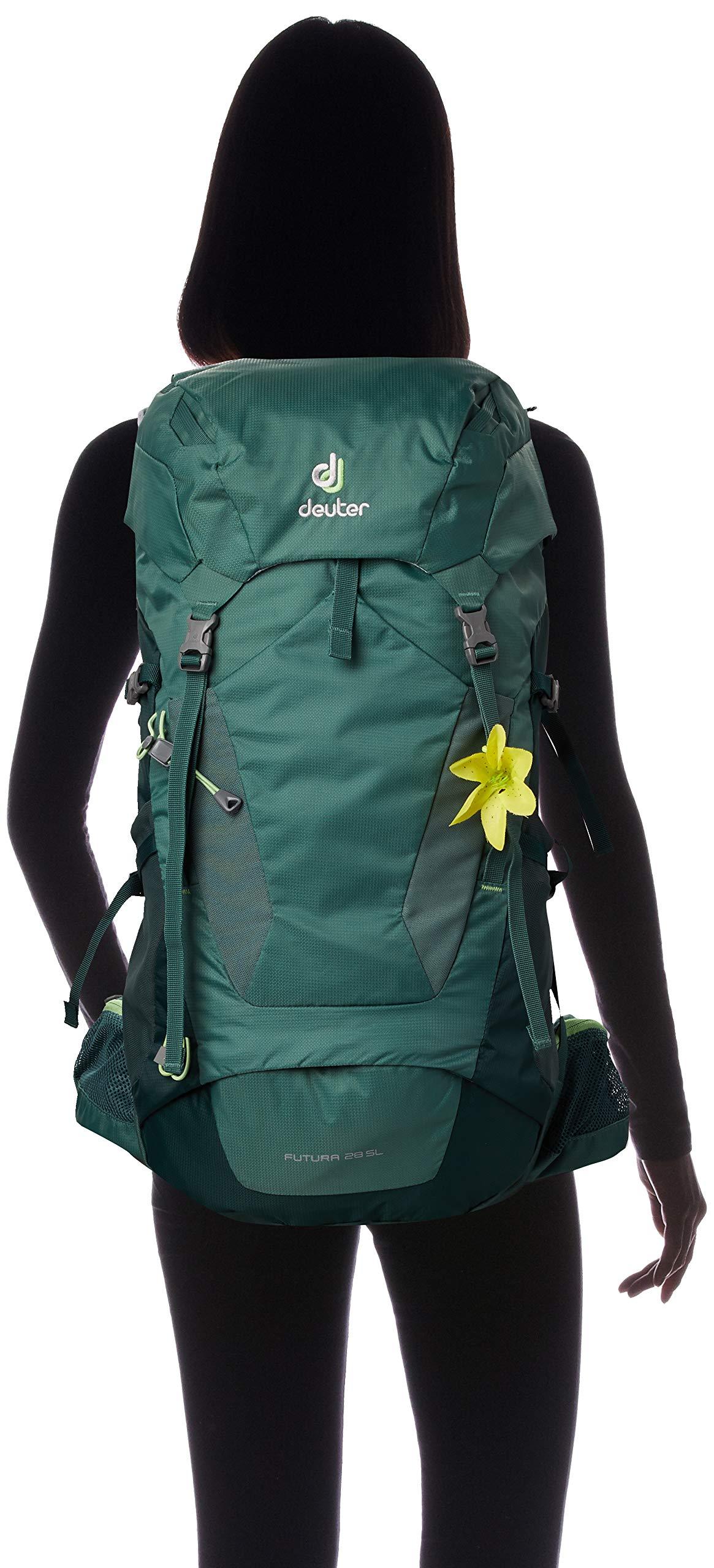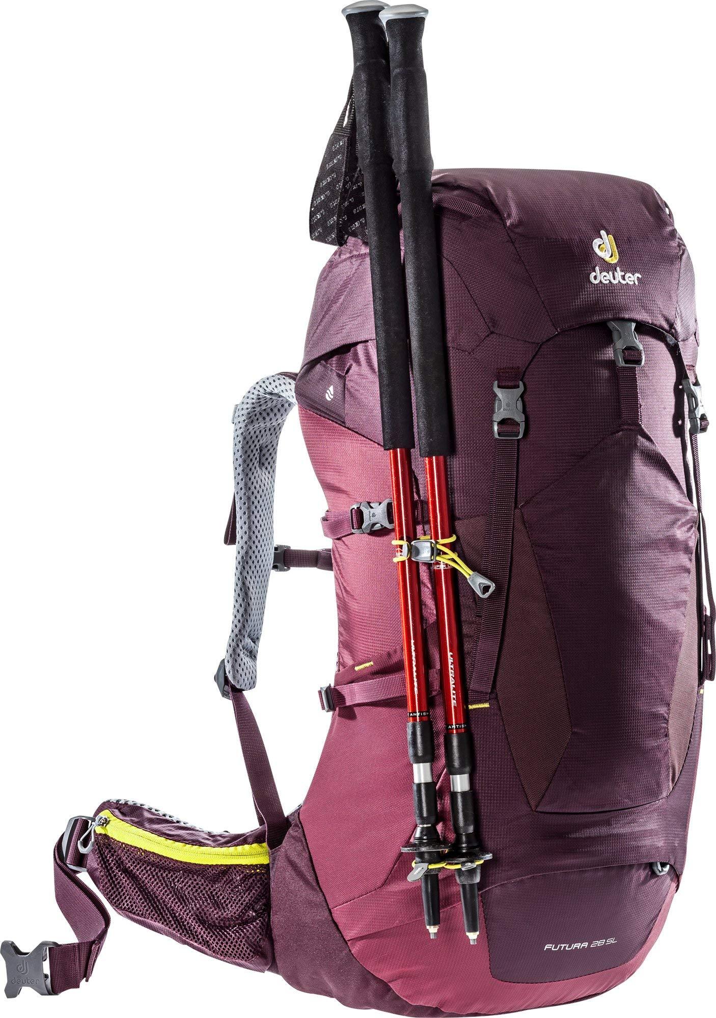 An athletic daypack for easy hikes, city trips, or viaferratas, the Futura 26 SL offers sophisticated solutions for all kinds ofdemands. Its accommodating 26-liter capacity, ultralight weight of 2 lbs. 12oz., and abundant ergonomic features make it one of the most functional packsfor on the market for advanced-level hiking and climbing excursions, no matterthe season or weather. Read more The Aircomfort Sensic Backsystem On small tomedium backpacks that are at home with nimble loads in all types of terrainDeuter strives for maximum ventilation with the Aircomfort Sensic system. It'sflexible spring steel frame is extremely durable, providing stable tension forthe airy back mesh and creating a space between the pack and the wearer's backfor moist warm air to dissipate. Having invented the first mesh back system in1984 Deuter has over 30 years of innovation and design into the active fitshoulder harness and air mesh padded hip belt that effectively adjust to eachwearer and achieve fantastic carry comfort through stable construction andeffective load transfer. Read more Engineered For Women Deuters womensspecific fit packs were designed for women by women. Featuring a slightlyshorter back length (14-18inches), narrower shoulder harness, and conicalshaped hip belt the SL design will move with you and adjust to each wearerthrough the active fit pivoting shoulder harness and dual density foam hipbelt. Read more Pack Features Dual zippered pockets on hip belt Hiking poleattachment loops Side compression straps for regulating pack volume Stretchside water bottle pockets Large front stretch pocket Height and widthadjustable chest strap Integrated detachable rain cover with reflector logoHydration system compatible Separate bottom compartment with zippered dividerRead more