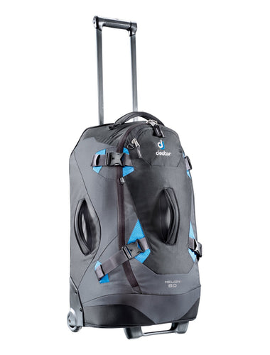 The Deuter Helion 60 travel pack is an elegant travel companion with a striking design and is also protected with reinforced corners and edges. This pack also features x-shaped safety straps and tough, heavy duty handles for quick packing and rough transportation. The main compartment holds its shape when fully open and can hold just about everything you've got in your closet but includes lockable zips that are easy to open and stay closed.