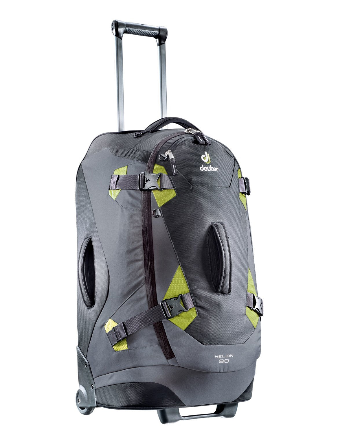 The Deuter Helion 80 travel pack is a sporty and elegant travel pack that not only looks good but also functions well. With reinforced corners and edges, this pack also features x-shaped safety straps and tough, heavy duty handles for quick packing and rough transportation. Designed for the frequent flyer, its interior compartment holds its shape when fully open and glides easily on wheels that can handle gravel, pavement, carpet, or grass.