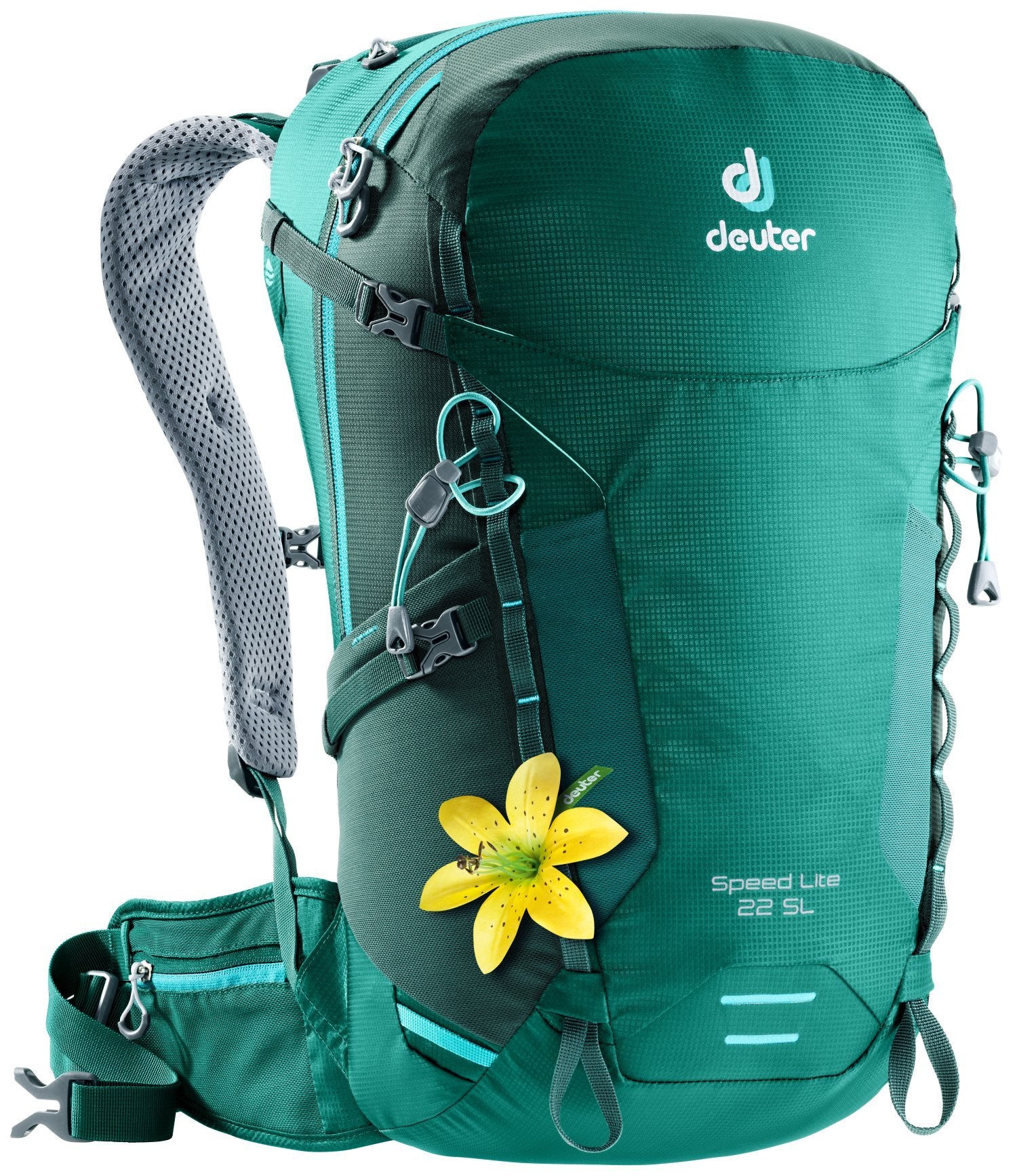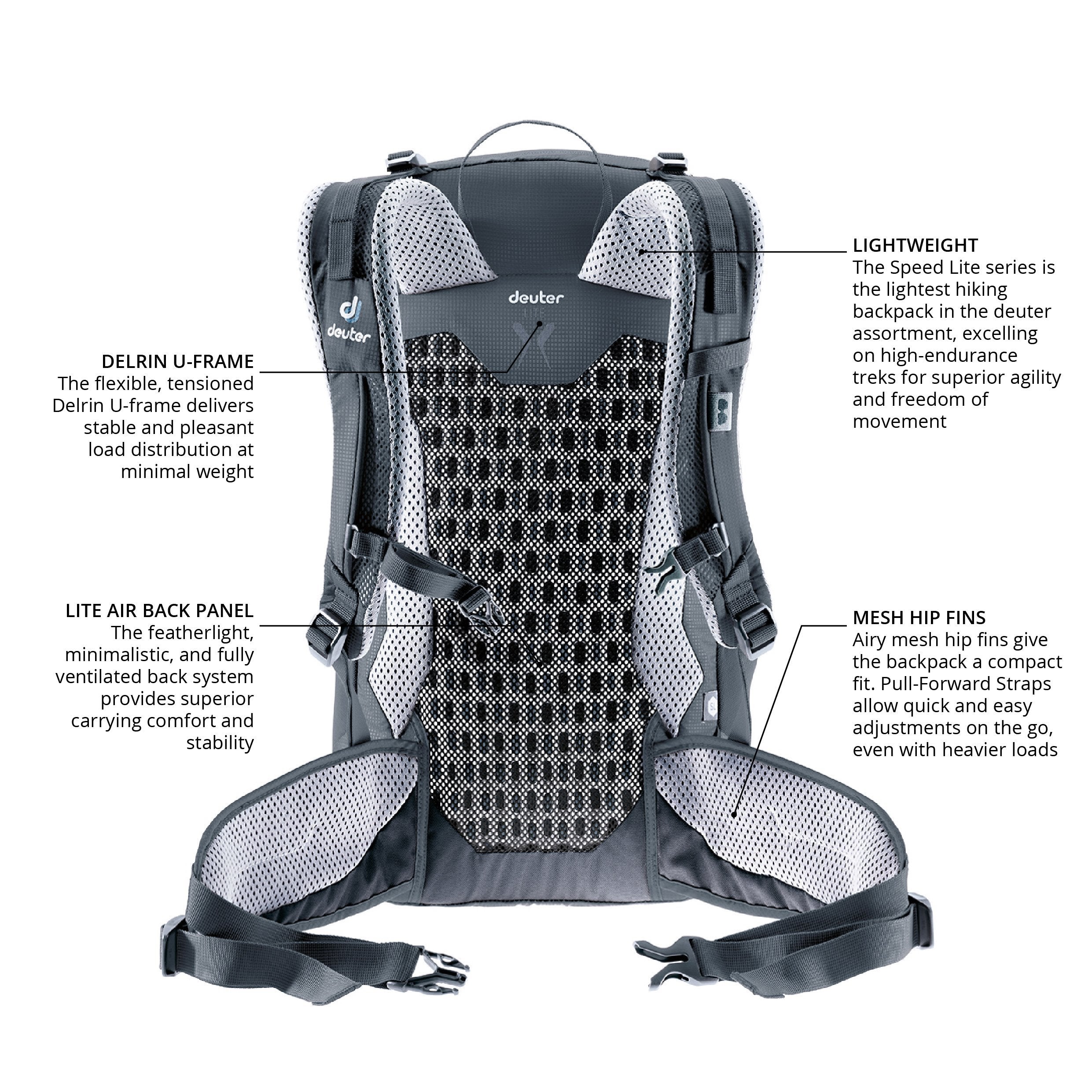 The most minimalistic hiking backpack in Deuter's collection, the Speed Lite22 SL excels in its extreme lightness and puristic design, providing maximumcarrying comfort and outstanding ventilation for athletic tours and alpineadventures in challenging terrain. The Lite Air Backsystem is streamlined,breathable, and high-performing, with its flexible and tensioned DelrinU-frame and airy 3D mesh minimizing perspiration and maximizing trailendurance. This hiking pack delivers everything you need and nothing youdon't: concealable shoulder harness and hip belt, side compression straps forregulating pack volume, accessory loops for gear attachment, easy finger pullloops on zippers, stretch side water bottle pockets, and hydration systemcompatibility. The Speed Lites keep backcountry safety in mind with a built-inloop for a safety light, 3M reflectors, and a just-in-case SOS label providinglife-saving tips. In its sleek and intelligent design, the Speed Lite 22 SLwill over-perform on any elite adventure with such grace and ergonomics thatyou'll hardly notice it's there.