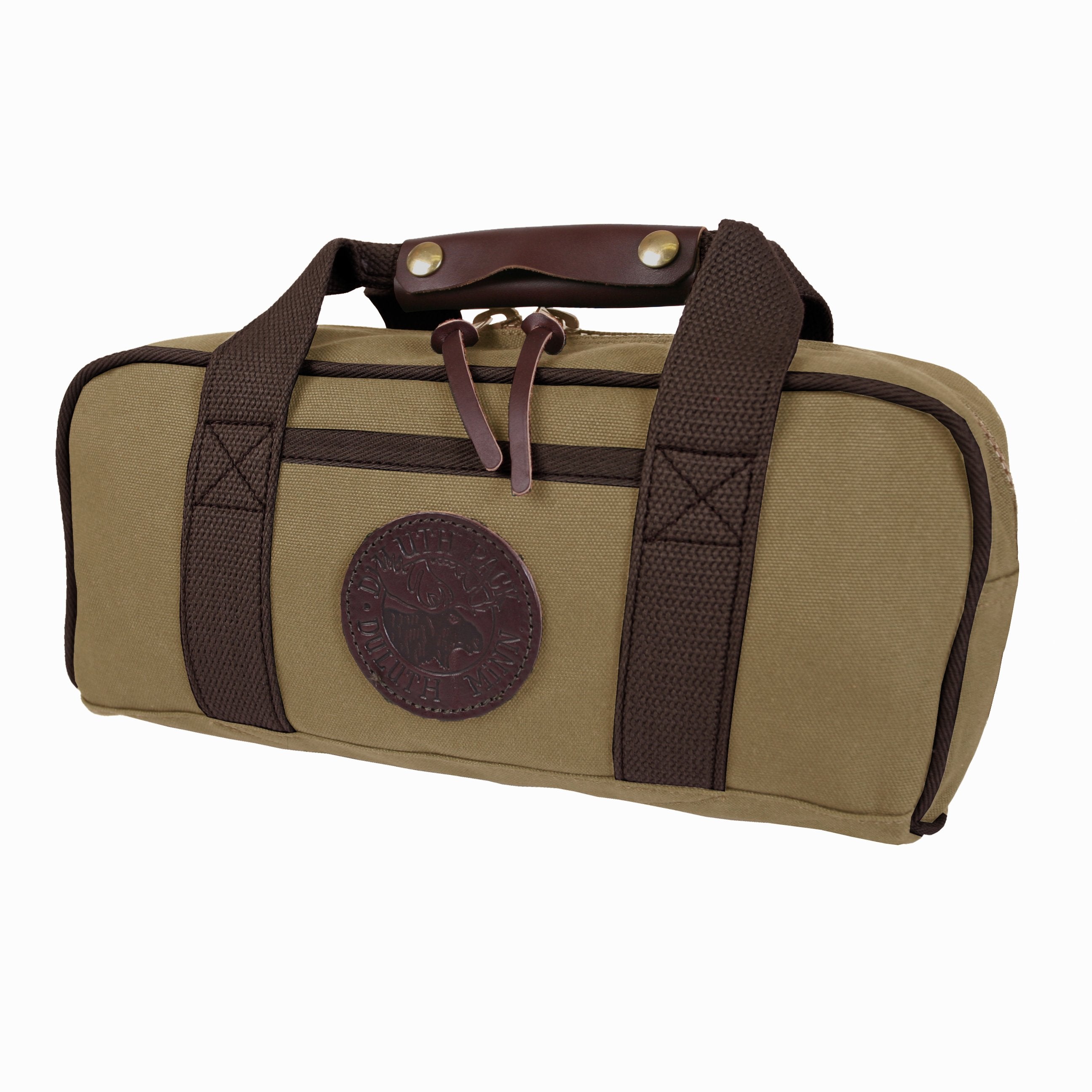 Reinforced bottom. Front slip pocket. Cotton webbing handle w/ leather snap grip. Great as a tool kit, range bag, CD case, doctors bag, etc. Guaranteed for life. Made in the USA.