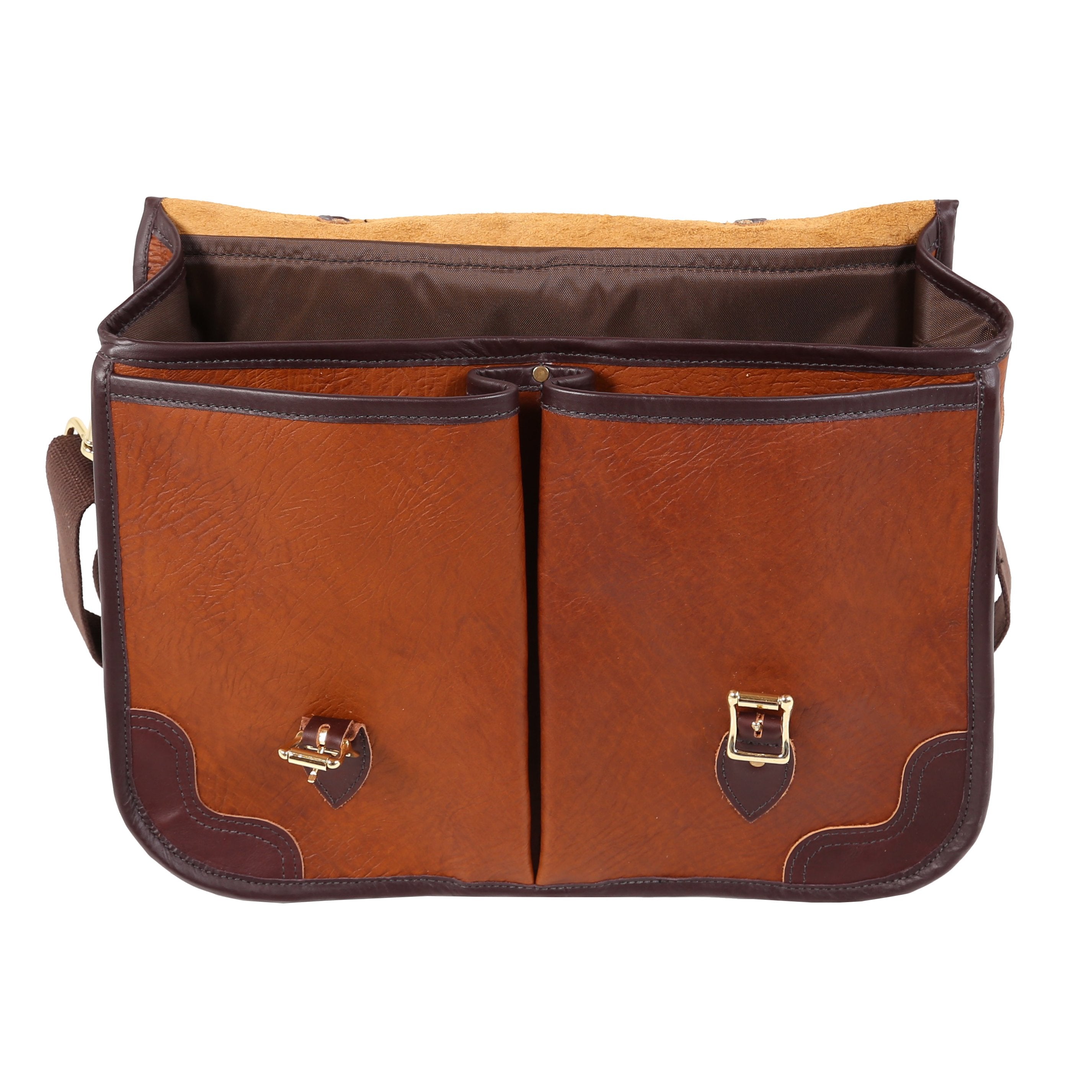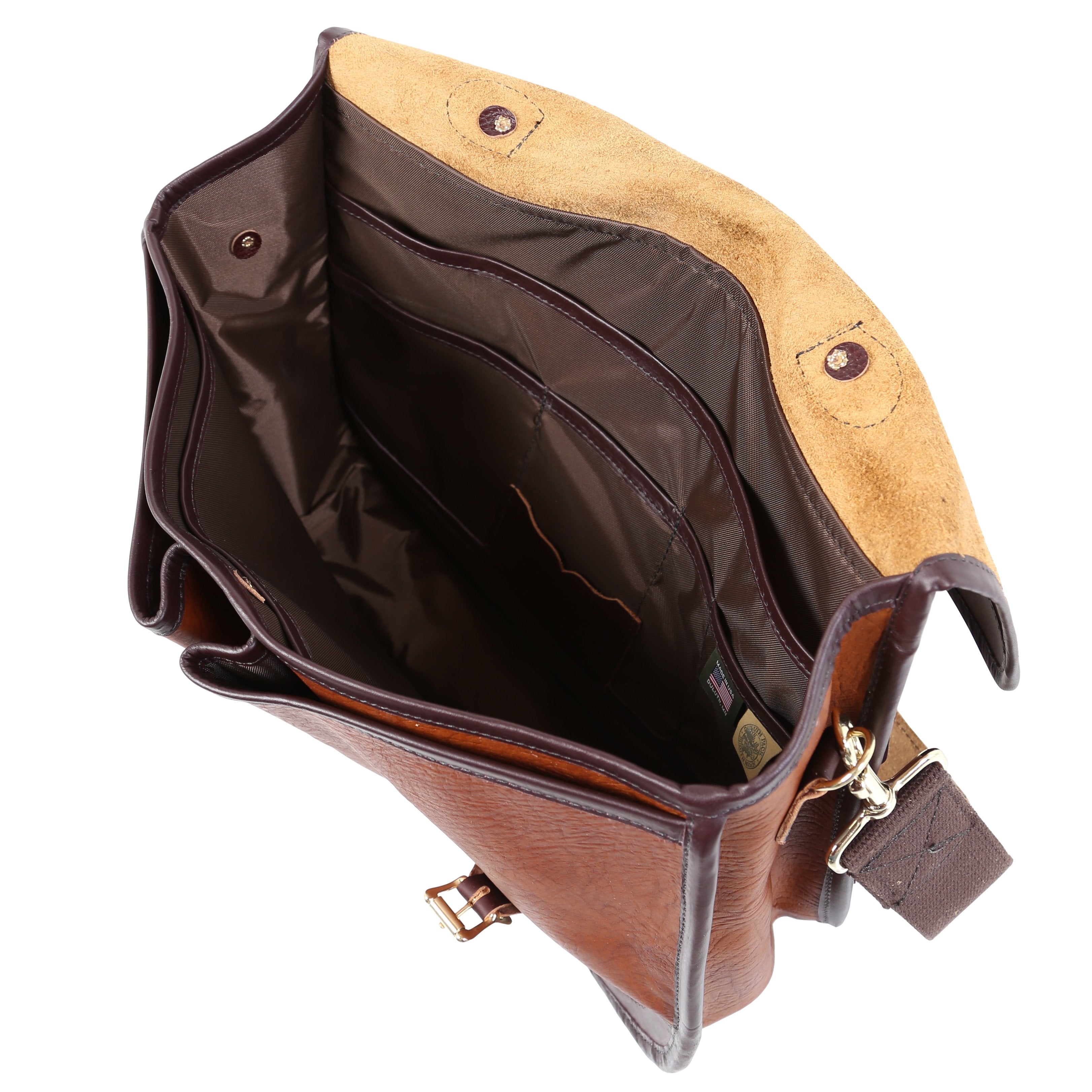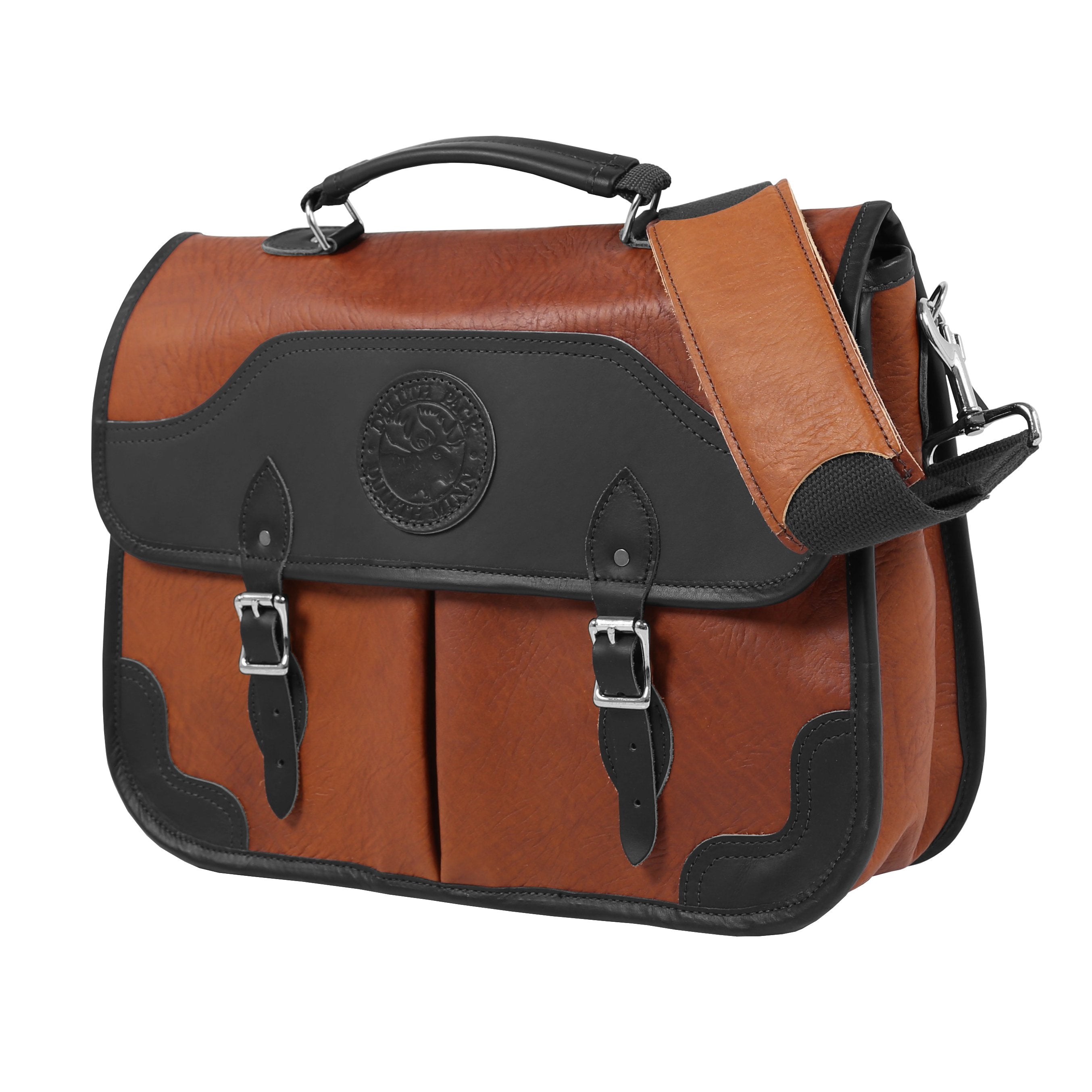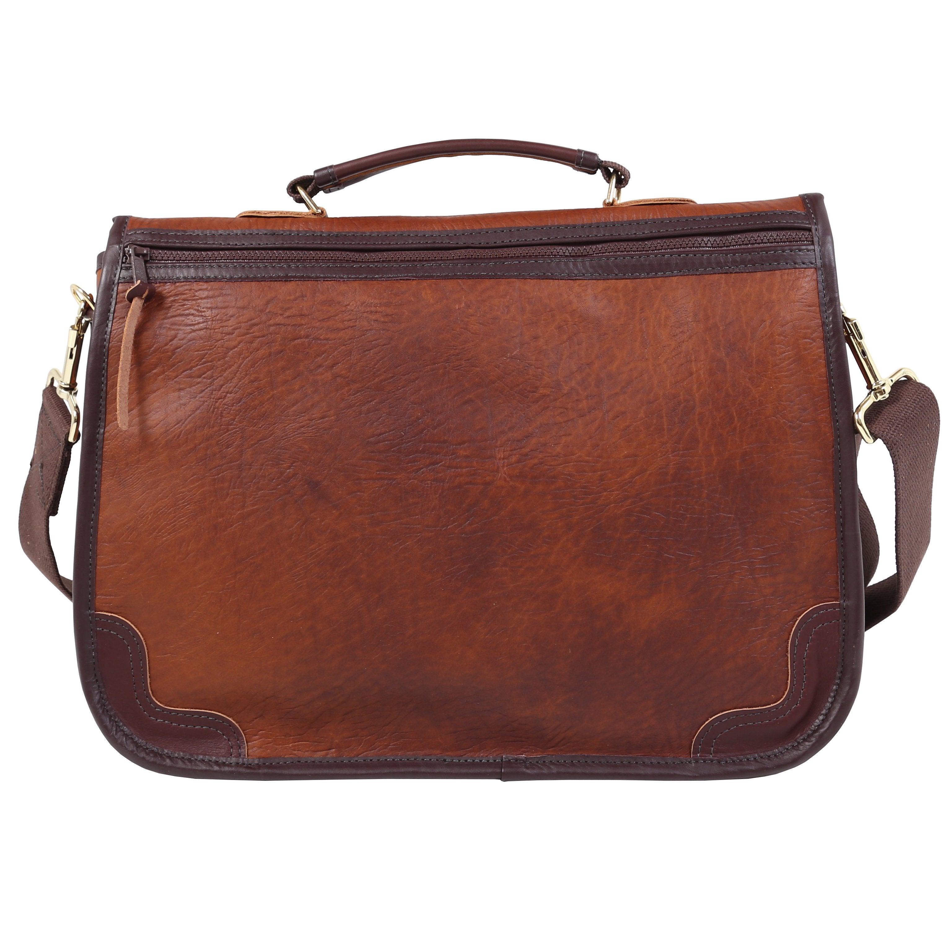 All American bison leather construction and premium full-grain leather trim. Two full-length interior pockets (one zippered). Plenty of space inside the main compartment for pens, a calculator, notebooks, business cards, etc. Feathers a leather grab handle as well as a detachable and adjustable cotton web shoulder strap with pad. Guaranteed for life. Made in the USA.
