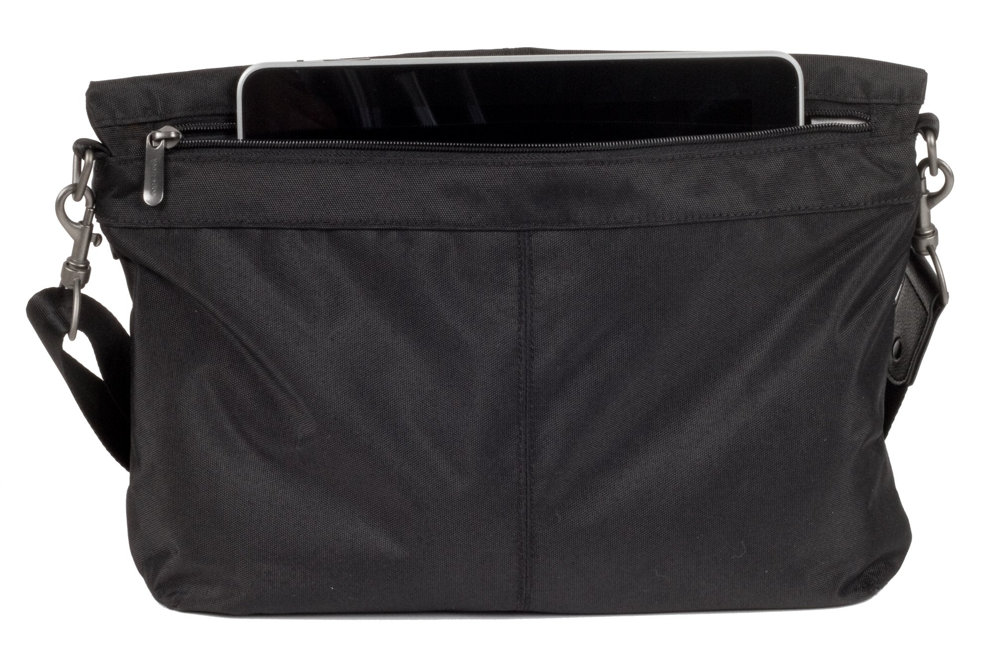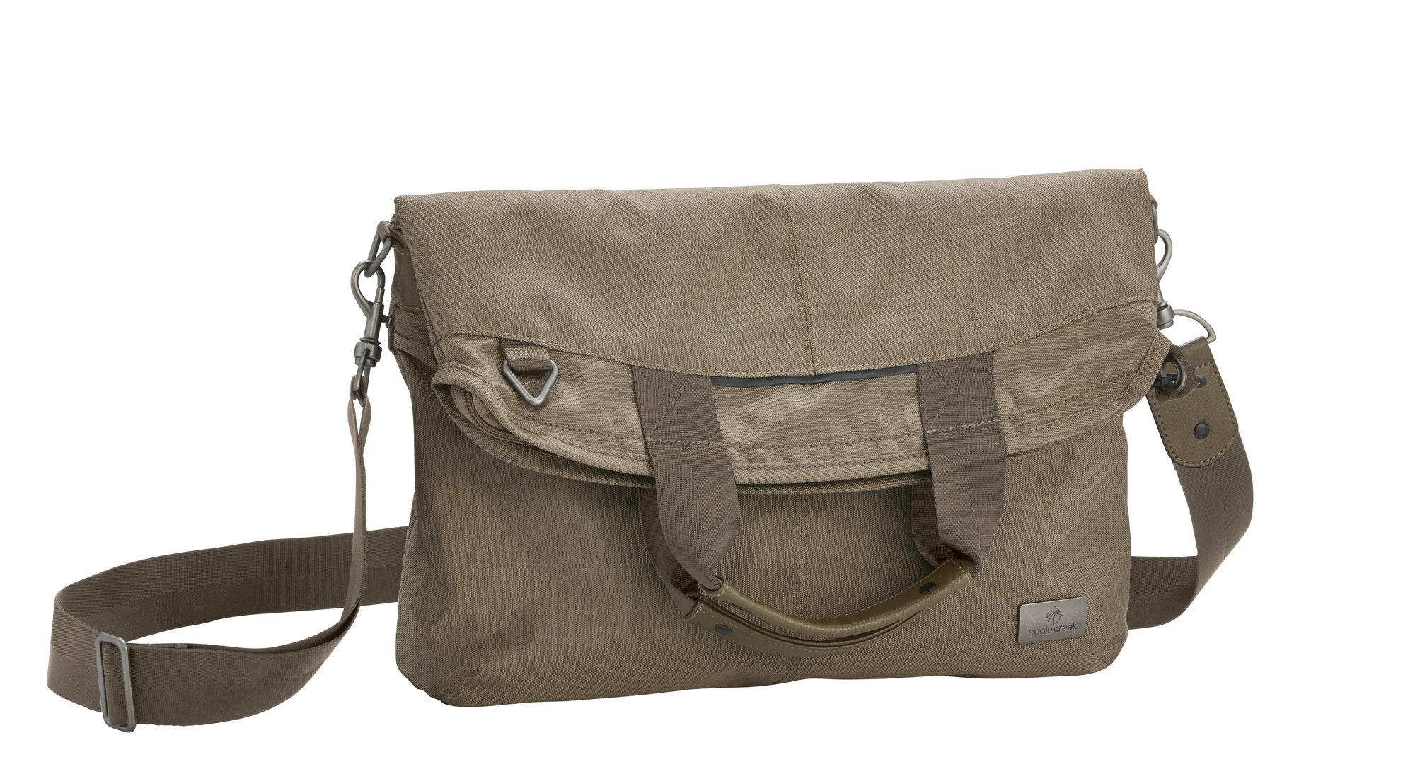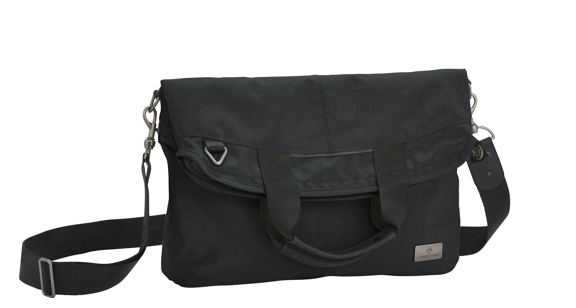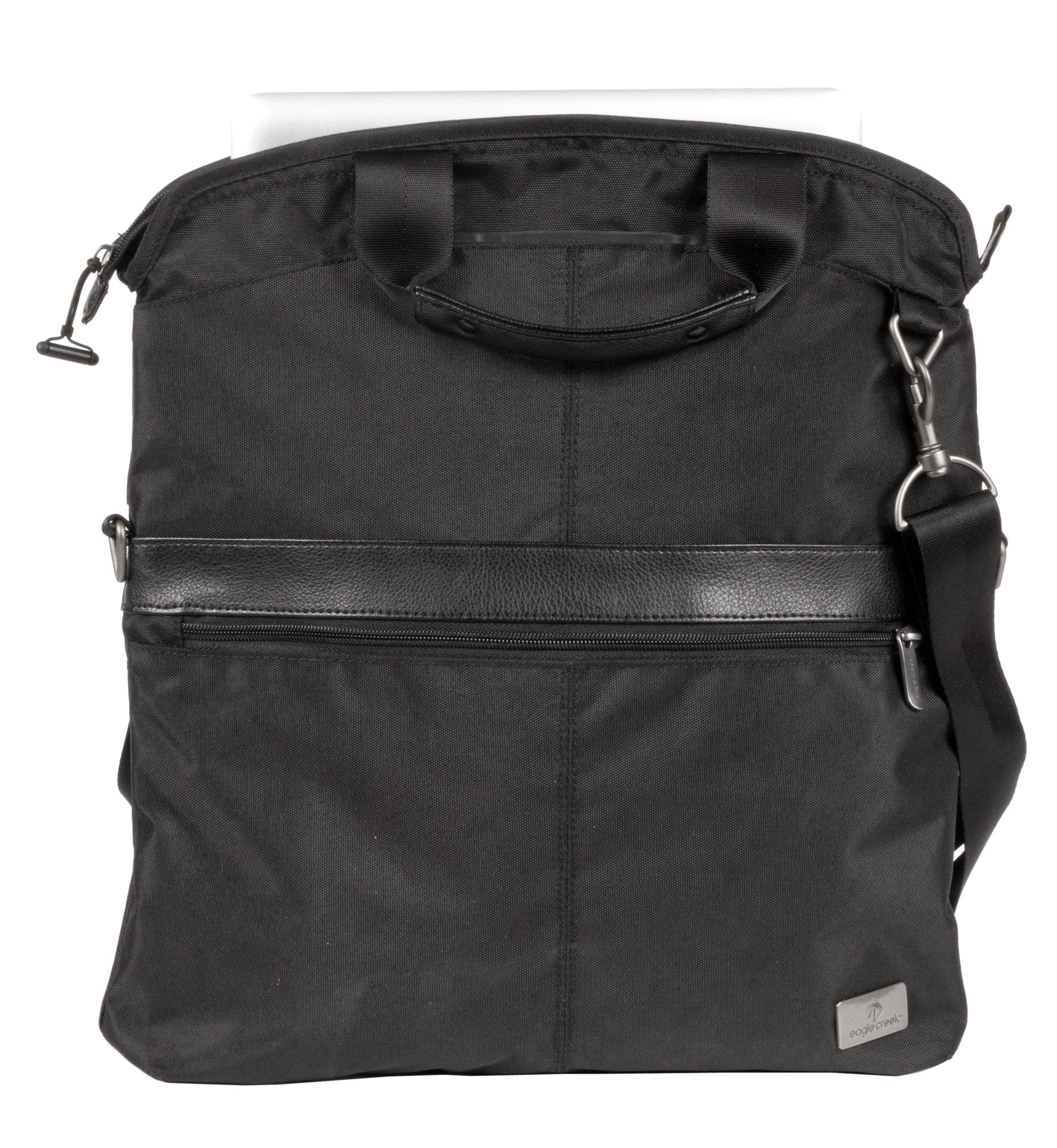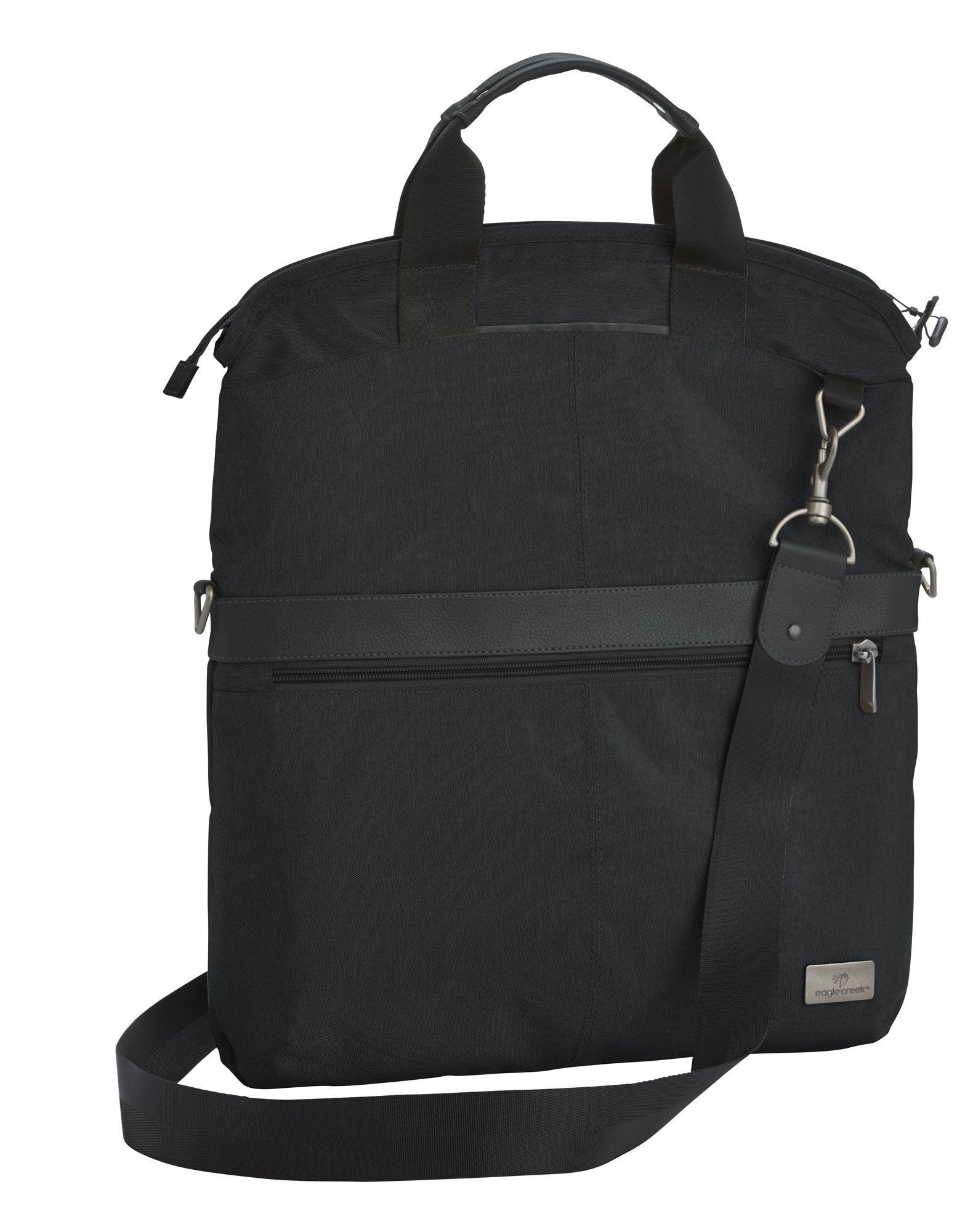 The latest in versatility. This tablet-compatible shoulder bag unfolds extending its silhouette to a vertical tote shape for a 15" laptop carry. Tote carry offers 125% more capacity capacity.