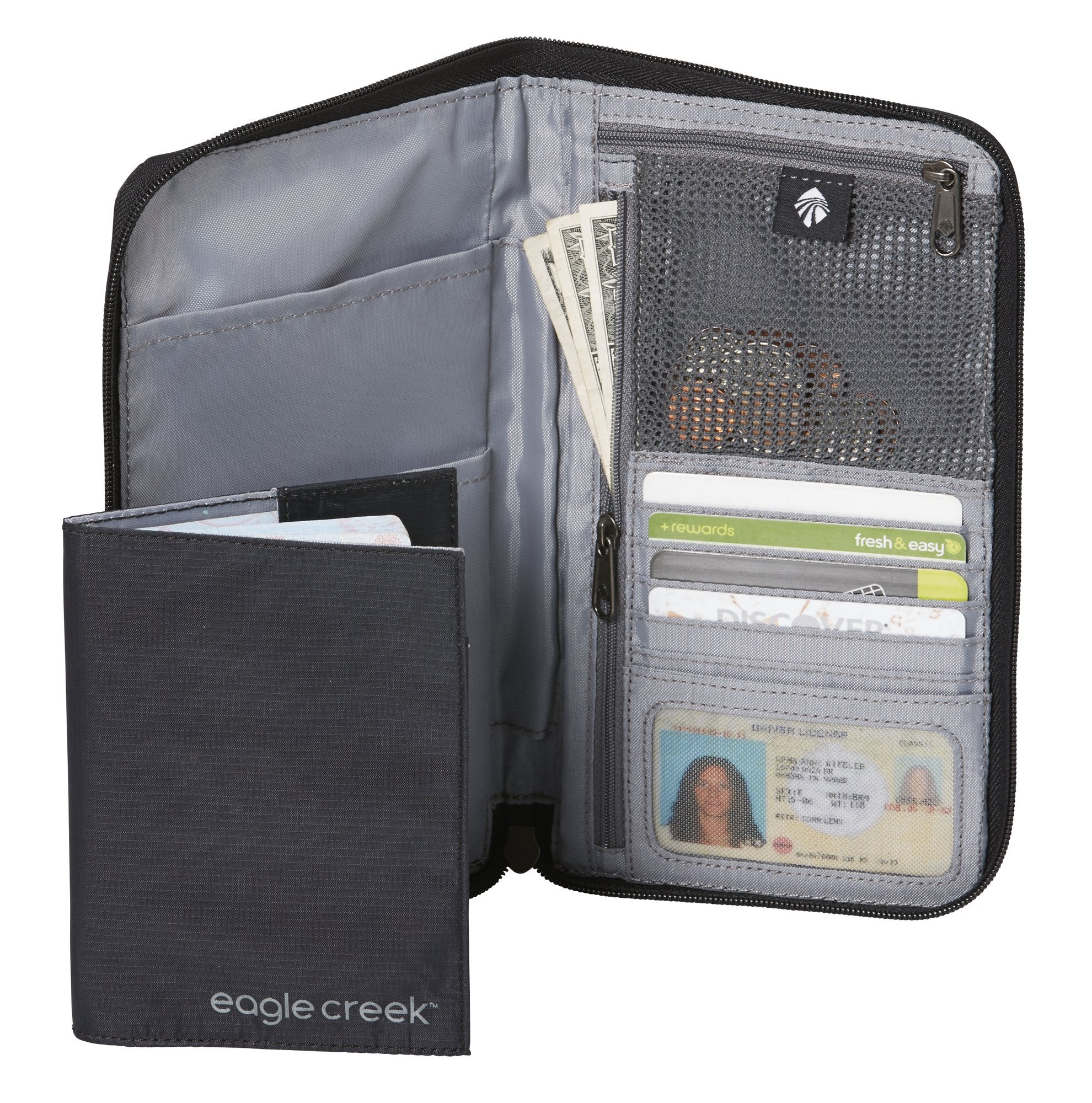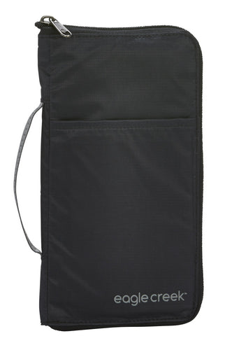 An ultra-light itinerary-sized zippered organizer for world travel; includes organization for Passport, credit cards, and currencies.