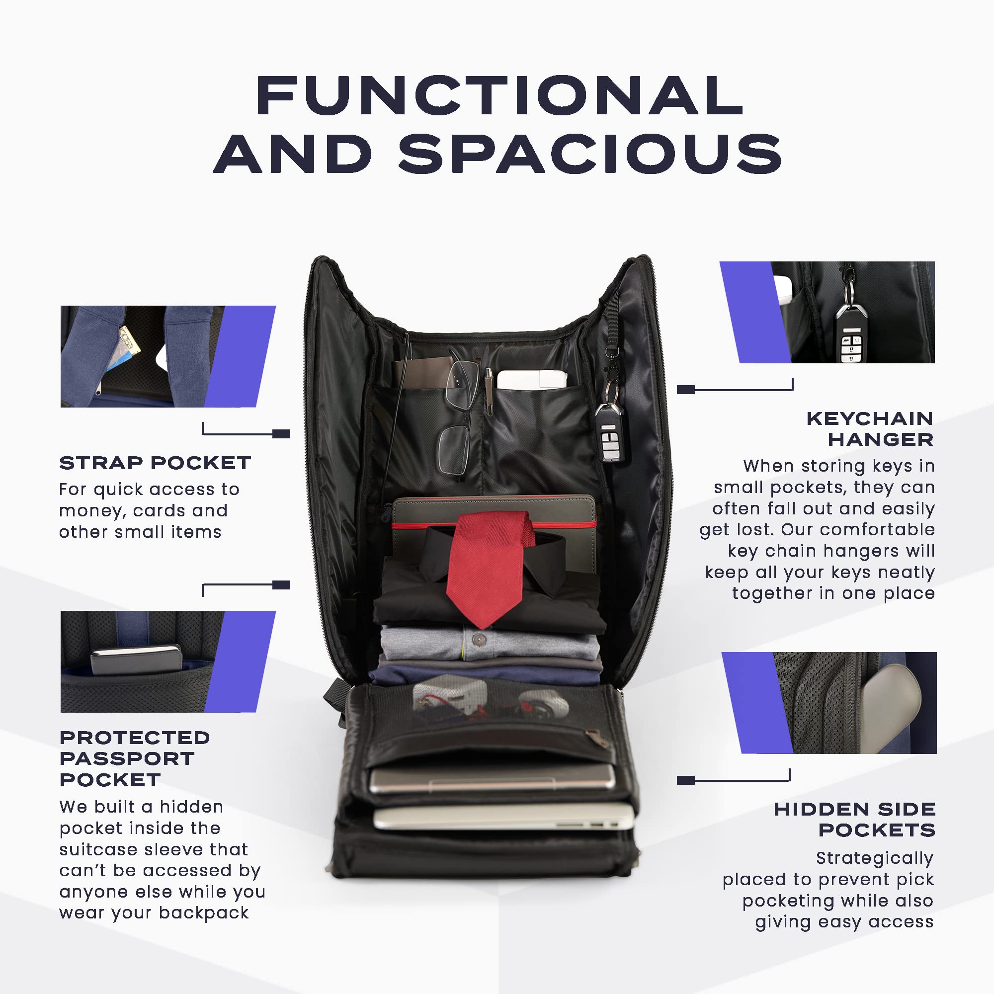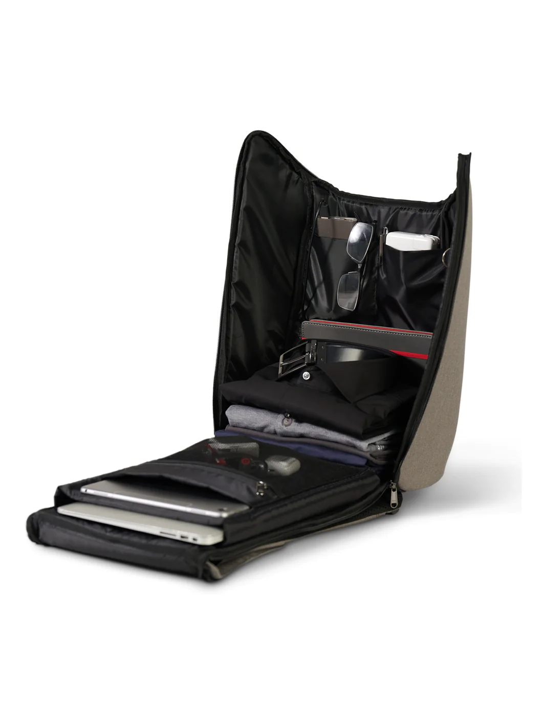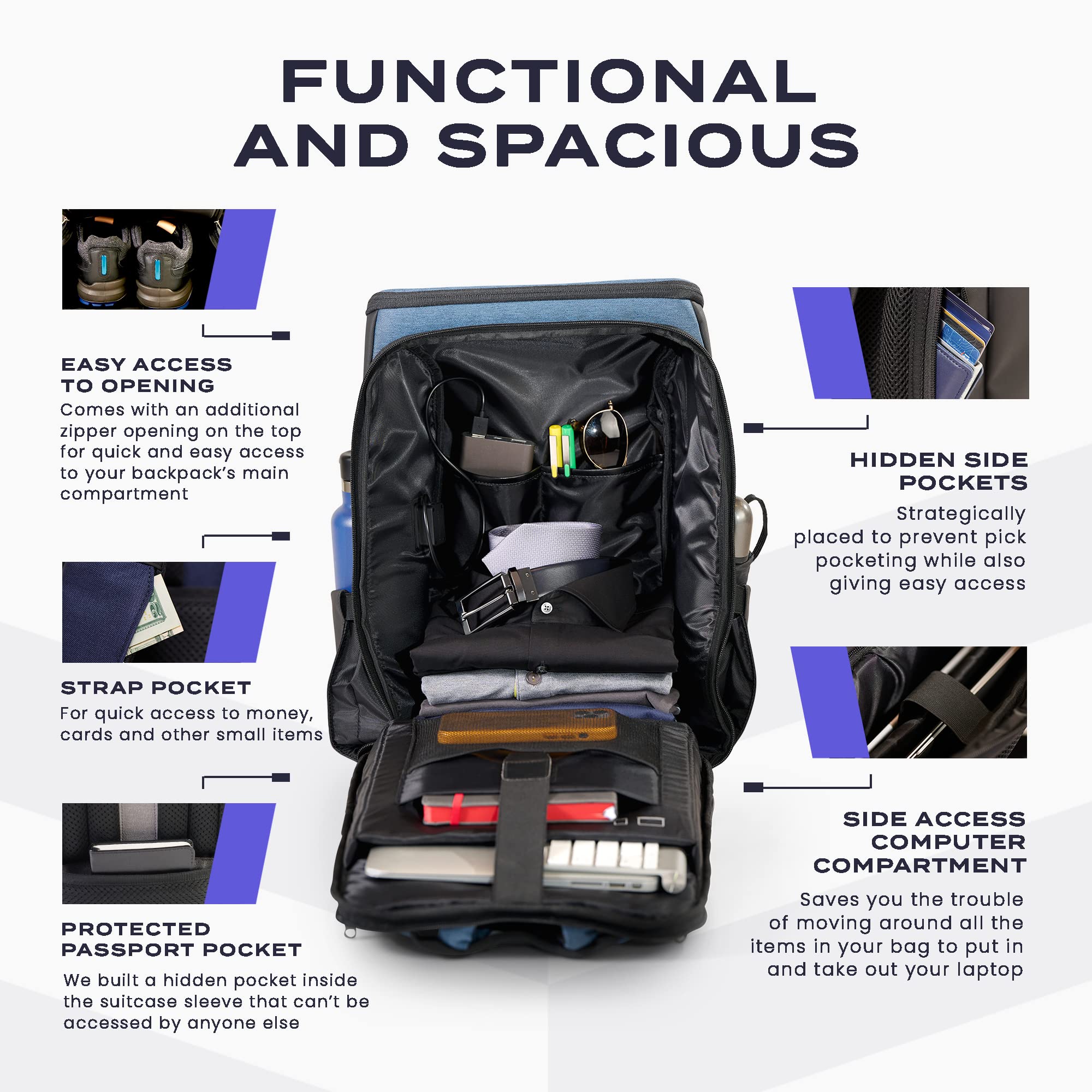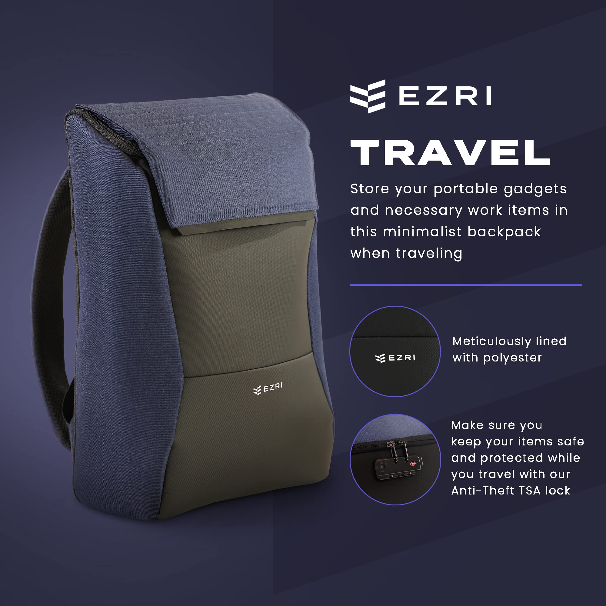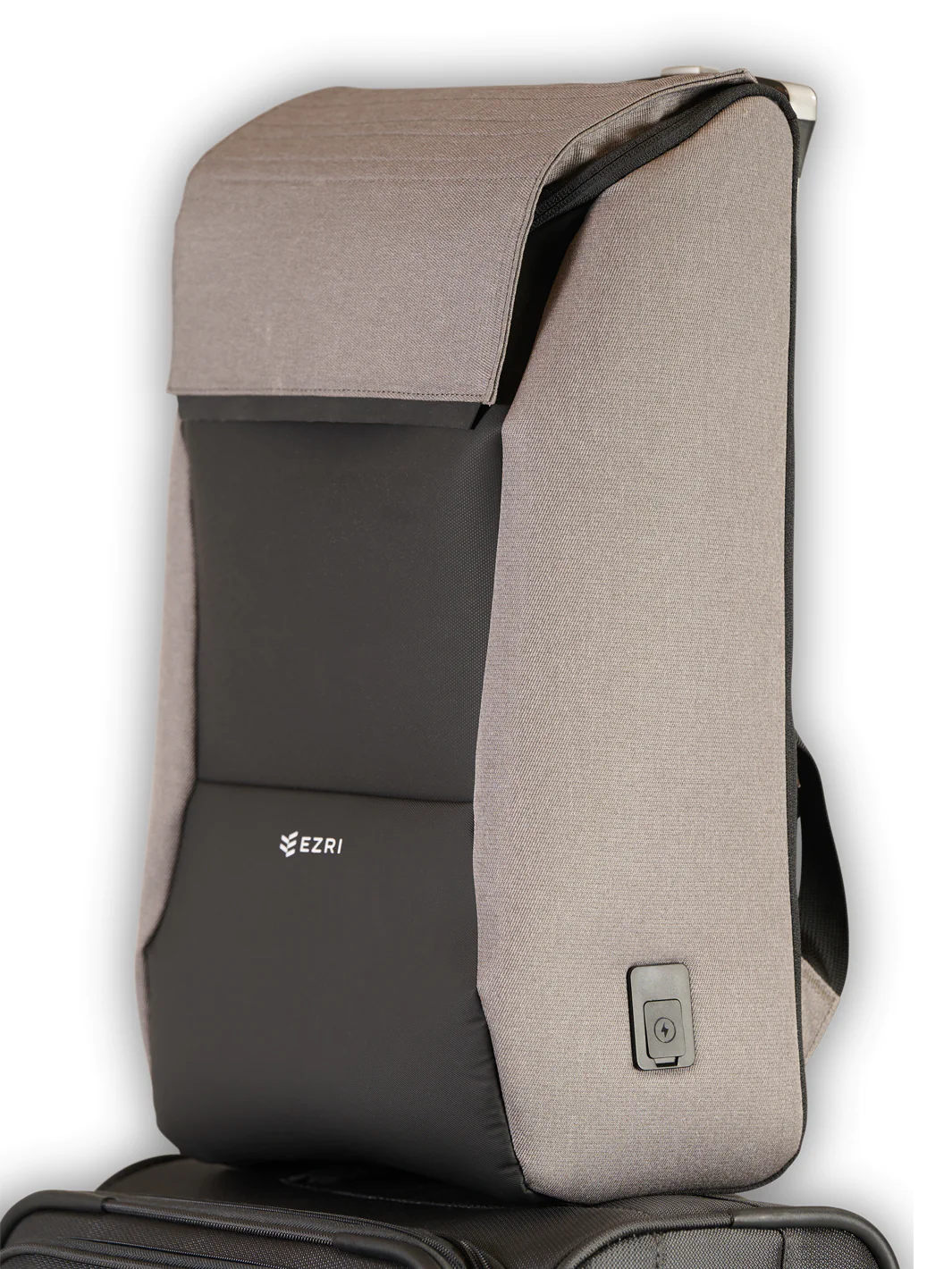 The EZRI Travel designer backpack was modeled as a one piece model that can open up completely and lay flat on the ground to make traveling packing easier than ever before. The waterproof laptop backpack's hidden and secure passport pocket, combined with its two easy access side pockets, makes traveling an easy and enjoyable experience. The EZRI Travel backpack will make packing and traveling a luxury, relaxing, and enjoyable experience.