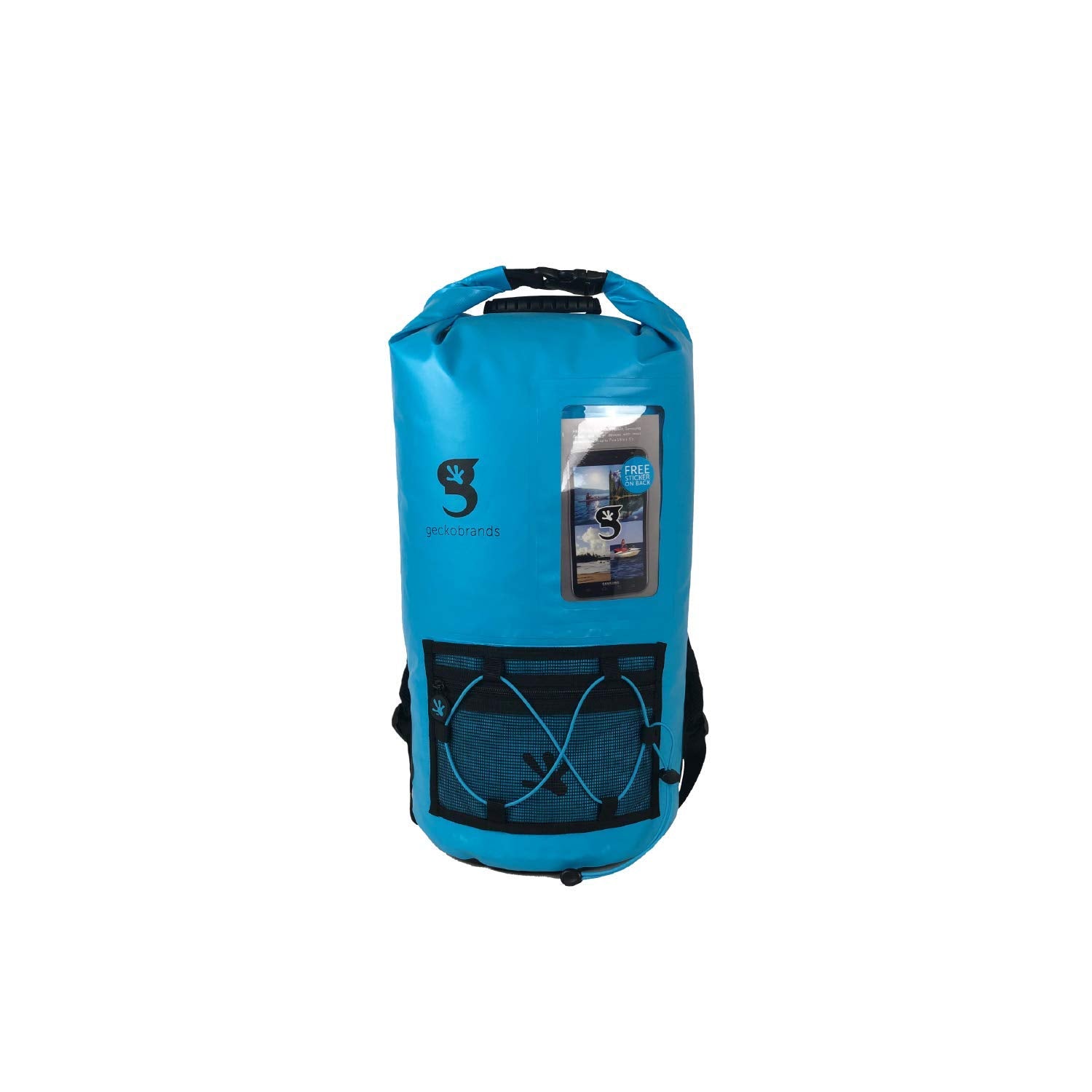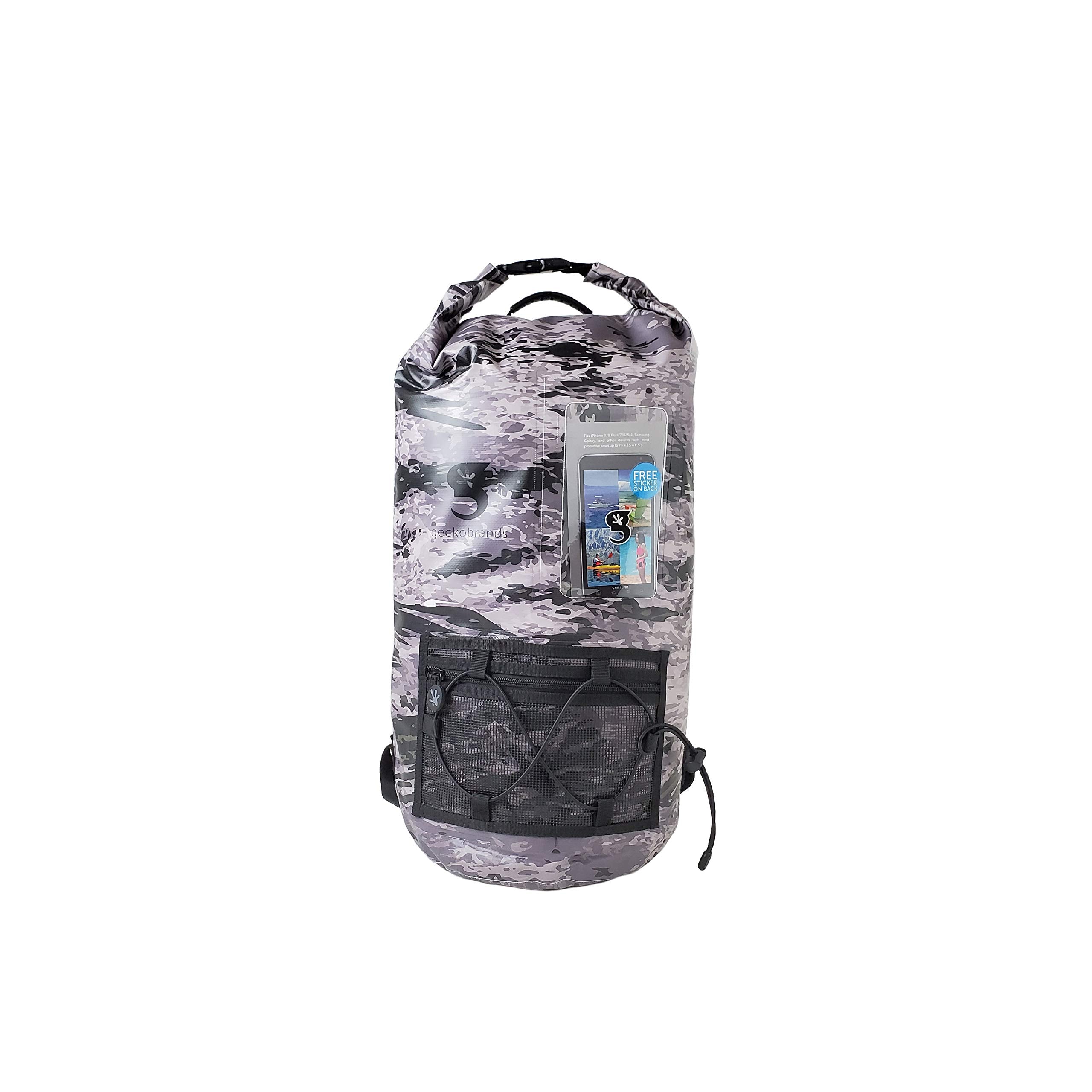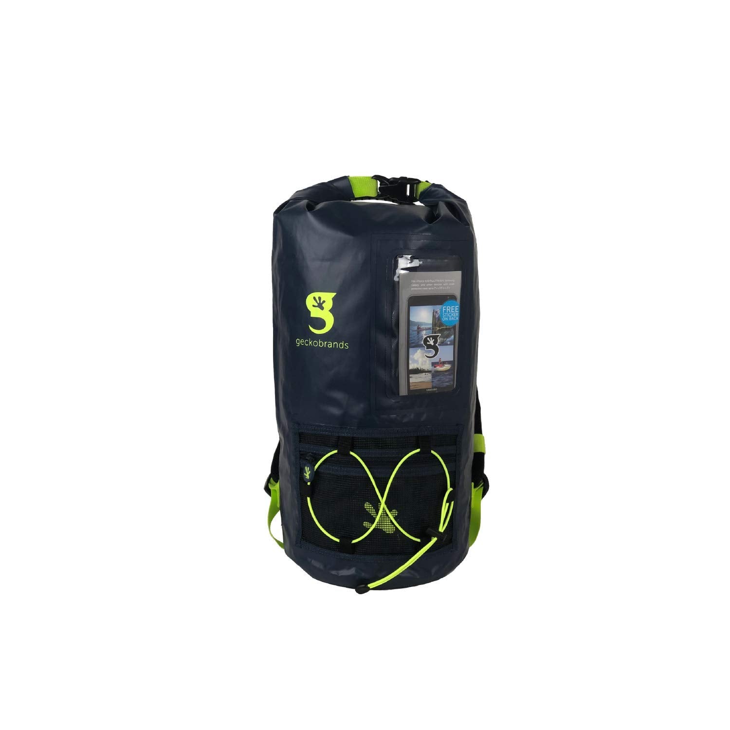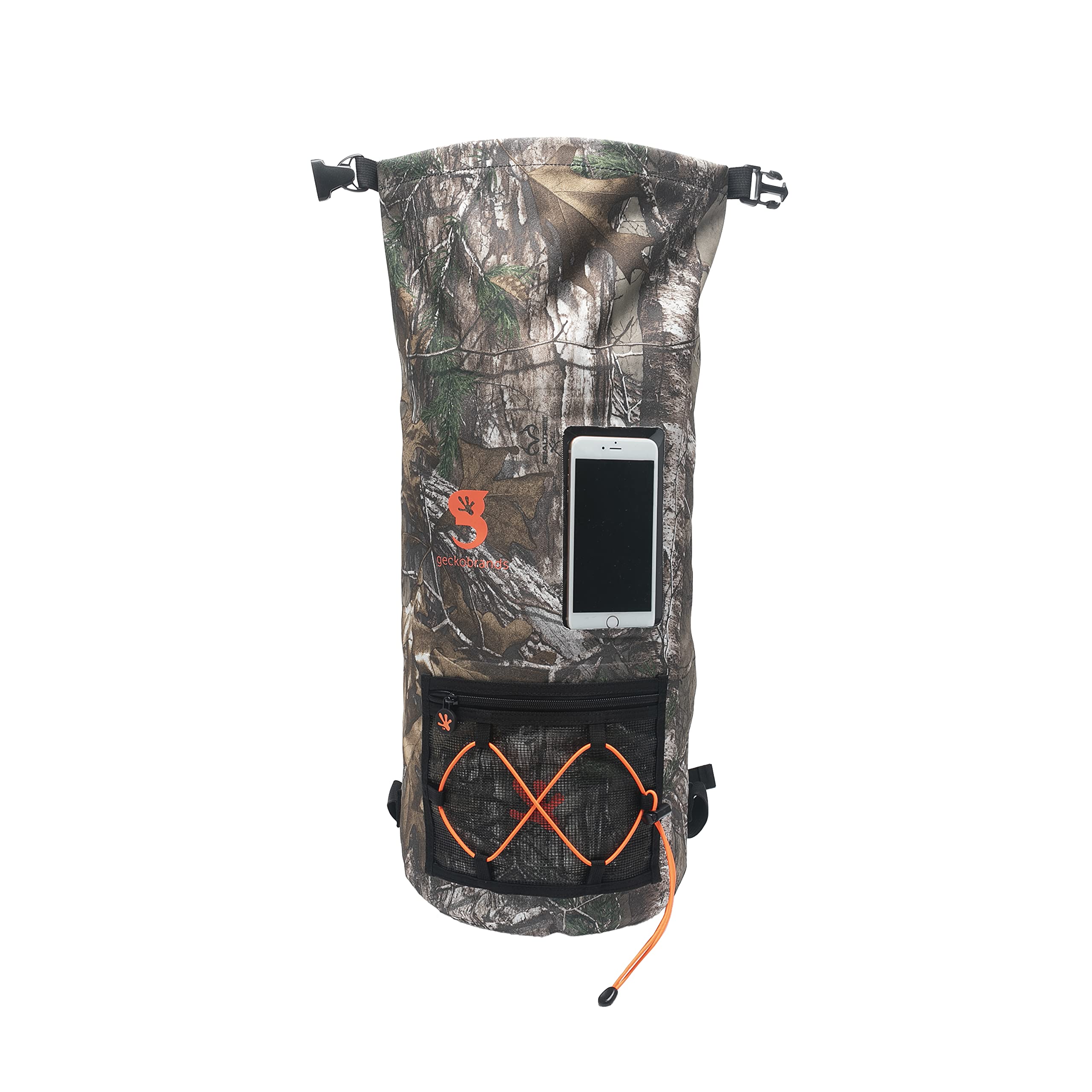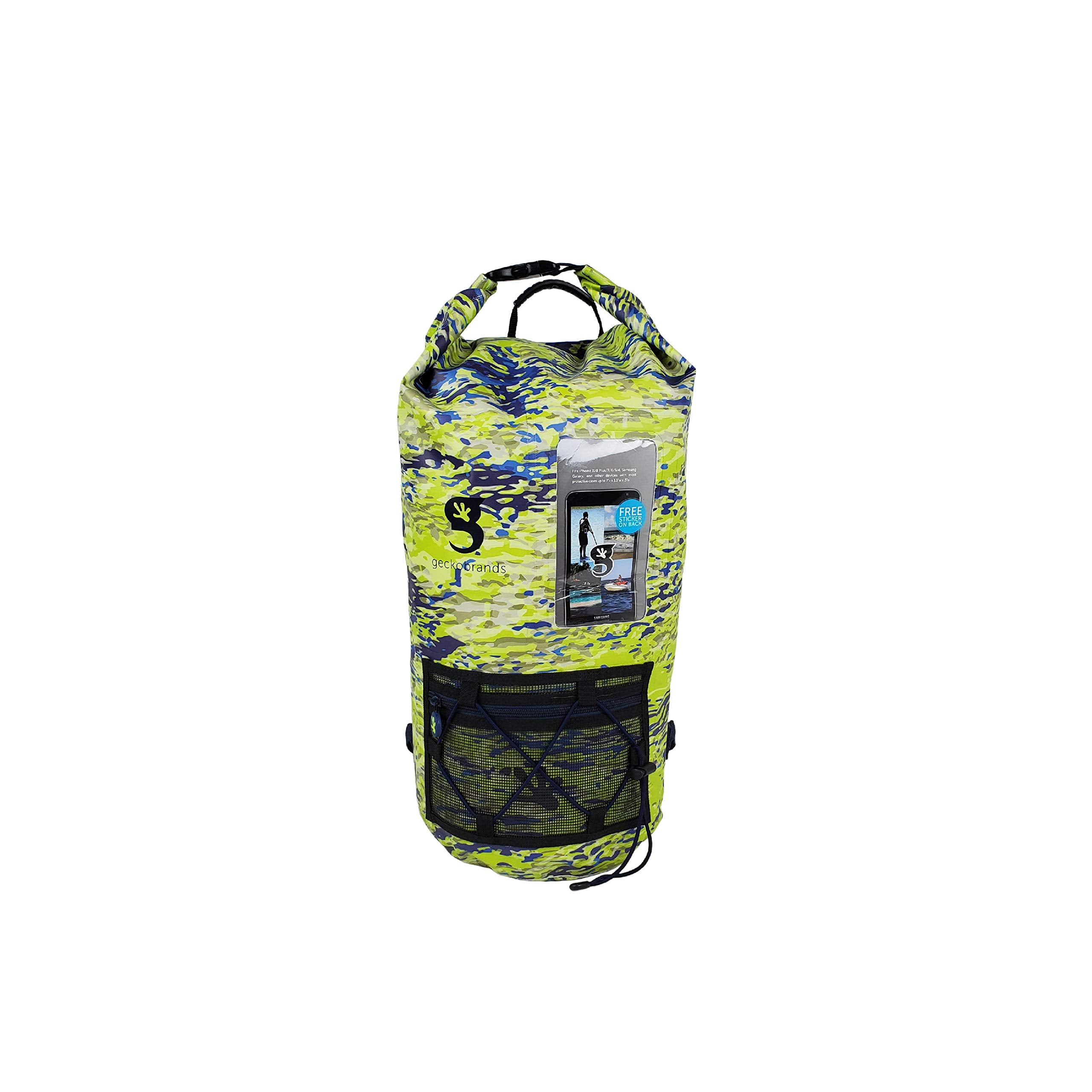 This backpack features a 20L capacity, durable pvc tarpaulin material and a sleeve to store and still use your phone. Have easy access to gear with the outside mesh zip pocket and bungee cords.
