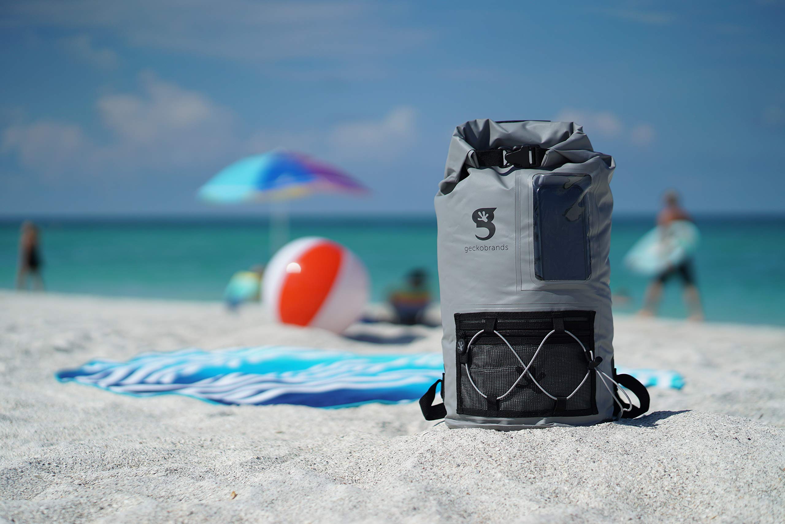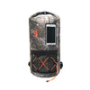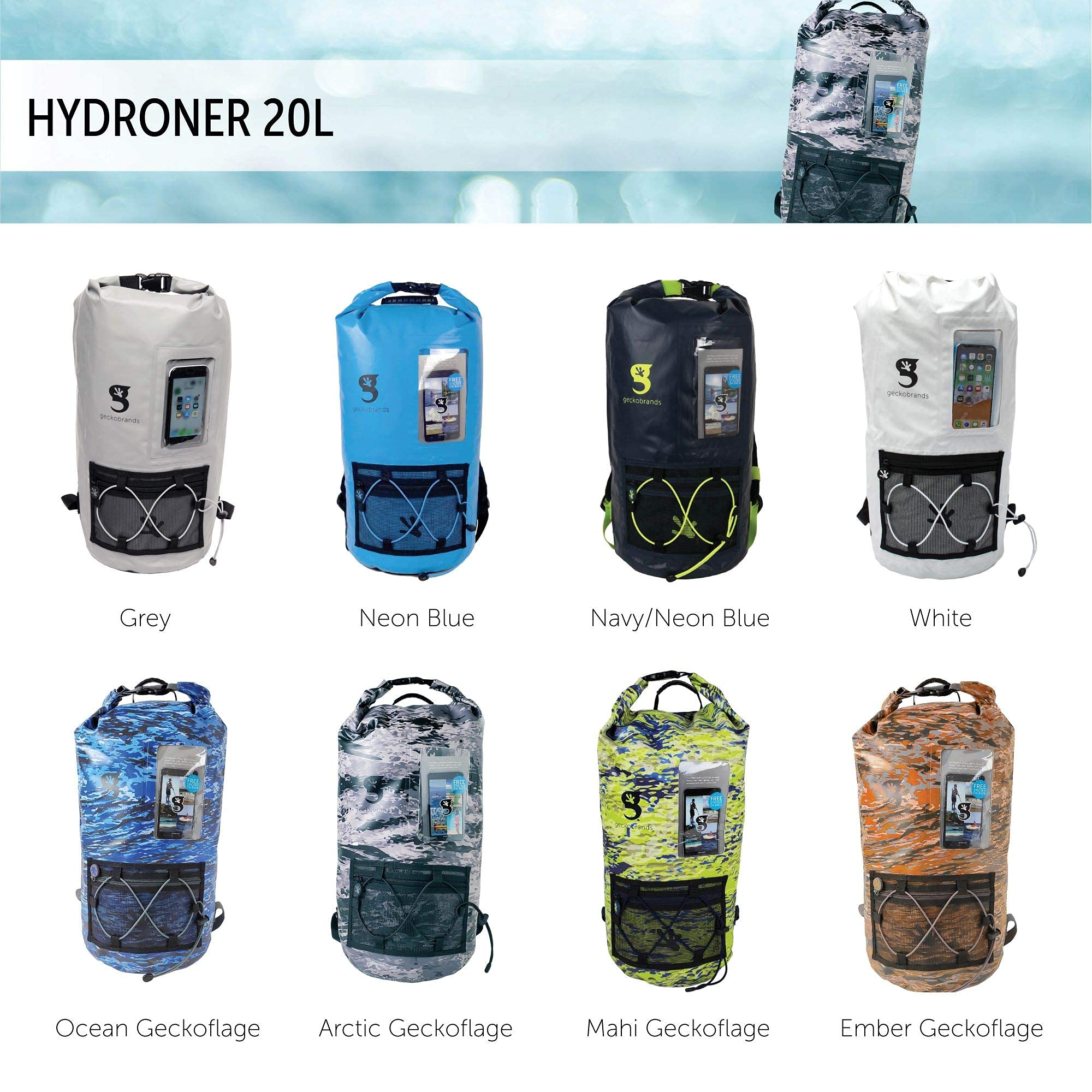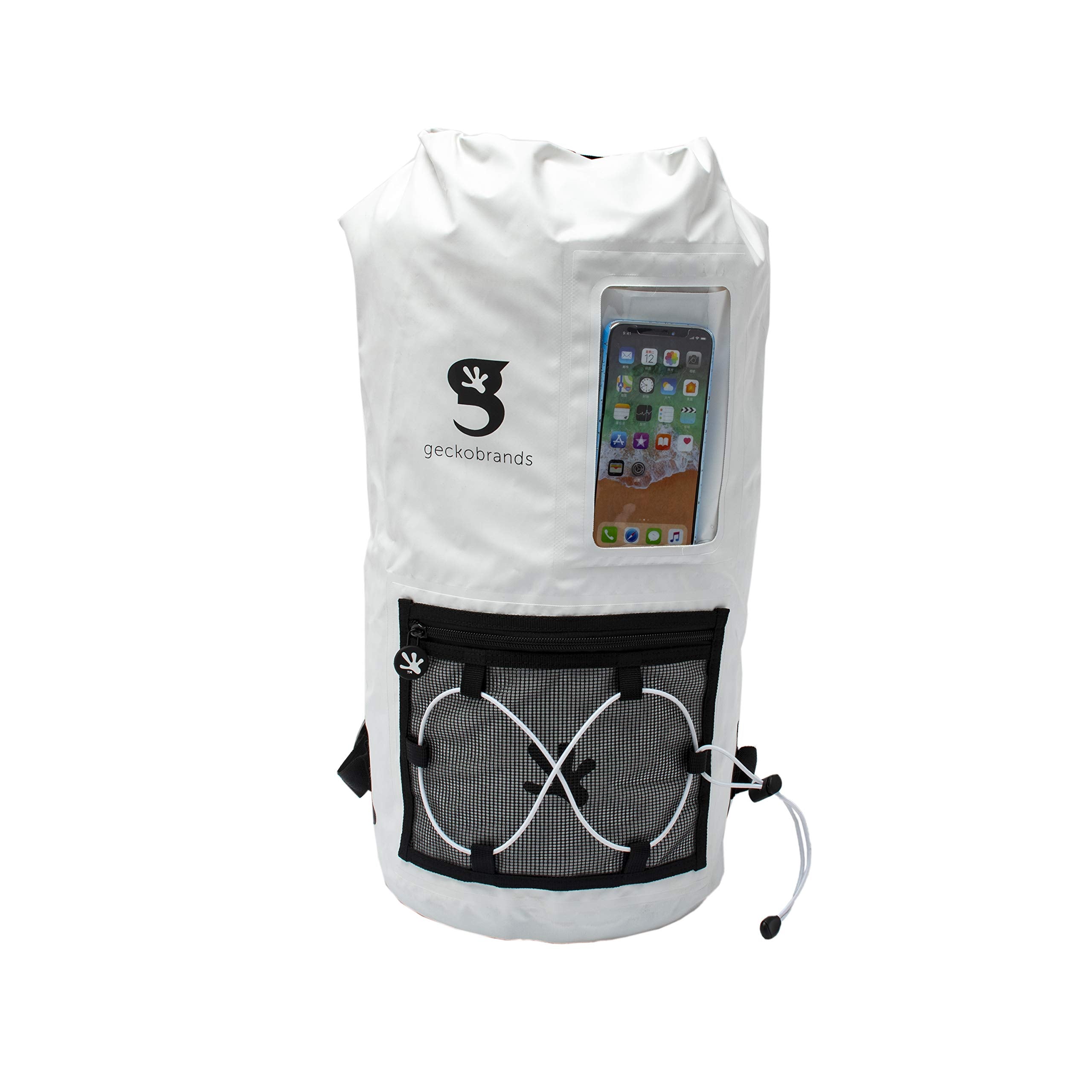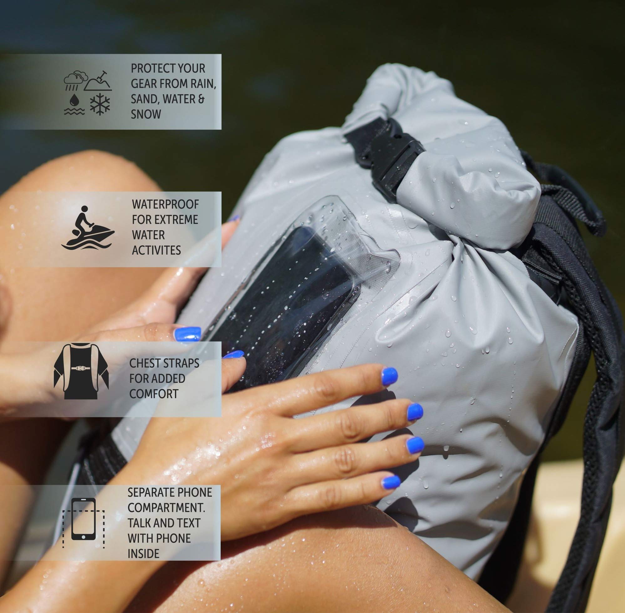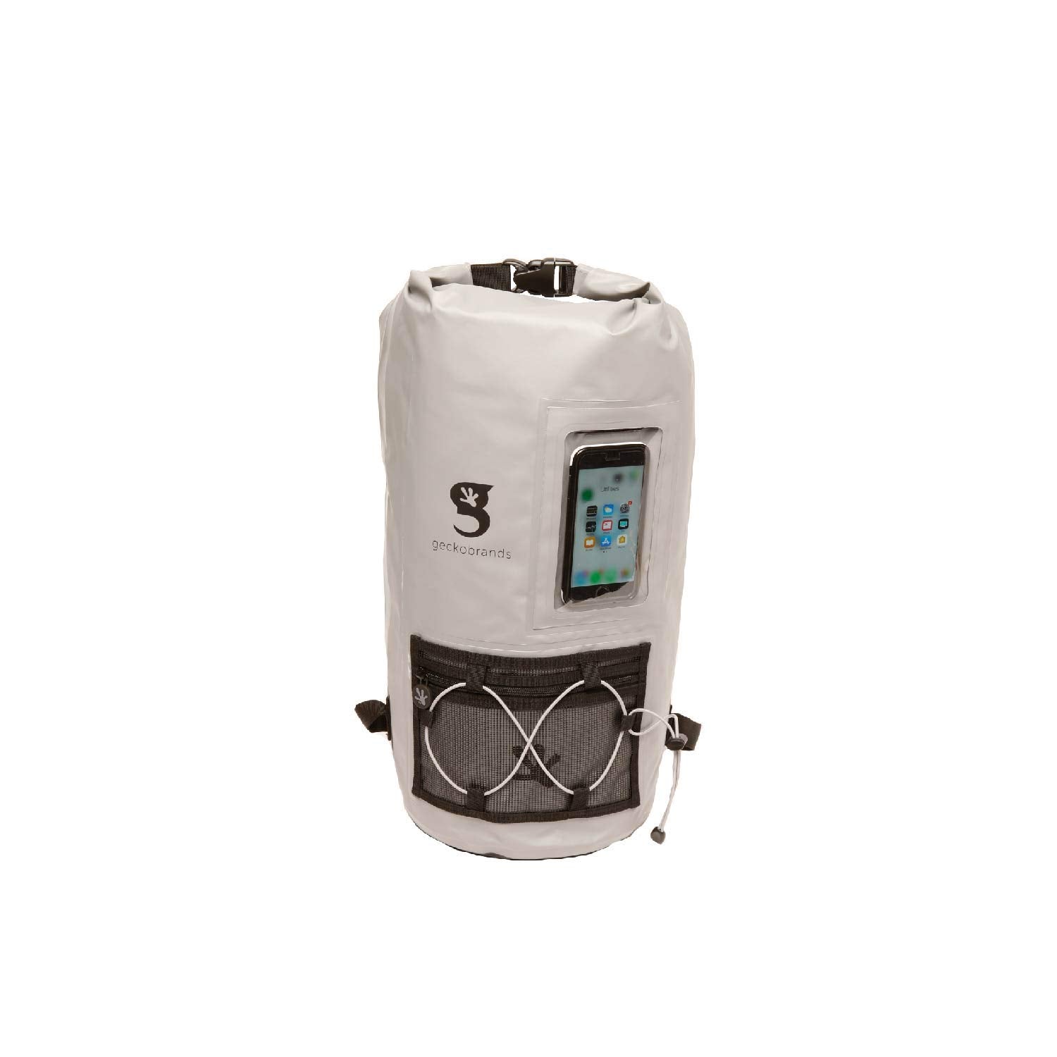 This backpack features a 20L capacity, durable pvc tarpaulin material and a sleeve to store and still use your phone. Have easy access to gear with the outside mesh zip pocket and bungee cords.