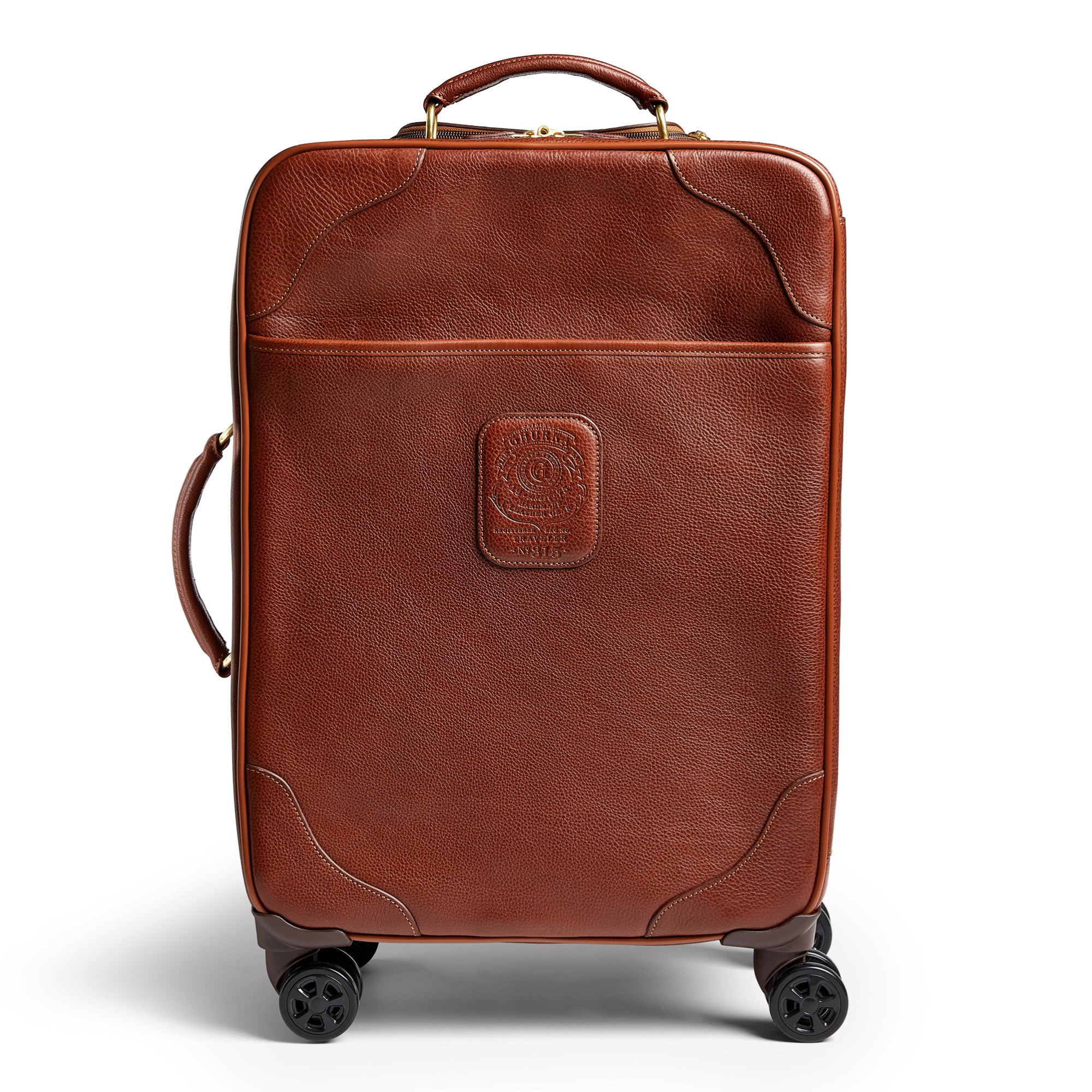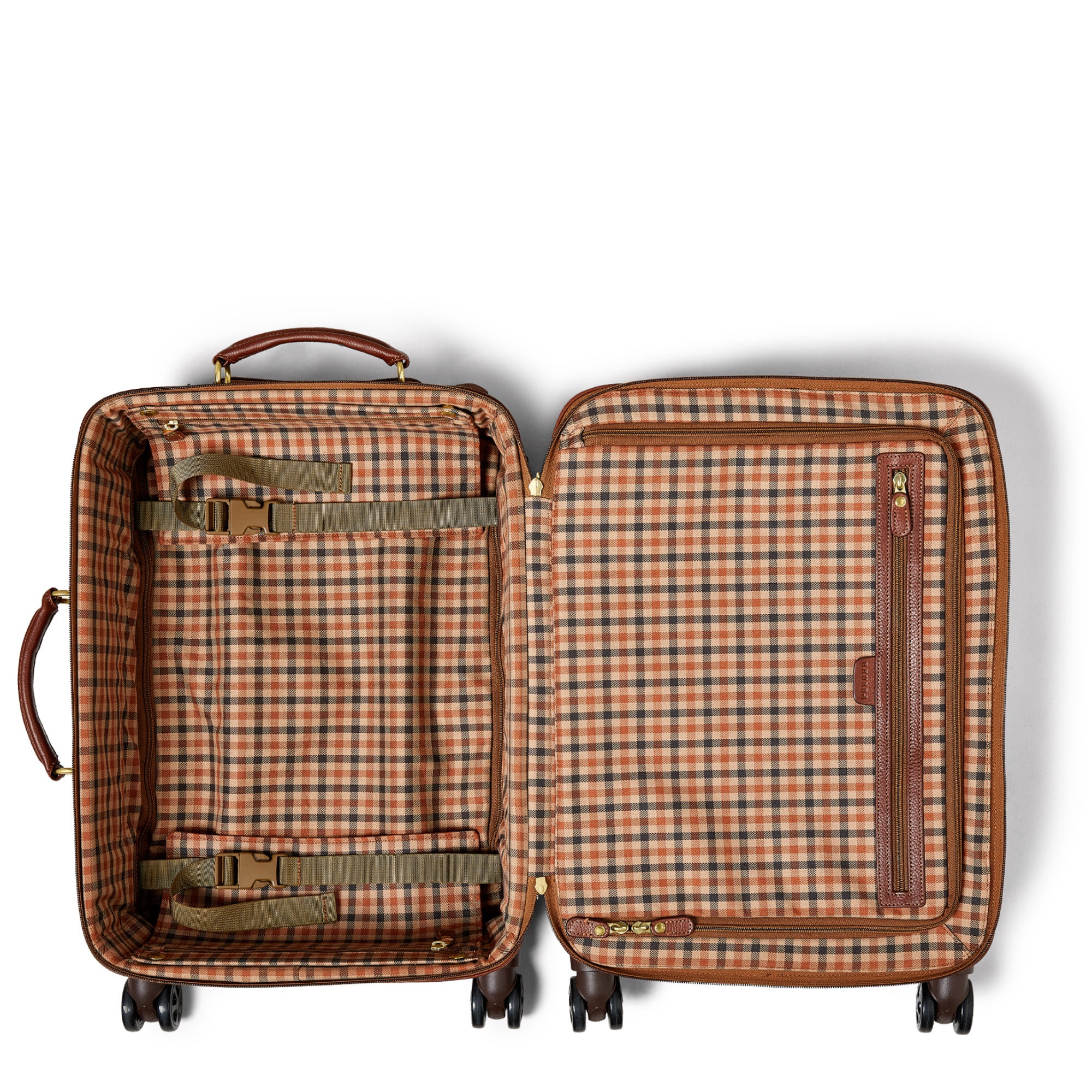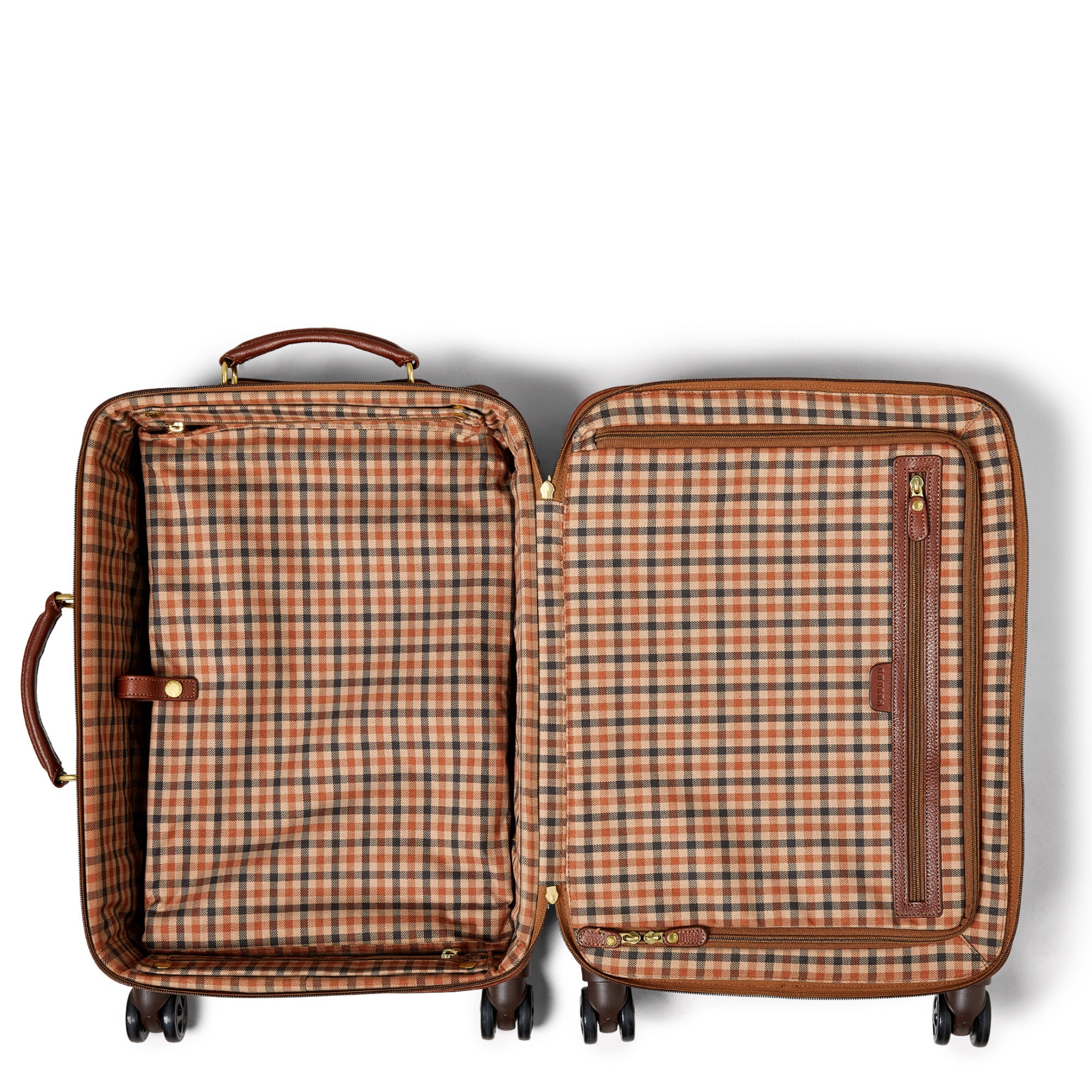 The Traveler No. 315 is a refined 4-wheel carry-on designed for seamless travel. Crafted from our signature Vintage leather and lined with Ghurka Check cotton twill, it features multiple interior zip pockets for organized packing. With smooth-rolling wheels and brass hardware, its the perfect companion for sophisticated journeys.