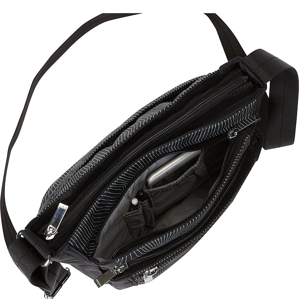 • Three exterior front zip pockets. Exterior slip pocket. Signature logo embossed detail in front. Flat bottom. Included removable wristlet. Lined interior. Interior zip pocket. Measurements: Bottom Width: 10 in Depth: 3 12 in Height: 10 12 in Strap Length: 56 in Strap Drop: 27 in Weight: 12 oz