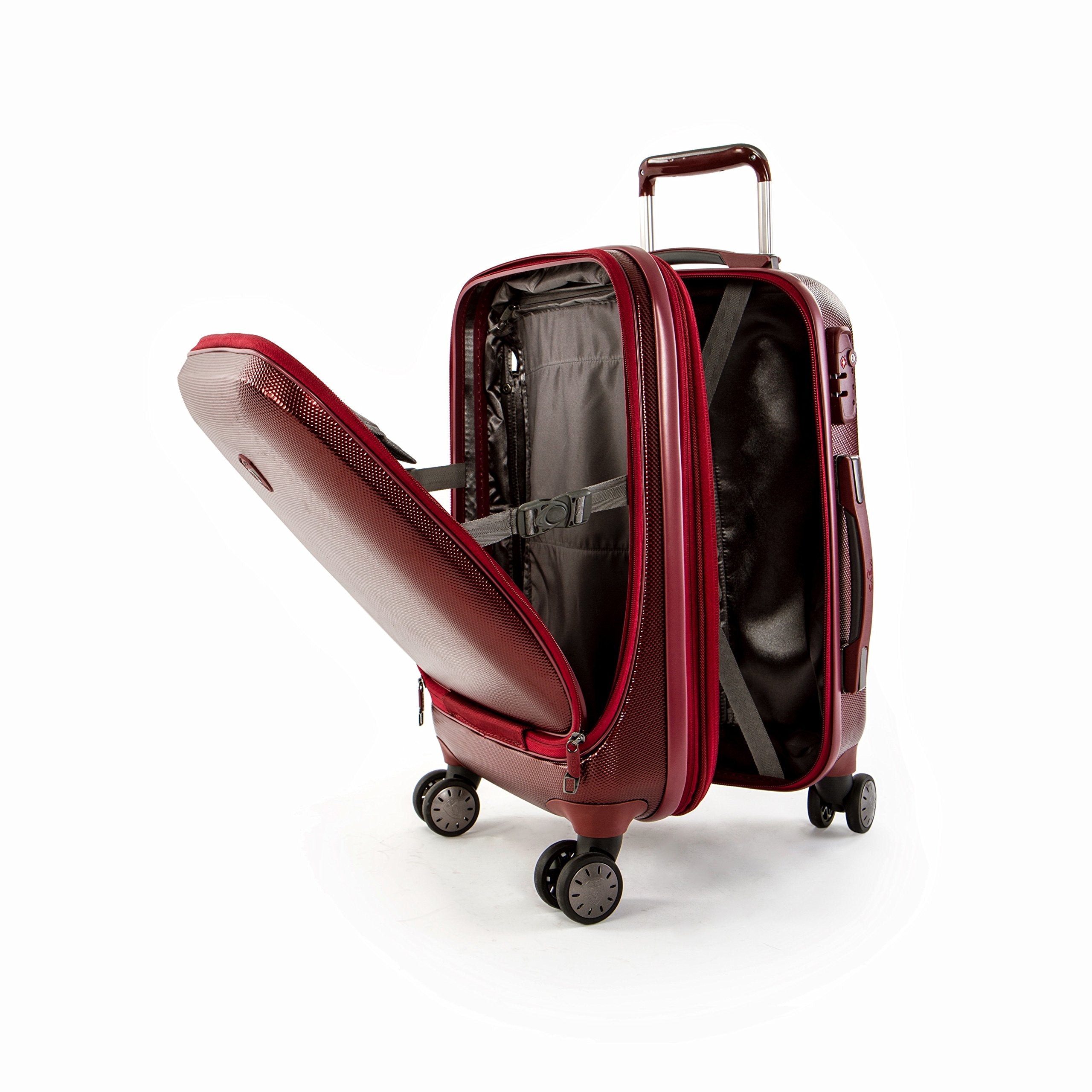 This carry-on size features a foam-padded laptop pocket that is conveniently located on the front of the luggage. This pocket will fit up to 15.6" widescreen laptops. The front access system will especially make it very easy to access your belongings while the carry-on is in the upright position. The high-quality satin lined interior features a buckled compression strap, as well as a removable divider with zippered pockets. These interior features will help keep you organized and ensure that your items stay in pristine condition while travelling. Each piece comes with a built in three-digit combination TSA lock. These locks only allow certified TSA officials to open, inspect and re-lock your luggage if necessary. Its Four Wheel Spinner system spreads the weight evenly for effortless gliding in different terrains. It has a push-button telescopic handle system with multi-stage locking heights. It comes with a zippered expansion system allowing for an extra 20% in packing capacity. The combination of the SmartLuggage system, spinner wheels, a lightweight telescopic handle system, water-resistant zippers, and multi-riveted top and side handles comprises one of our most durable luggage designs.