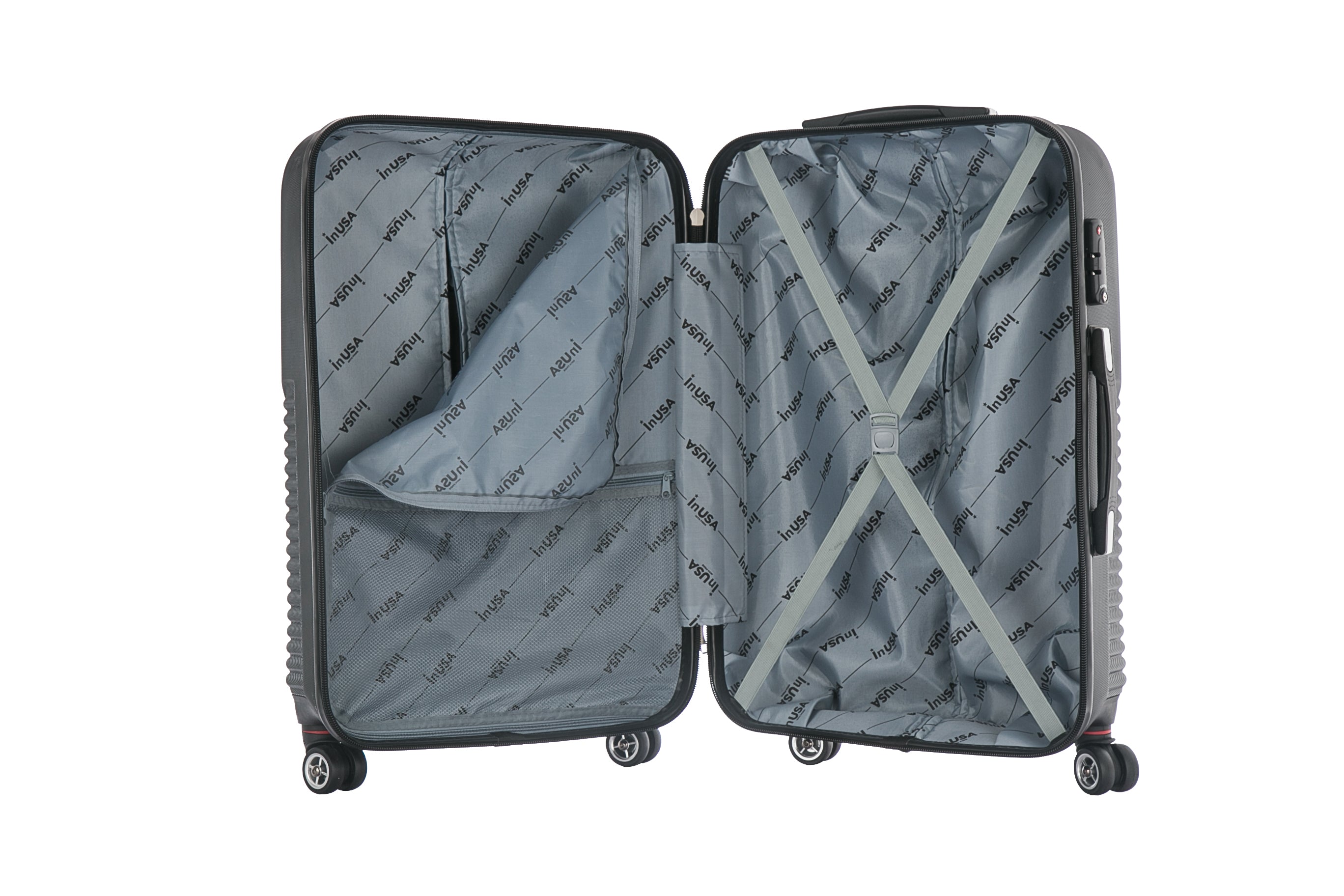 The InUSA Chicago collection is proudly assembled in the USA from imported parts using lightweight ABS/PC engineered material with micro diamond finish. Functional style with 4 airplane design dual spinner multi-directional silent 360 degree wheels for effortless mobility. The sturdy construction offers maximum strength, durability and a water/scratch resistant finish. Full interior fabric lining with a zippered compartment on one side, opposite side offers elastic tie-down straps for additional support and an inside pocket. A side mounted 3 digit TSA approved combination lock, push button locking internal retractable trolley system. The small size offers a Top ergonomic GEL handle. The medium and large size offers Top and Side ergonomic GEL handles for comfortable and easy lifting. Smooth running quality oversized number 10 Zipper. Four side studs allows each piece to stand upright on its side. The expandable feature allows for an additional 25% extra space offered in the Large size piece. This product can be purchased in different colors.