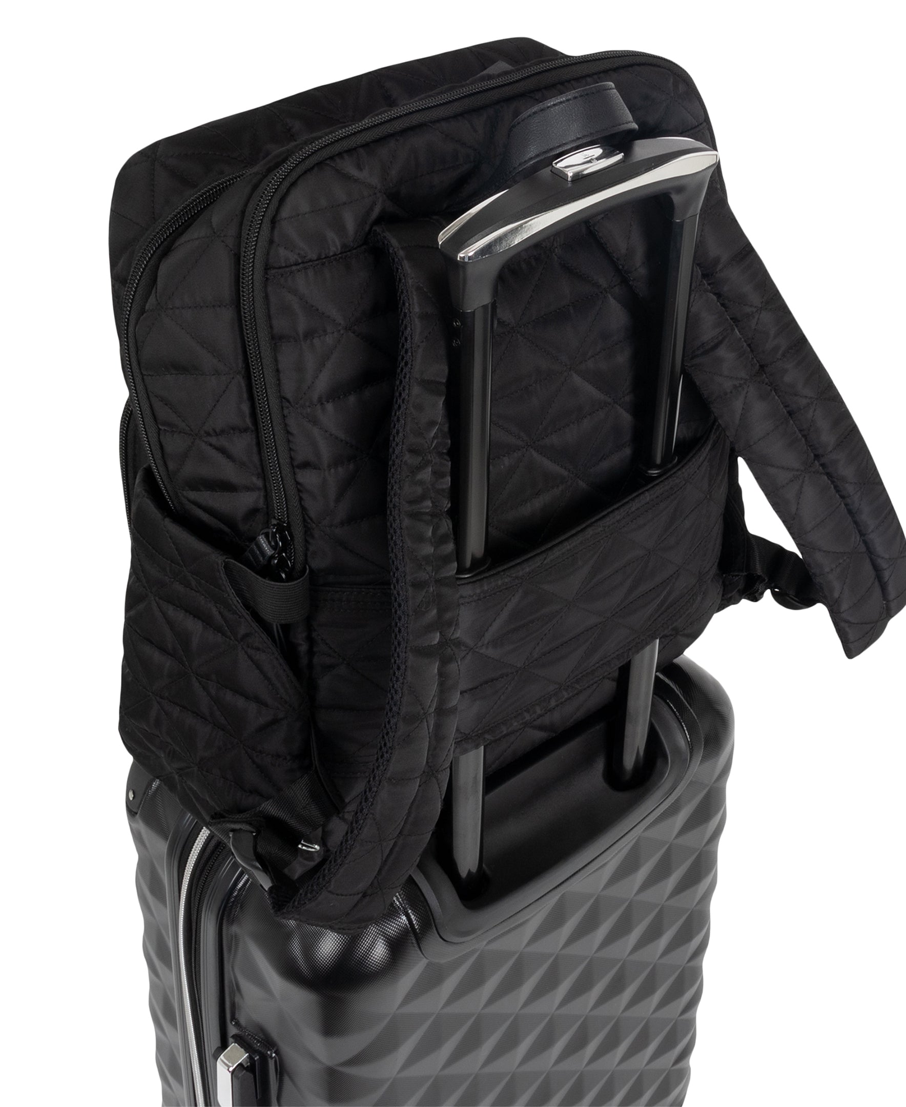 Designed for the trendy, modern business women whom value both style and function, this 2-piece set from the Kenneth Cole Reaction Diamond Tower collection features a 20 carry-on suitcase and a travel laptop backpack. Luggage features multi-directional 8-wheel spinners that allow smooth, 360-degree movement over any rough surface for complete mobility free-weight rolling. Lightweight construction helps you adhere to airline weight restrictions to avoid unneeded airport fees. Expands an additional 2-inches for greater carrying capacity when needed. Both bags feature a stylish diamond-patterned exterior and fully lined tear-resistant interior. Main interior compartment of luggage features side zipper pockets, secure garment restraints to hold belongings, and interior lid section with a full-length mesh zipper pocket for double sided packing. Luggage features a sturdy, locking retractable push-button telescopic trolley handle that extends 41 inches and is conductive for simple, one-handed use. Backpack features a separate rear padded computer compartment that fits most laptops up to 15-Inch screen. Roomy, main compartment includes a smaller padded laptop/tablet pocket and 2 open top accessory pockets. Front exterior of backpack features a zipper pocket for easy access to frequently needed items and zip around pocket with an extensive business organizer. Rear exterior features padded shoulder straps for maximum comfort while on the move. Both the suitcase and backpack features premium self-repairing coil zippers meant for long lasting use. The backpack exterior features dual side exterior open top beverage/holster pockets. Rear of backpack also features a trolley strap that fits over most luggage upright handles for hands-free carrying. 20 carry-on suitcase designed to meet U.S. based airline carry-on size requirements and fits into most airline overhead bin compartments. The perfect womens travel backpack and carry-on suitcase for mindful fashion forward commuters. 20 Exterior Luggage Dimensions: 22 H x 13 L x 9-10.5 D. 20 Interior Luggage Dimensions: 20 H x 12 L x 8.5- 10 D. Luggage Weight: 6.9 lbs. Backpack Overall Size: 15.5 H x 12.5 W x 6.5 D. Backpack Computer Dimensions: 15 H x 11 W x 1 D. Backpack Weight: 1.5 lbs. Backed by a manufacturers lifetime limited guarantee against defects and craftsmanship.