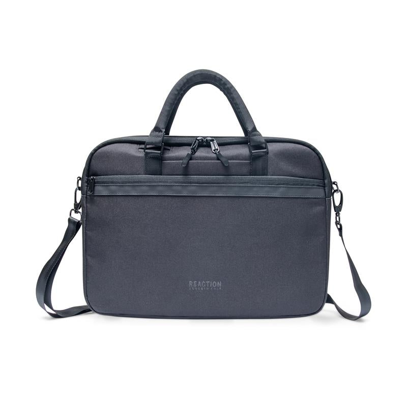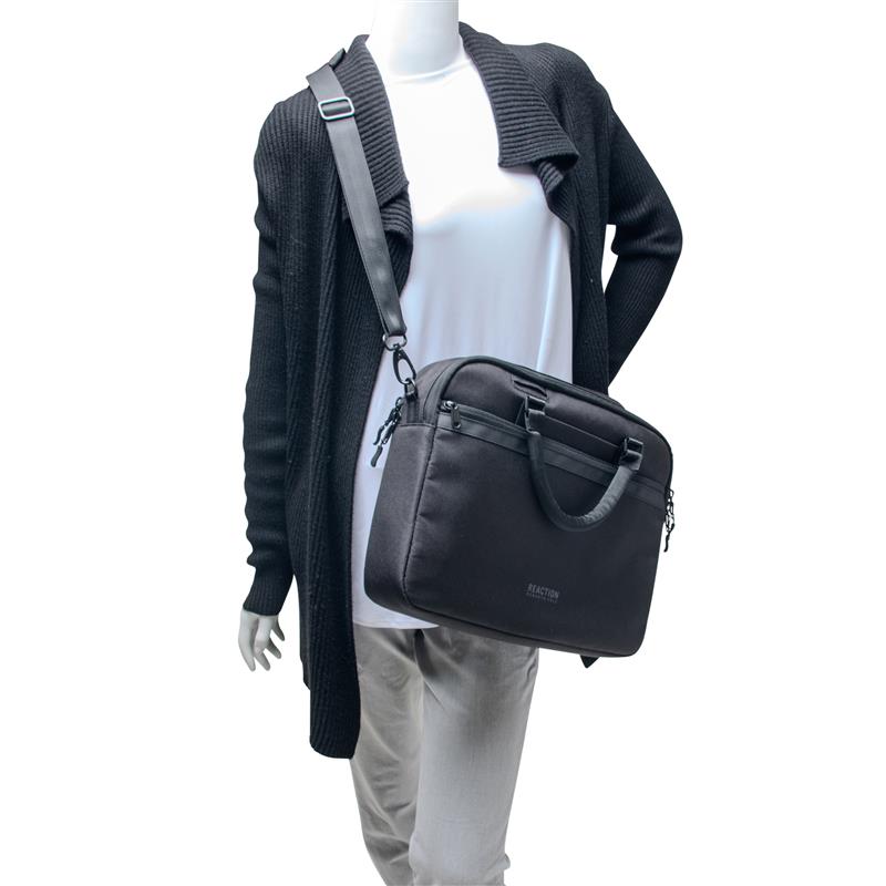 Simple yet stylish, This Kenneth Cole Reaction ProTec Polyester leather 16" Laptop portfolio briefcase bag features a savvy solution to carrying your important business materials. Features a Polyester exterior body material with a fully lined tear-resistant interior, which provides a durable way to carry your precious cargo. The front compartment is padded to accommodate a laptop and fits most laptops with up to a 16 screen and is compatible with most tablets. The front exterior includes a full-length zipper pocket and an open top slash pocket, great for small items you want to have on hand. The rear compartment features a zipper pocket, a two-file divider, and an organizer that includes a tablet pocket, a phone pocket, an open top accessory pocket, and pen loops. Self-repairing zippers designed for long lasting use also add a polished look to your professional bag. Features a removable, adjustable and padded shoulder strap extends 52 inches, and includes convenient top handles provide an alternative option for easier carrying. Features TECHNI-COLE RFID: Anti-theft radio frequency identification (RFID) blocking technology in organizer pockets lined with thin shielding fabric to help block radio waves from being transmitted from U. S. Passports and certain credit/debit cards. The rear exterior also includes a trolley strap to fit over most upright handle for hands-free carrying. Overall Size: 16 L x 12 H x 2.5 D. Computer compartment Dimensions: 15.75 L x 11.5 H x 1.5 D. Product Weight: 1.8 lbs. Backed by a manufacturer lifetime limited guarantee against defects. The perfect business savvy 16 laptop briefcase bag for travelers and professionals whom value both style and function.