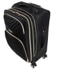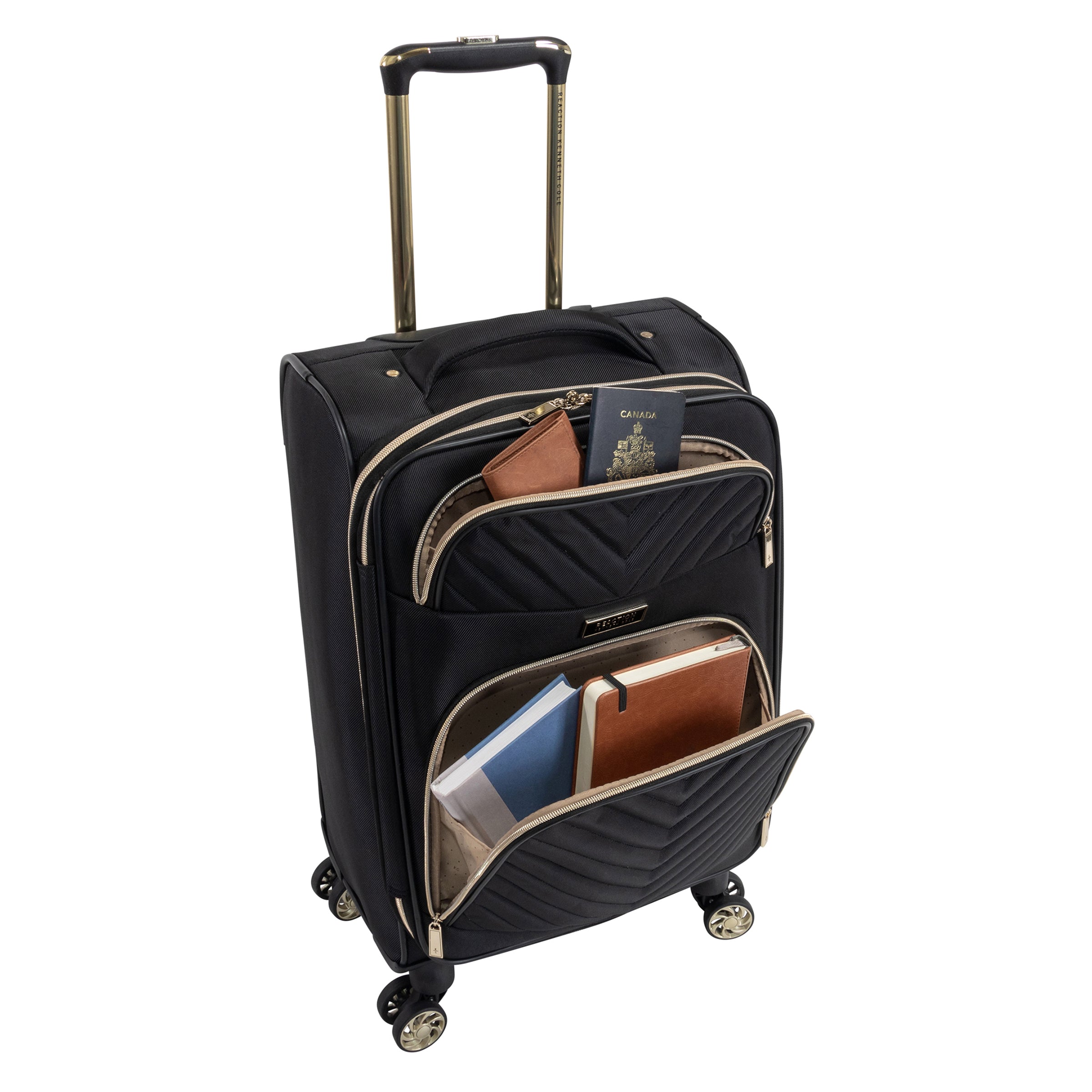 Finally, travel made trendy with the stylish polyester-twill chevron luggage from Kenneth Cole Reactions Chelsea luggage collection. Complete with a fully lined, tear-resistant interior, this luggage also expands an additional 2 inches, ensuring that you have plenty of space for all your needed belongings. Its lightweight construction helps you meet airline weight restrictions to avoid unnecessary airport fees, while its 8-wheel spinners provide effortless 360-degree navigation allowing you to glide quickly through the airport. The main compartment interior features a hanging side zipper pocket and garment restraints to hold belongings in place. The under-the-lid section includes a mesh zipper pocket and a transparent, clear PEVA gusseted pocket for toiletries. The front exterior also features a small zipper pocket for easily accessible items and a large gusseted zipper pocket for additional storage organization. Padded top and side handles allow for easy maneuvering, and a bottom grab handle allows for easier lifting. Additionally, a retractable trolley handle extends to be 41 inches tall with a locking push button mechanism. Fashionable and functional, Chelsea luggage also boasts fashion-forward gold hardware with premium self-repairing coil zippers designed for long-lasting use. Carry-on size meets most U.S. based airline carry-on size requirements and fits into most airline overhead bin compartments. . Overall Dimensions: 29.5 H x 16 L x 11-12.5 D. Packing Dimensions: 28 H x 15.5 L x 10.5-12D. Weight: 10 lbs. Backed by the manufacturer's lifetime limited warranty.