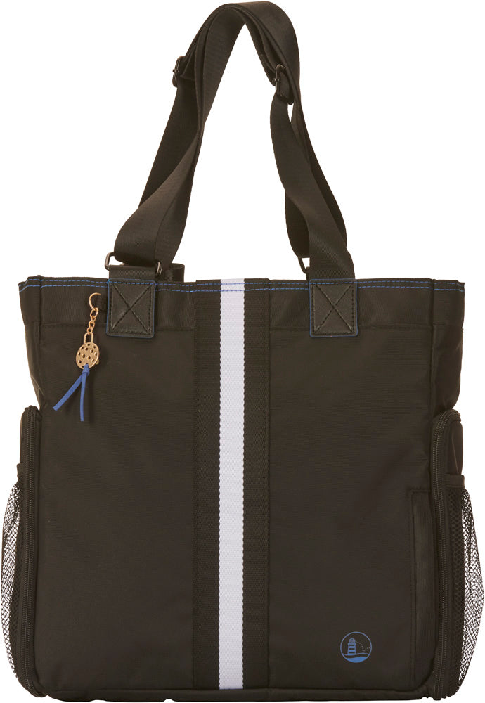 A limited-edition paddle tote with custom striped webbing on front. Perfect for all your racket sports. Get it while you can! Our Split Rock Pickleball Tote is carefully crafted of durable, water-resistant nylon, designed to be versatile and functional. Sized for Pickleball, Tennis and Paddle (Platform Tennis)! Holds up to three paddles in rear pocket with handle strap to snap in place. Front pocket with zippered cover holds everything else you will need on court- towels, jacket, sunscreen, hats, gloves, extra balls. Mesh pockets for water bottle and balls. Adjustable shoulder straps. Hidden pockets for phone and keys. Insulated pocket for drinks and phone. Felt-lined pocket for jewelry, sunglasses and valuables. This tote cannot be Personalized.
