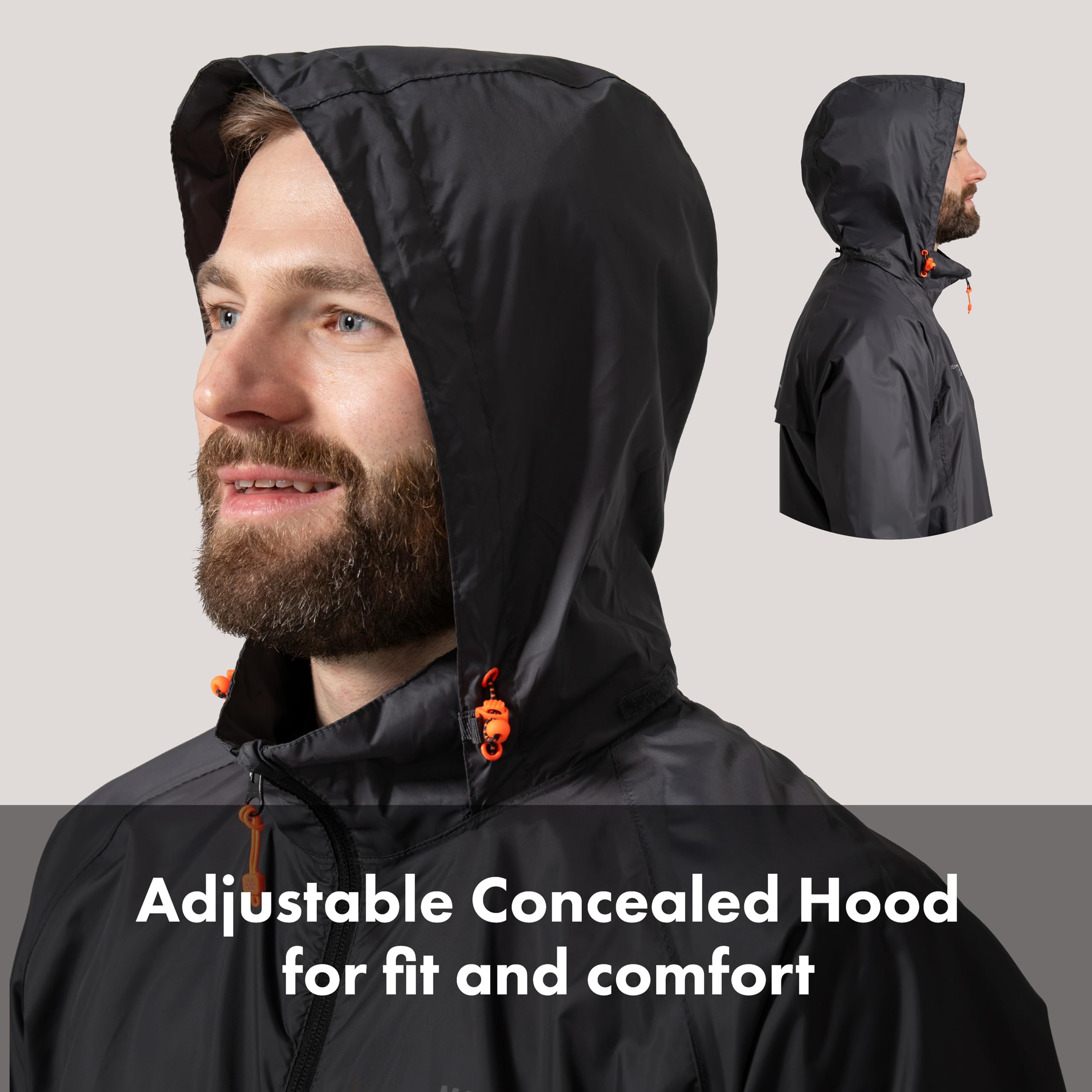 • Concealed Adjustable Hood. Highly Breathable (8, gsm). Windproof. Back Venting.