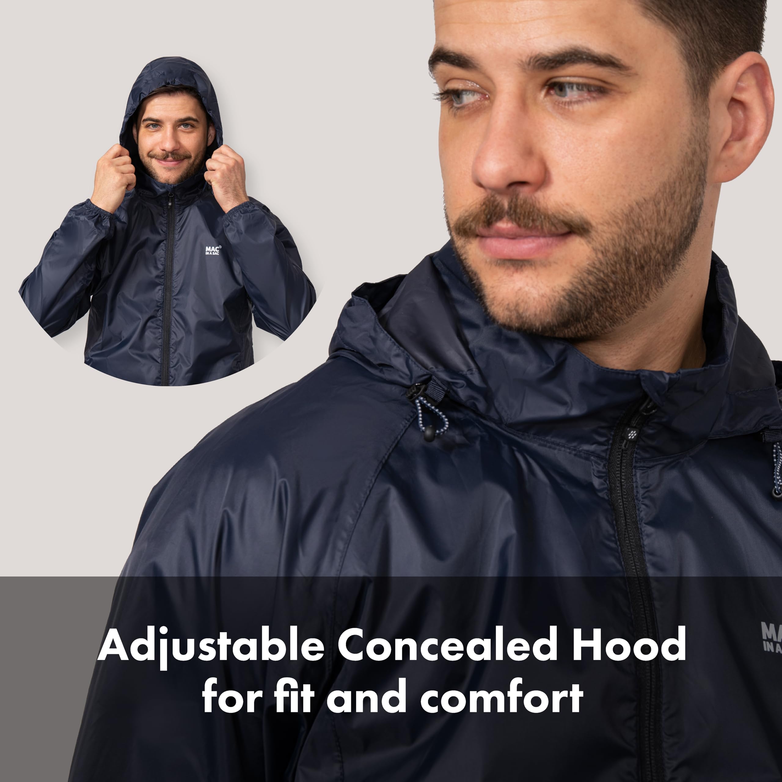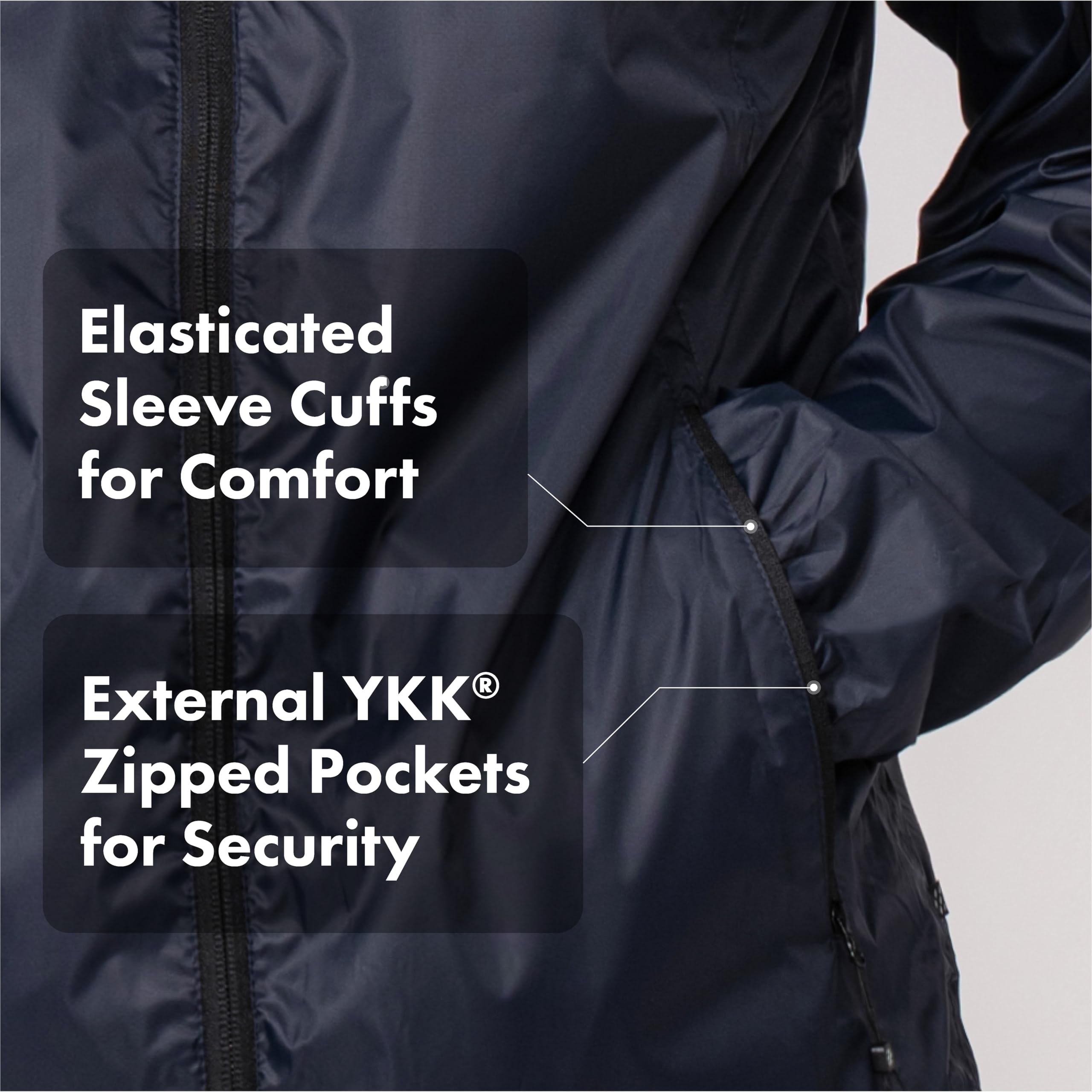 • Concealed Adjustable Hood. Highly Breathable (8, gsm). Windproof. Back Venting.