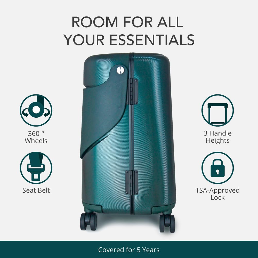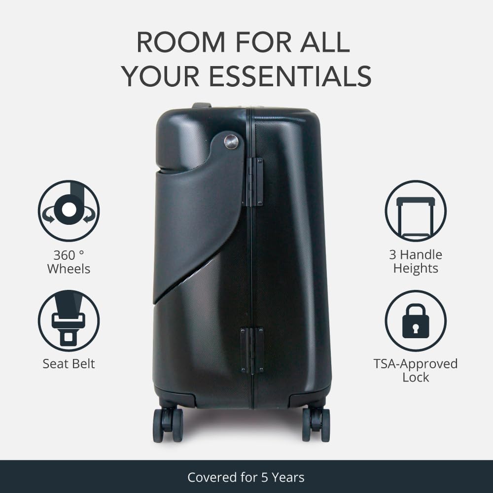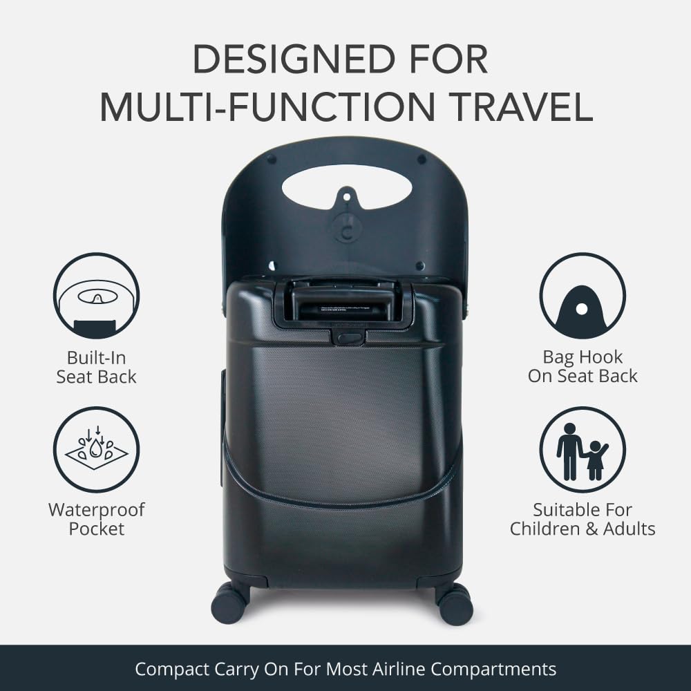 • SUITCASE WITH SEAT for kids to ride as you roll, or for adults to sit comfortably while you wait. Features seat belt for safety, and seat folds flush with suitcase when not in use