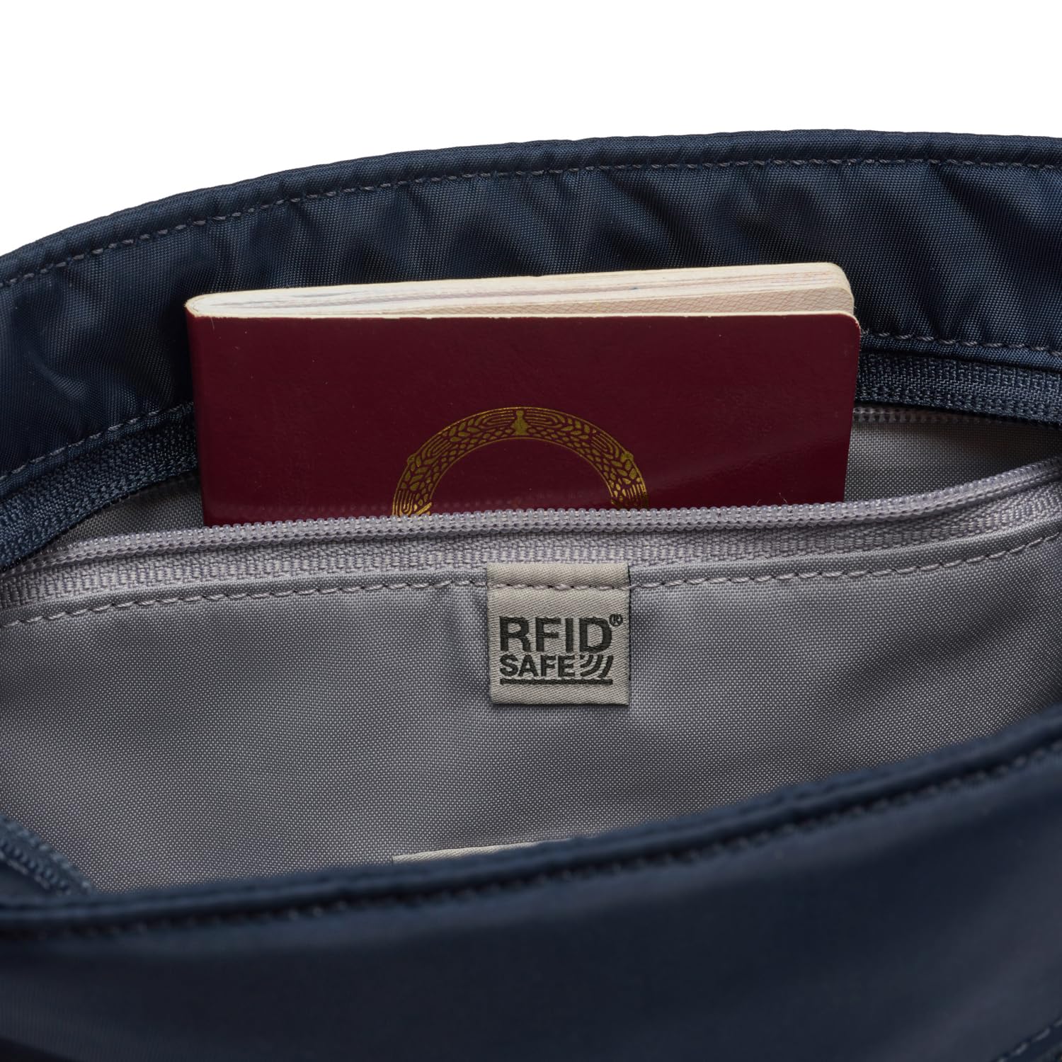 Stay organized and secure with its built-in RFID-blocking wallet featuring four card slots and a passport pocket, along with a spacious zipped RFID-blocking pocket for boarding passes or longer wallets.