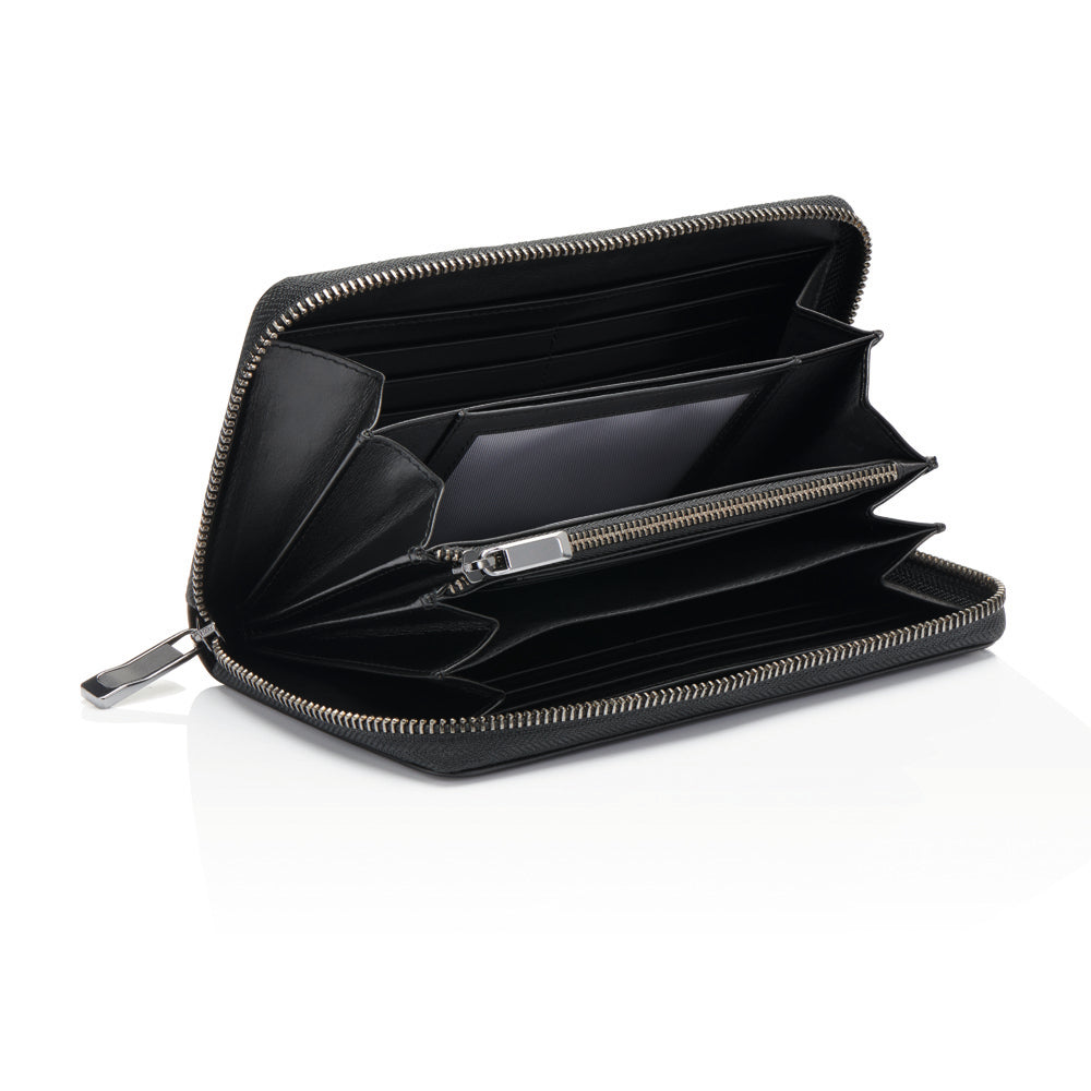 types of pockets, compartments and card slots to fit ones individual preference. Whether cash or credit cards, everything can be stored safely in dedicated spaces and is easily accessible. All items are RFID protected and secure any card data from unauthorized access. Some items feature a mesh pocket on the inside, a timesaving feature to store any travelling passes, etc. Inside the accessories the lining with Porsche Design icons and the co-branding logo add further value to the product. The Small Leather Goods Classic Collection is offered in many sizes and a wide range of interior options, with its elegant black smooth leather and the Porsche Design logo plate it sets a modern and luxury statement.