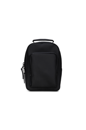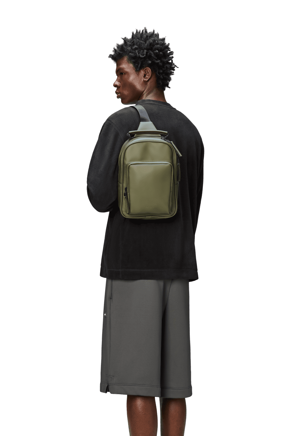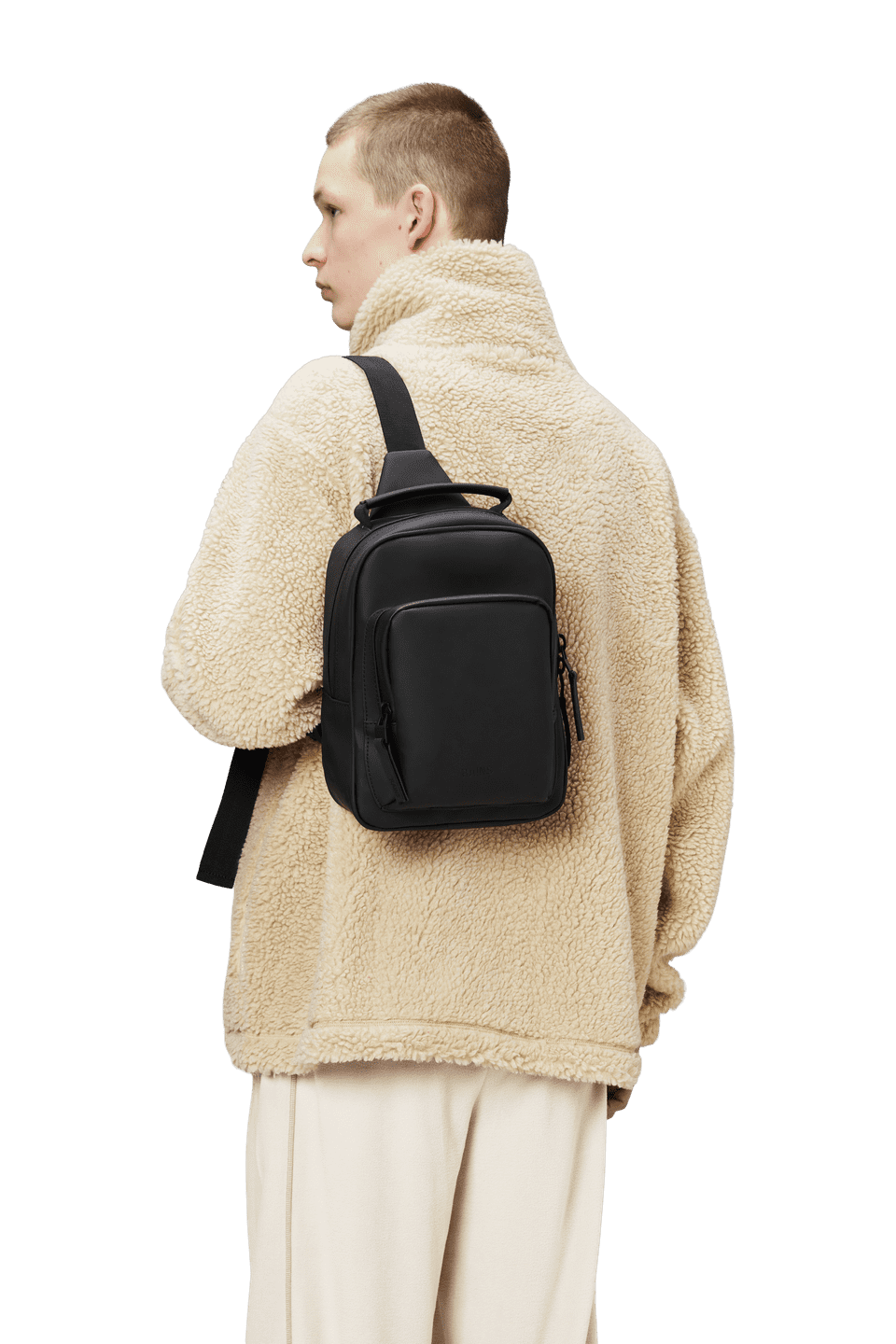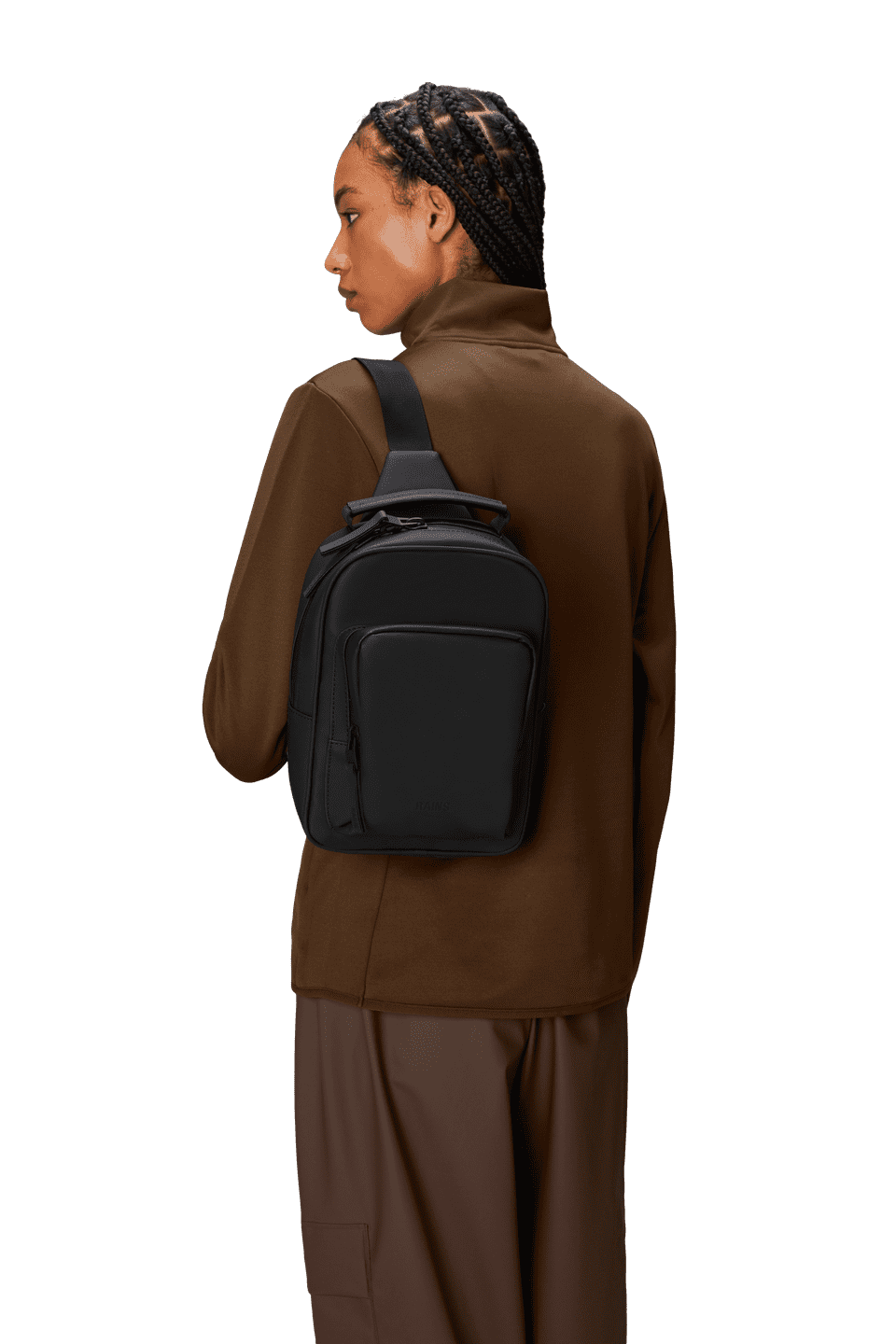 Book Daypack Mini is a compact version of Rains Book Daypack. Wear the monostrap as a sling over the shoulder or as an oversized bum bag. Book Daypack Mini is a clean, compact design characterized by fun, yet technical features that offer multiple uses. Wear it cross body as a sling bag over the shoulder with the adjustable monostrap, or clip it around the waist as an oversized bum bag. Perfectly designed for carrying smaller essentials day to day or when traveling. The design has a curved top, coated zip closures and front zip pocket. Open Book Daypack Mini to reveal a main compartment with an internal slip pocket. This style is finished with a webbing carry handle and padded mesh panels on the back for breathable comfort. Book Daypack Mini is cut from Rains signature waterproof PU fabric, engineered for carrying strength, durability and a smooth feel.