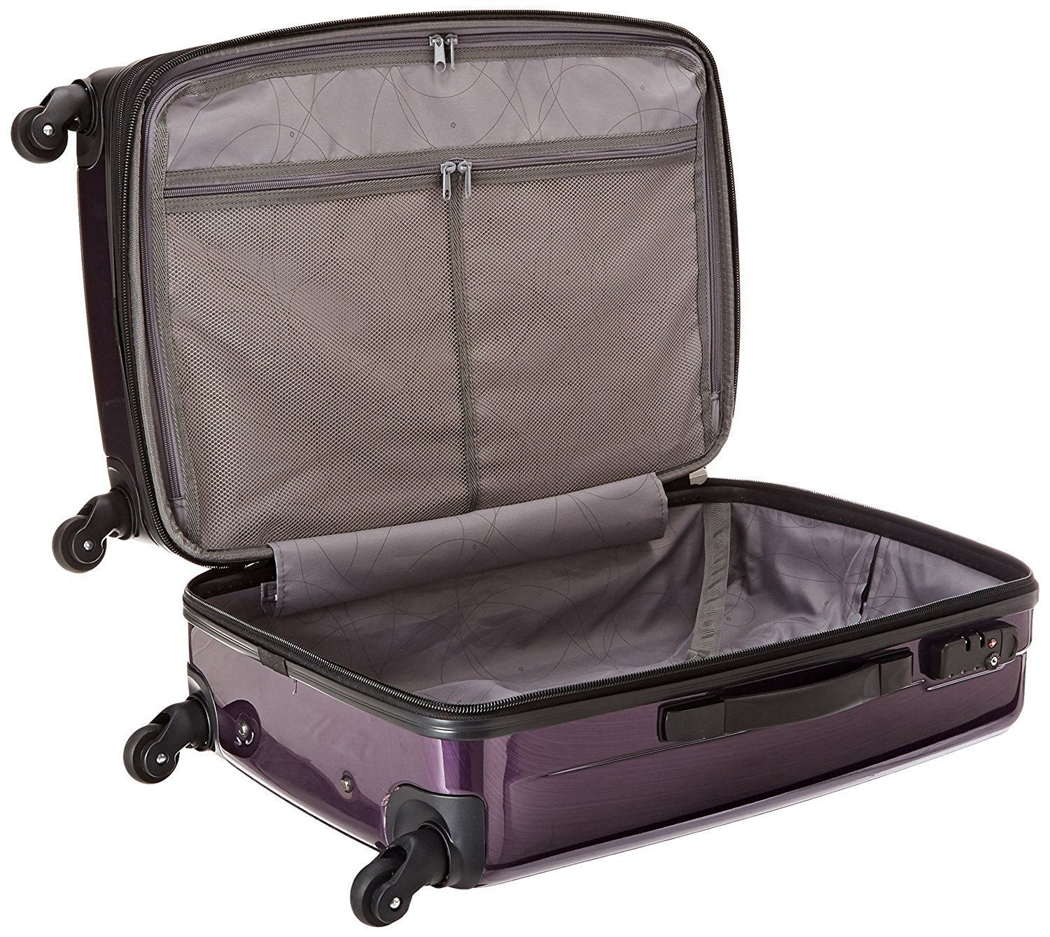 Transport your travel essentials effortlessly and stylishly. This extremely lightweight and durable spinner features 100 percentage polycarbonate construction with sharp molded details. Made to absorb impact by flexing while under stress then popping back to its original shape, eliminating dents and dings while protecting its contents. An elegant brushed pattern hides any potential scratches or scuffs from your journeys. The fully-lined interior has cross-straps, a privacy curtain with its own zippered organizational pockets. Tsa approved combination lock for security and peace of mind.