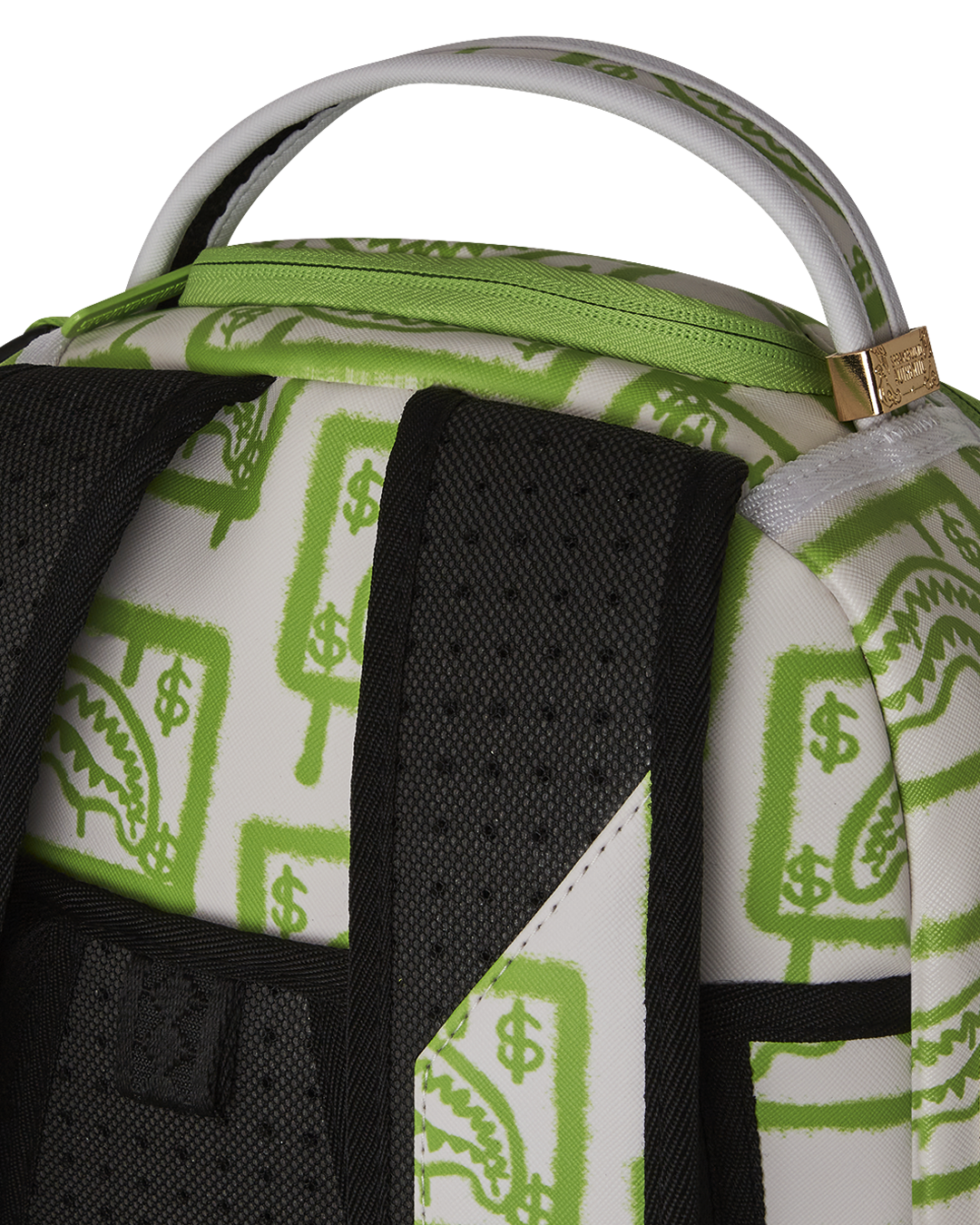 • Gold zippers with metal hardware. Metal "Sprayground Authentic" badge.