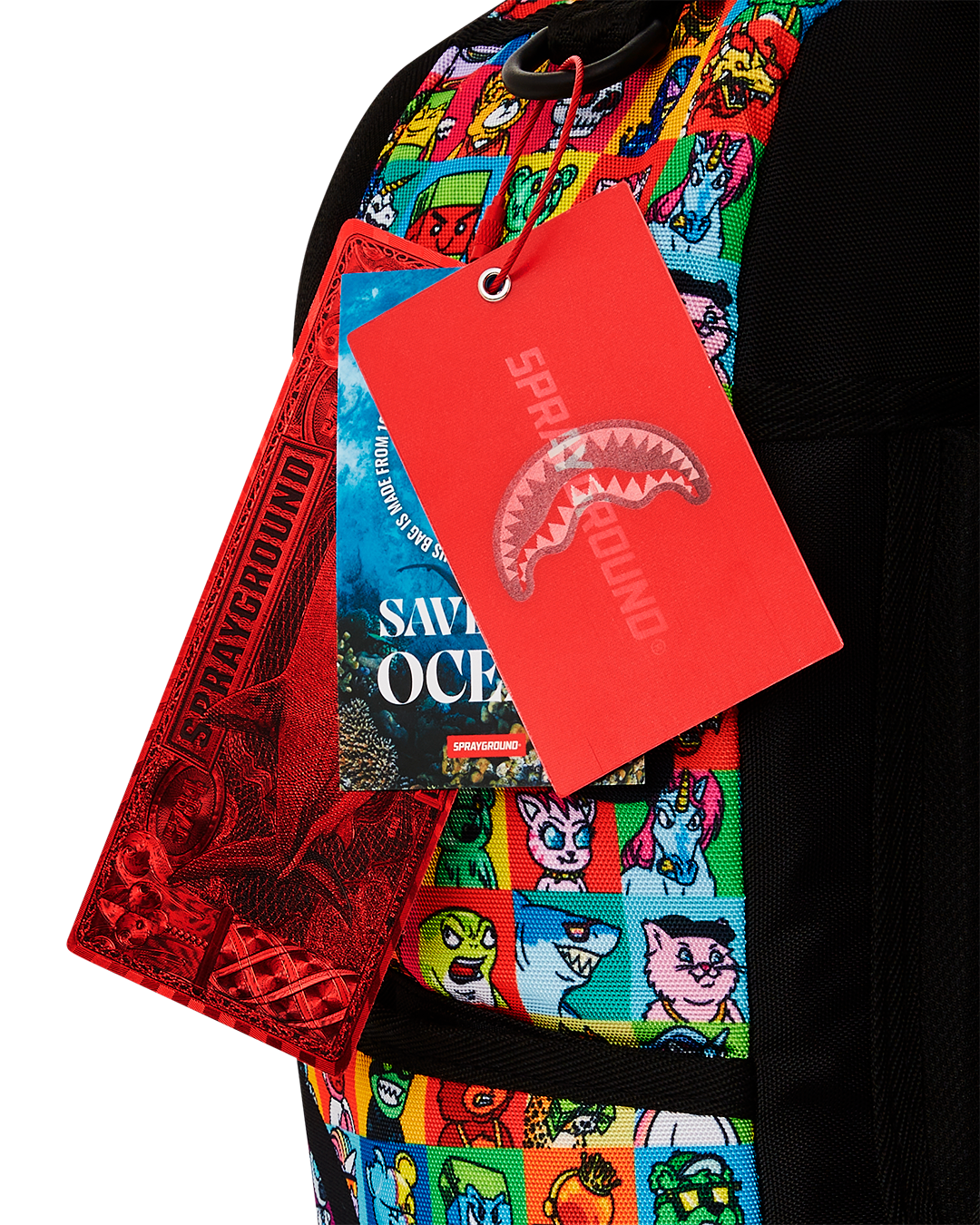 ALL BAGS ARE LIMITED EDITION & NEVER PRODUCED AGAIN. Made with Durable Faux Leather water-resistant fabric Spraygrounds art is meant to tell a story, through inspiration, pop culture, details, color, and thought-provoking concepts that push the limit in design and fashion. Durability, Strength, and Longevity are the foundation of Quality for Sprayground. A bag is meant to be thrown and beat up through the normal wear and tear of people's daily adventures. Functional compartments for todays youthful tech kid with slots for headphones, sunglasses, laptops, tablets and easy organization and mobility with ergonomic strap support for easy transport.