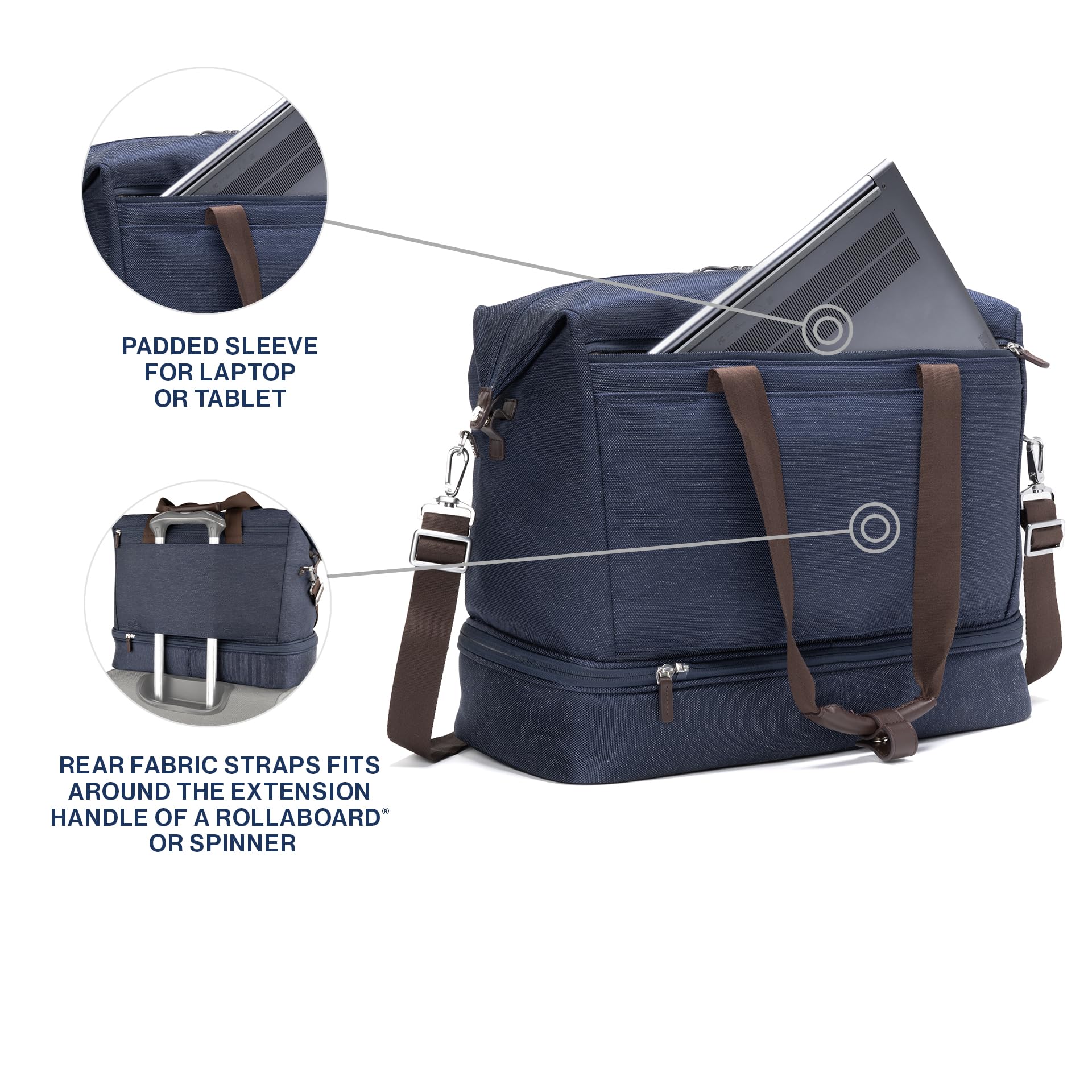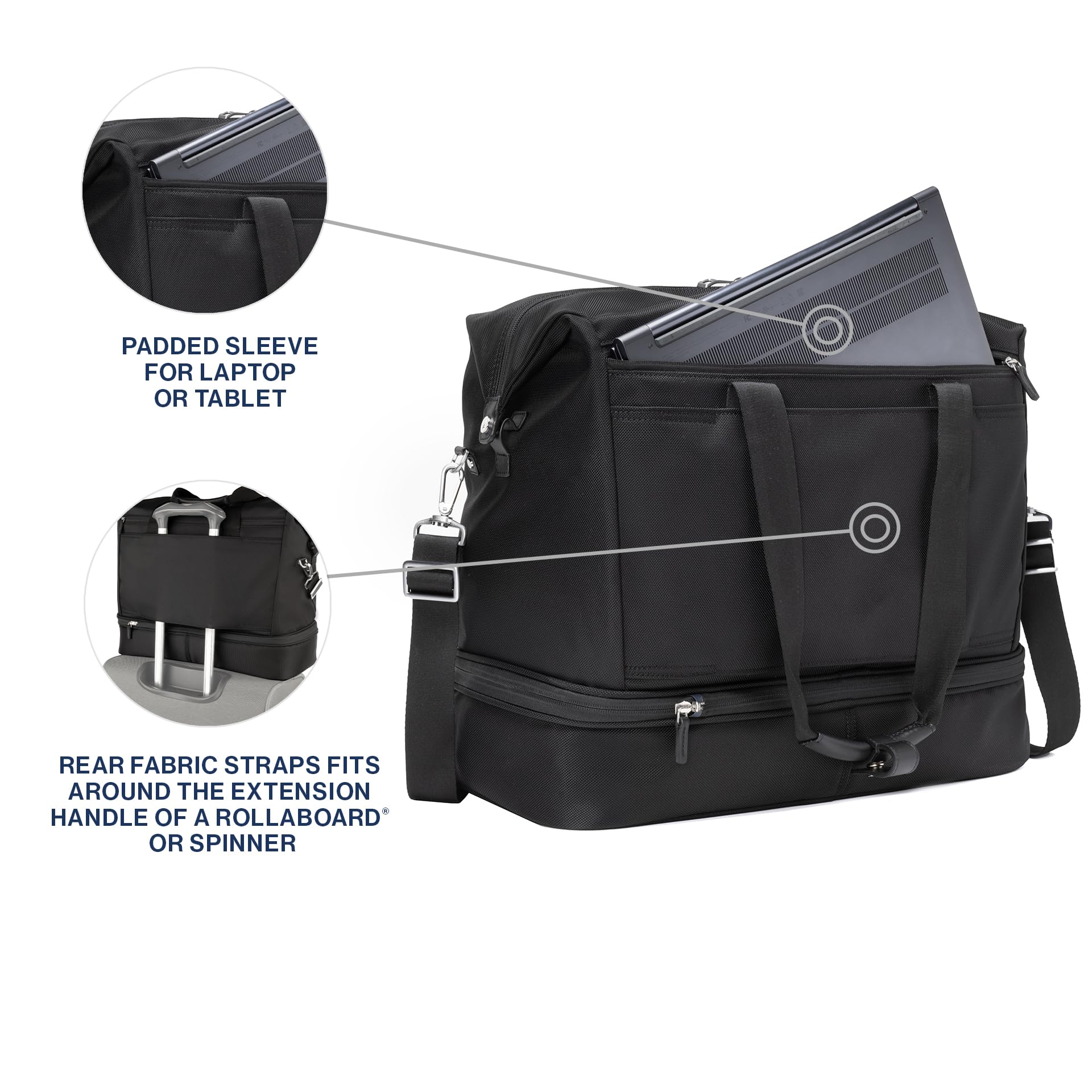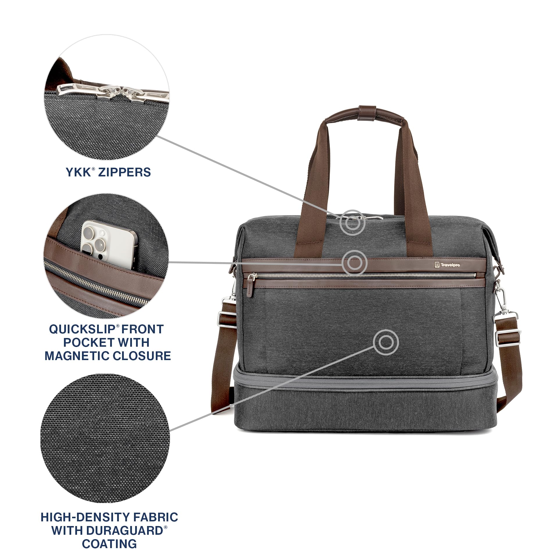 Designed for impressive adaptability with a removable bottom compartment, the Travelpro Platinum Elite Drop-Bottom Weekender makes an excellent gym bag, around-town commuter satchel, and an all-in-one travel carry-on. Fit for far more than weekends, this stylish and durable do-all features a bottom section with a divider panel that can be used to separate shoes or other items from the main compartment or opened to create a larger single interior space. For ultimate convenience, remove the bottom completely to create a smaller bag when needed. Keeping everything organized, an interior padded sleeve protects electronics, and a Travelpro QuickSlip front pocket securely stores a cell phone or other often used item. ECOFAB interior lining is easy to keep clean and made from recycled plastic bottles, while the ultra-durable, high-density exterior fabric is treated to resist stains and abrasions and then finished with full-grain leather details and hardy YKK zippers for extreme resilience. Carrying options include leather handle touchpoints, a removable, adjustable shoulder strap, and an integrated rear strap that slides over the extension handle of a rolling suitcase for secure stacking.