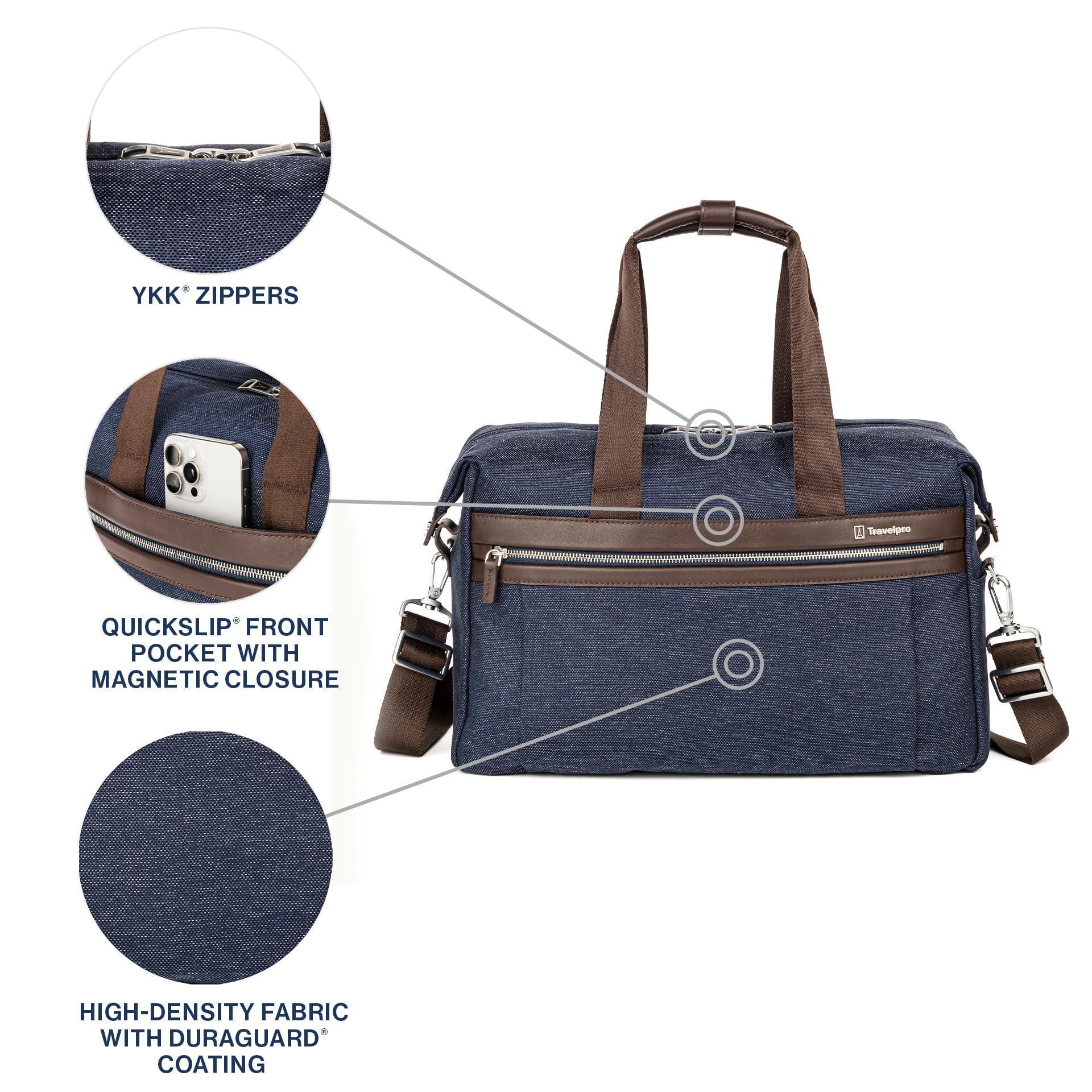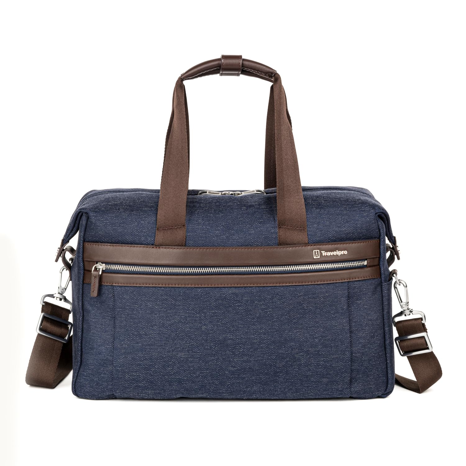 This stylish Underseat Tote isnt just for airplane travel. While its soft construction makes it an ideal onboard personal item that fits easily under most domestic airline seats, but the Travelpro Platinum Elite UnderSeat Tote also works great as a gym bag and an everyday carry-all. Built-in organization includes an interior padded sleeve to protect electronics and a Travelpro QuickSlip front pocket that securely stores a cell phone or other essentials for quick access. ECOFAB interior lining is easy to keep clean and made from recycled plastic bottles, and the ultra-durable, high-density exterior fabric is treated to resist stains and abrasions, then finished with full-grain leather details and hardy YKK zippers for extreme resilience. Carrying options include leather handle touchpoints, a removable, adjustable shoulder strap, and an integrated rear strap that slides over the extension handle of a rolling suitcase for secure stacking.