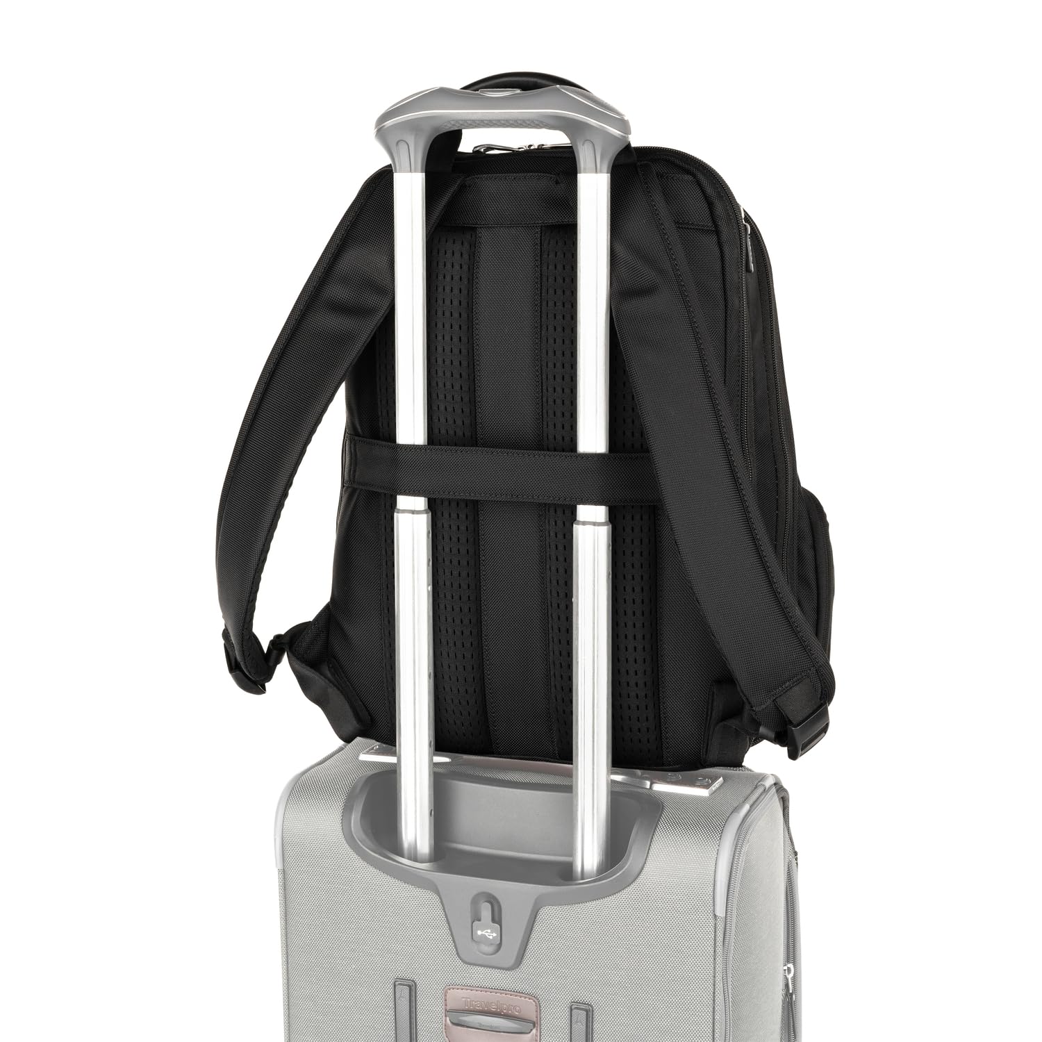 Business is a pleasure with the stylish, organized, and durable Travelpro Platinum Elite Business Backpack. This ideal commuting companion carries it all to and from work, the gym, shopping, and even out-of-town trips. Inside-out organization includes padded sleeves to protect electronics, a Travelpro ID TheftBlock pocket to protect credit cards and passports against loss and identity theft, and compartments for power cords, power banks, and more. Exterior side pockets are perfect for water bottles or an umbrella, and a . Travelpro QuickSlip front pocket securely stores a cell phone or other often used item for quick retrieval. Constructed for frequent and lasting use, this backpack has ECOFAB interior lining that is easy to clean and made from recycled plastic bottles, and ultra-durable, high-density exterior fabric that is treated to resist stains and abrasions. Full-grain leather touches add sophistication and hardy YKK zippers stay on track and glide with ease. Carrying options include a leather top handle, ergonomic, adjustable shoulder straps, and an integrated rear strap that slides over the extension handle of a rolling suitcase for secure stacking.