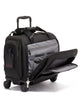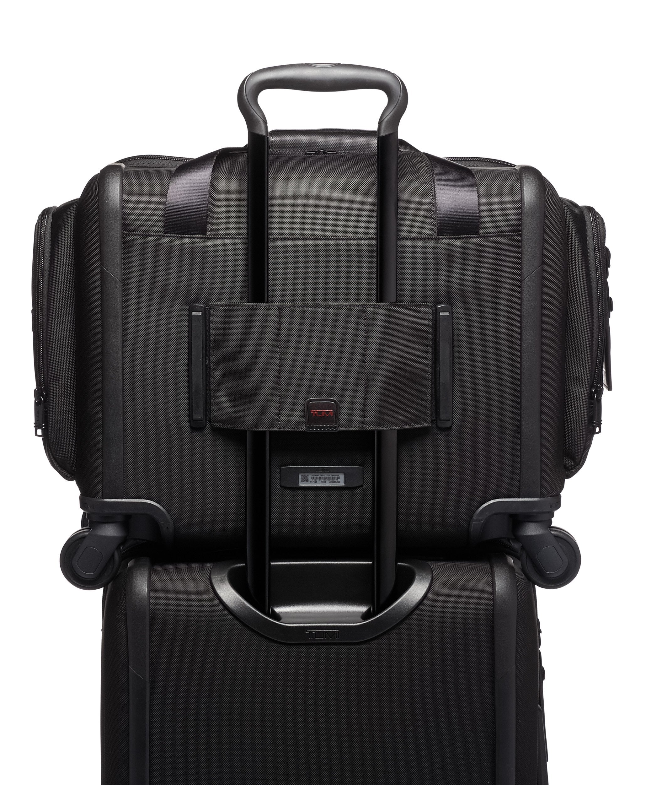 - Zip entry to main compartment, 2 front U-zip pockets, Gusseted front straight-zip pocket, Front slip pocket with magnetic snap, 2 side zip pockets (one with water-resistant lining), Leather-wrapped top carry handles, 5-stage telescoping handle, 4 dua Mesh zip pocket, Zip pocket, Open pocket, 3 media pockets, 3 card pockets, Pen loops, Key leash