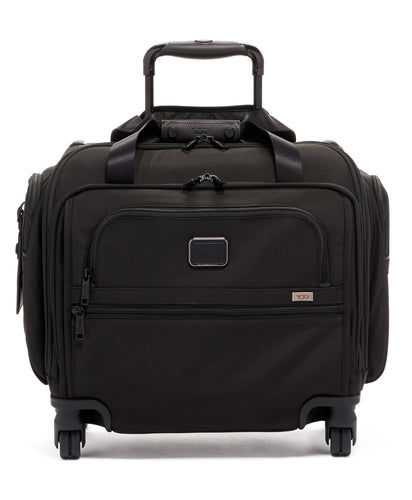 - Zip entry to main compartment, 2 front U-zip pockets, Gusseted front straight-zip pocket, Front slip pocket with magnetic snap, 2 side zip pockets (one with water-resistant lining), Leather-wrapped top carry handles, 5-stage telescoping handle, 4 dua