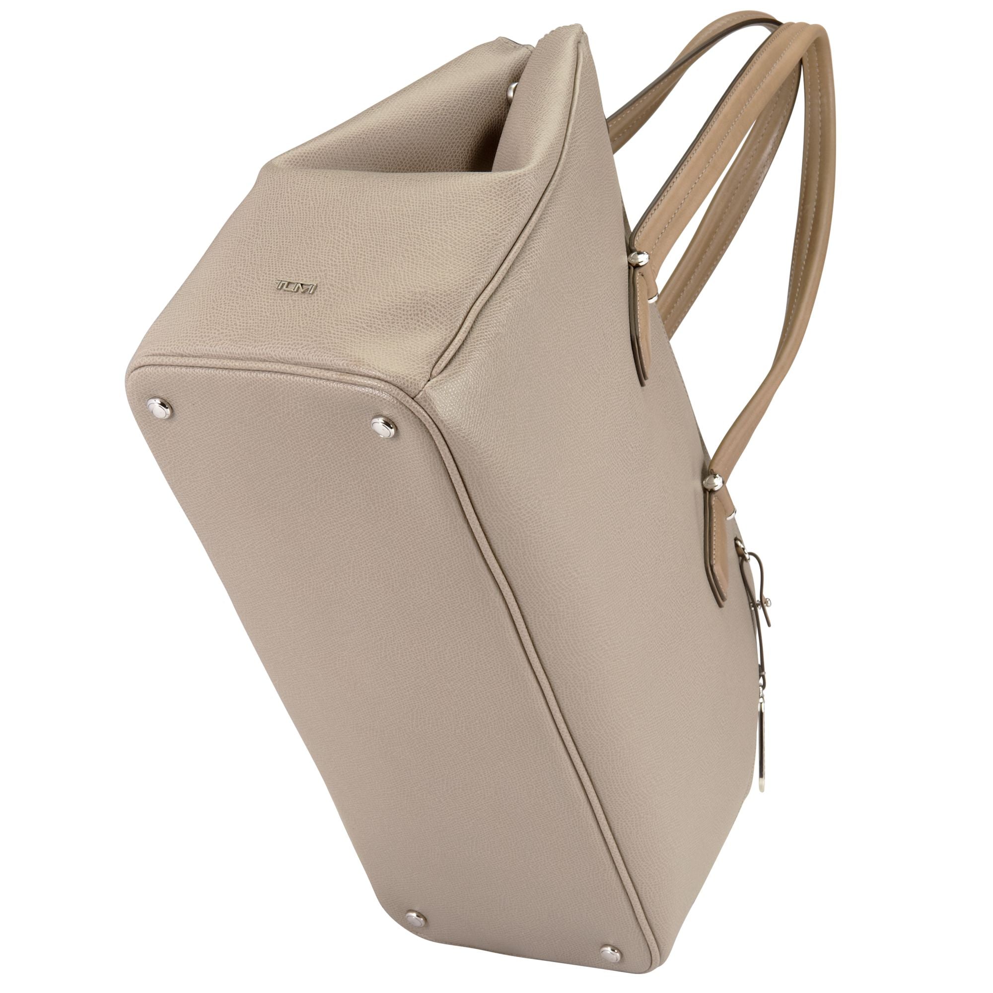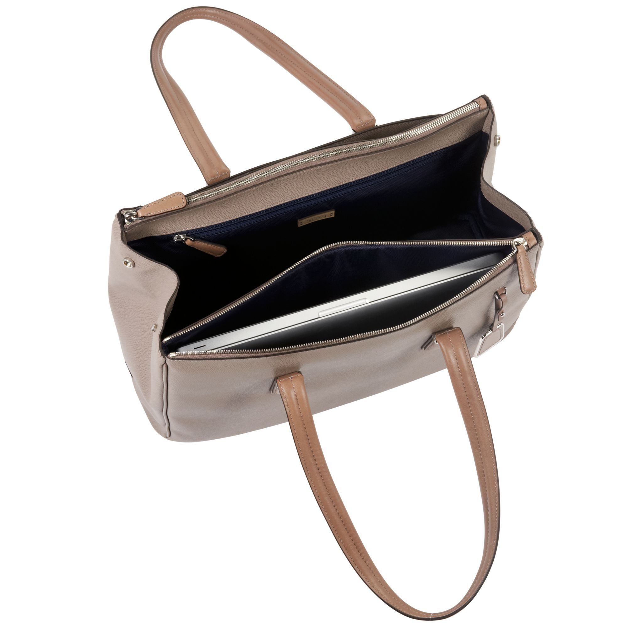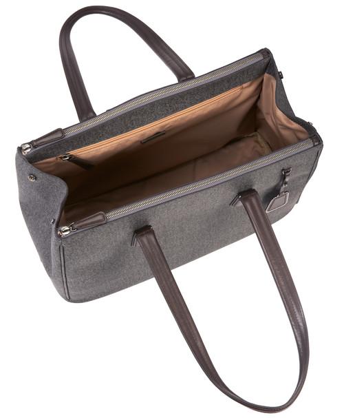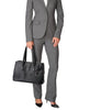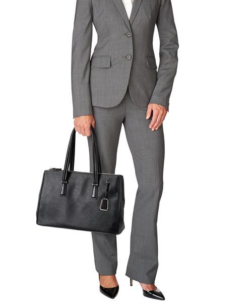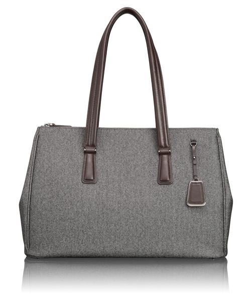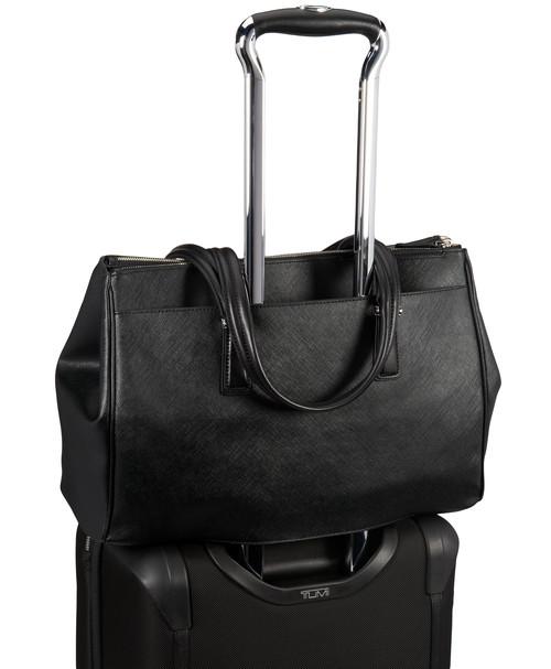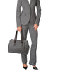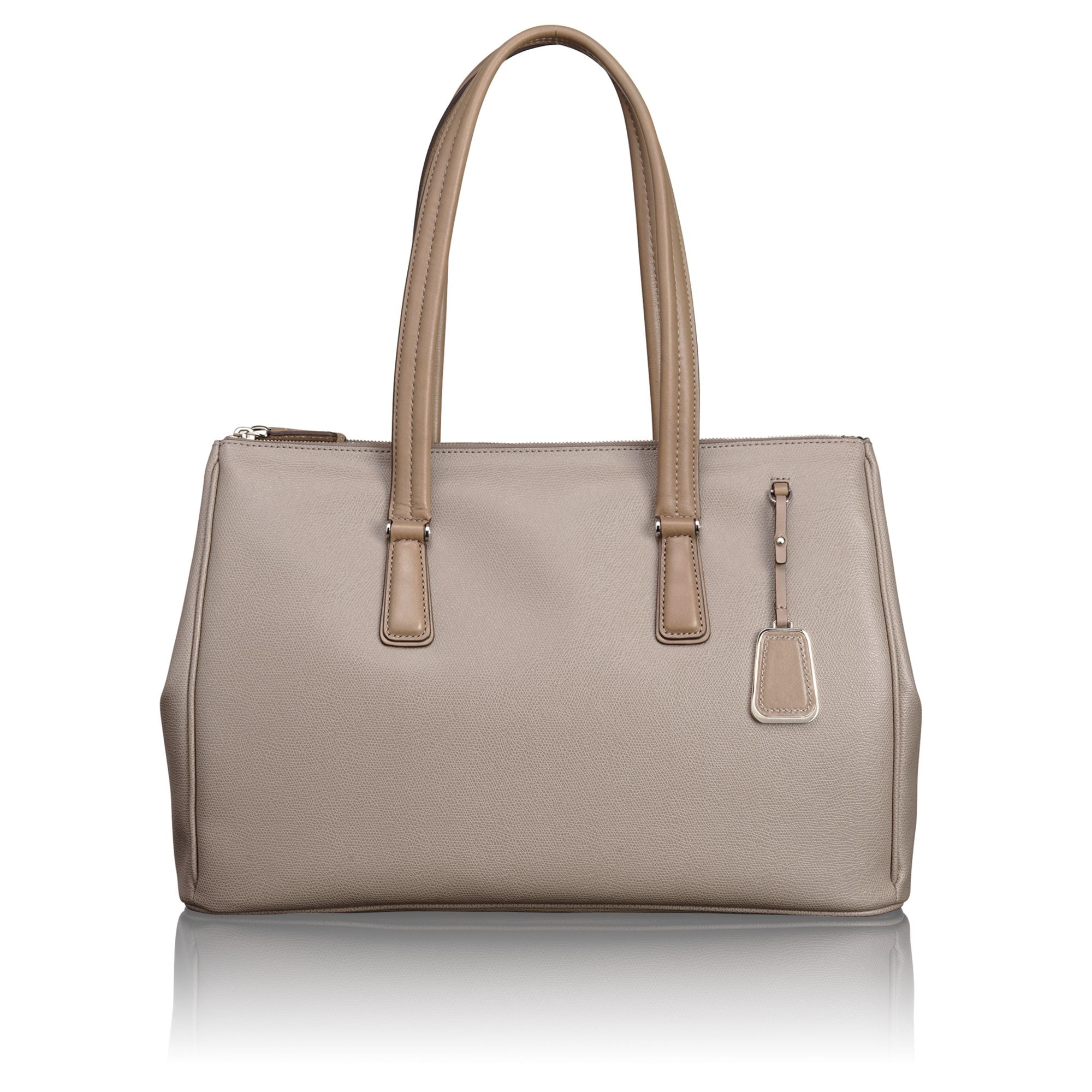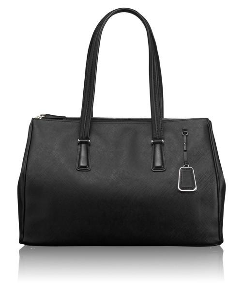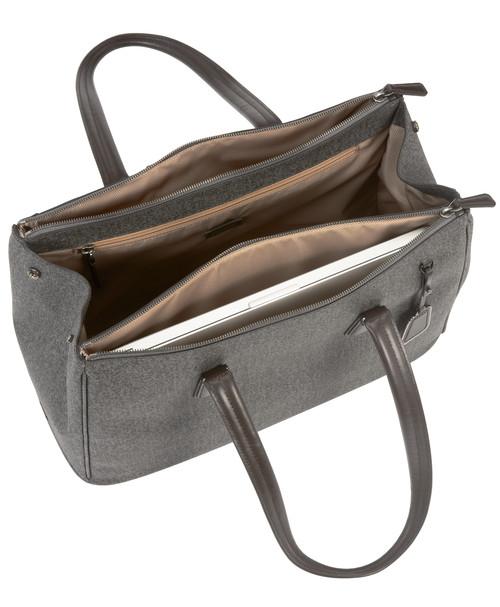 Sophisticated. Simple. Elegantly detailed. Sinclair is a modern collection of thoughtfully designed professional totes, briefs and carry-alls for women. Each piece is exquisitely executed in textured coated canvas and highlighted with leather trim. This roomy, triple compartment carry-all will be your go-to bag for business, pleasure and travel. Interior accommodates a 15" laptop, a padded front section that can hold a 12" model. Features a padded tablet pocket plus numerous interior and exterior pockets. Longer handles have a drop length of 9" from shoulder.