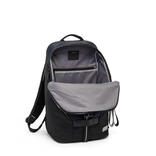 • Zip laptop compartment (fits up to 15" screens), Zip entry to main compartment, Diagonal side-zip pockets, Magnetic back slip pocket, Top handle with leather trim, Compression strap with leather-trimmed carry handle, Padded adjustable backpack straps, Elastic earbud pocket on backpack strap, Add-a-Bag sleeve, Water-resistant rain cover with reflective stripe protects front of pack and zips into bottom of bag when in not in use, Mesh back panel, Comes with two detachable oversized logo zipper pulls