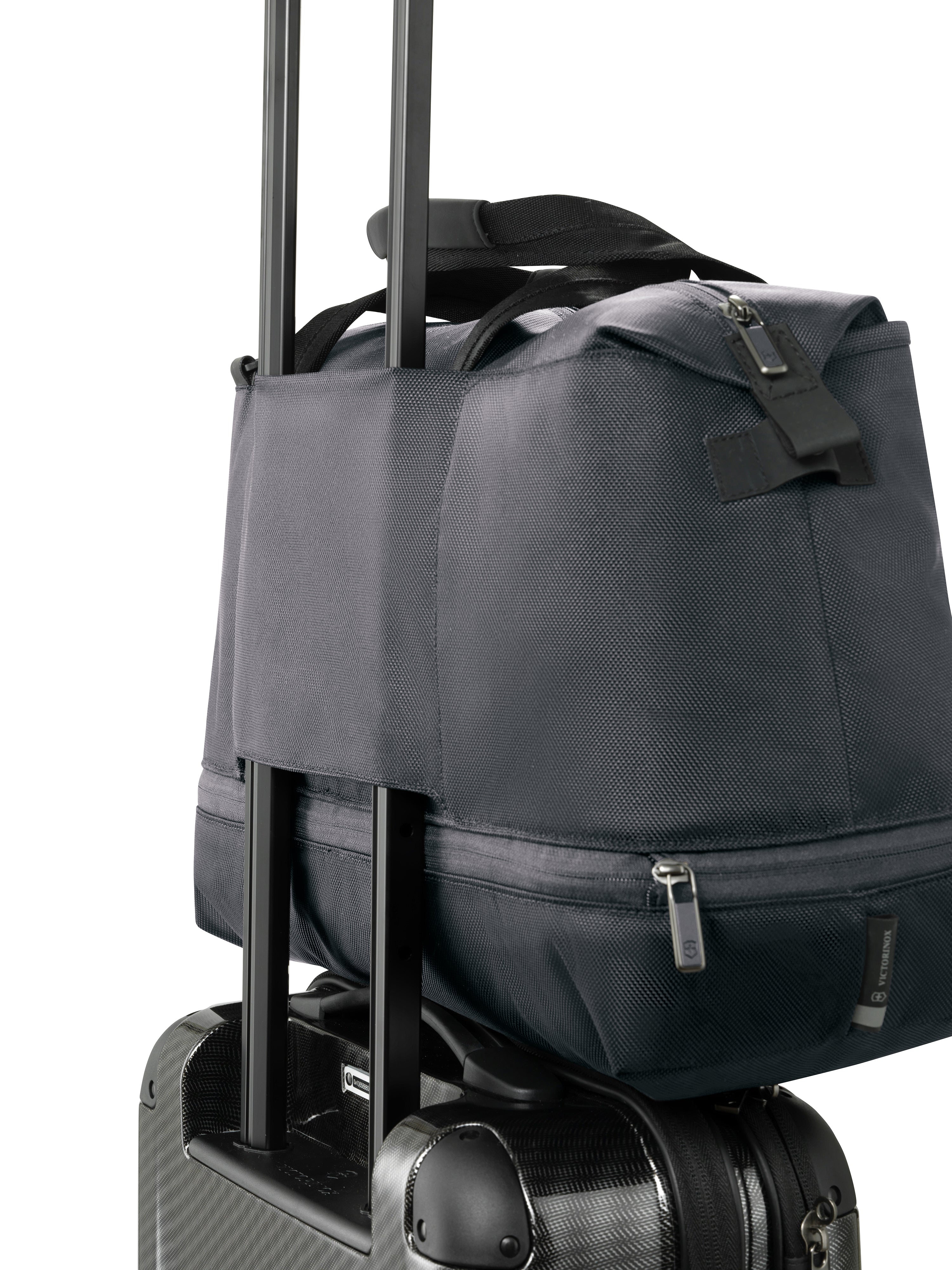 - Great for a weekend adventure or a trip to the gym, this spacious carry-all contains ample capacity and a zippered drop down expansion for additional storage room when needed.