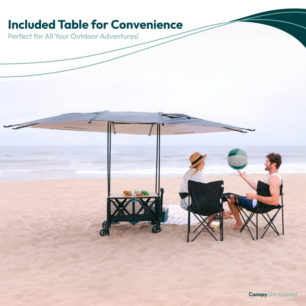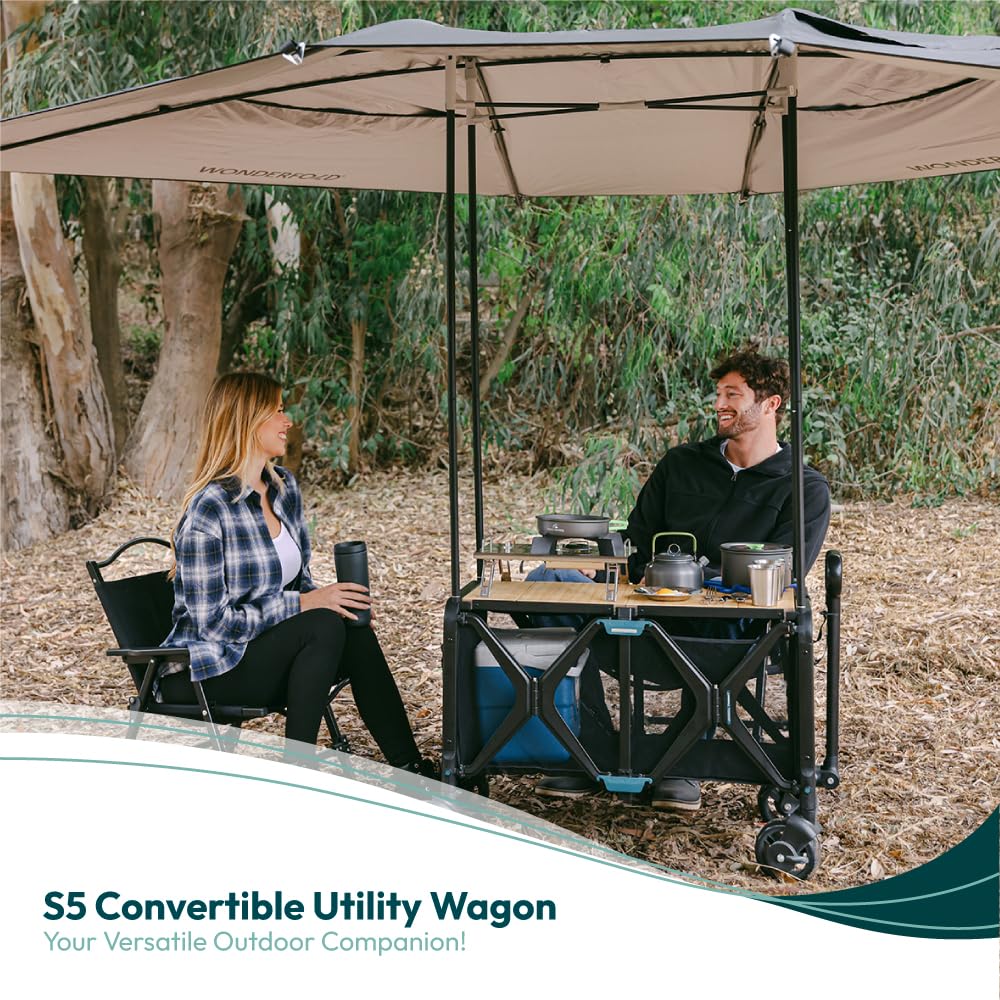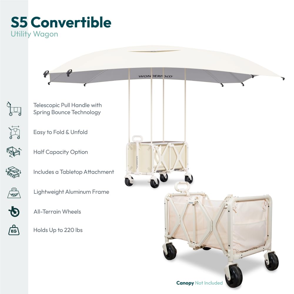 Introducing the WonderFold Convertible Utility Wagon. Your versatile outdoor companion! Effortlessly fold and unfold with brakes for stability. Attach the included table for added convenience. The S5 Canopy (sold separately) provides ultimate shade and comfort. Perfect for all your outdoor adventures!