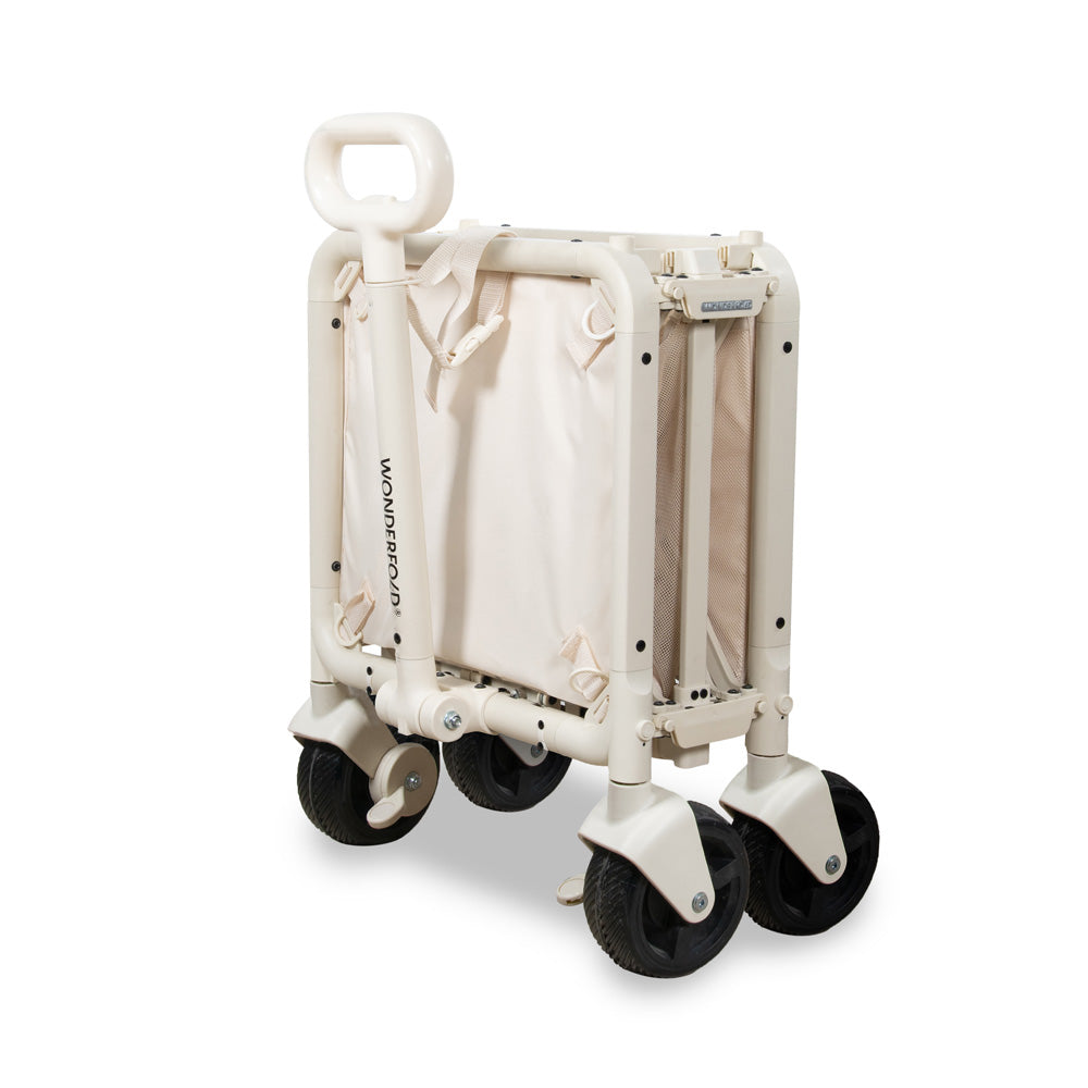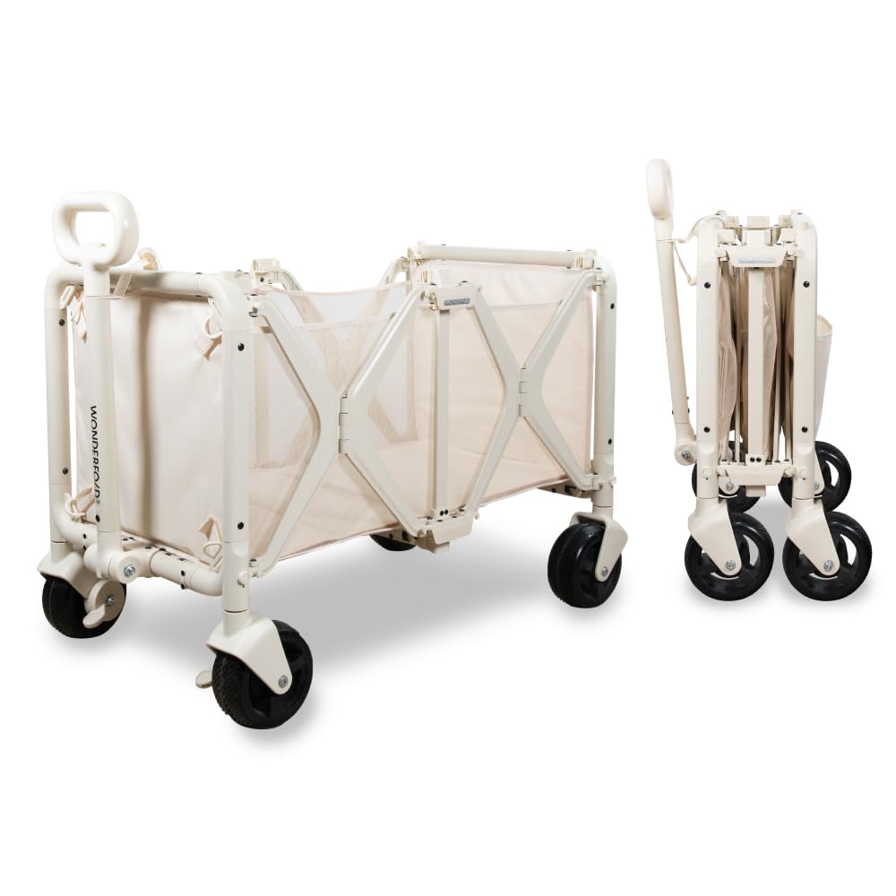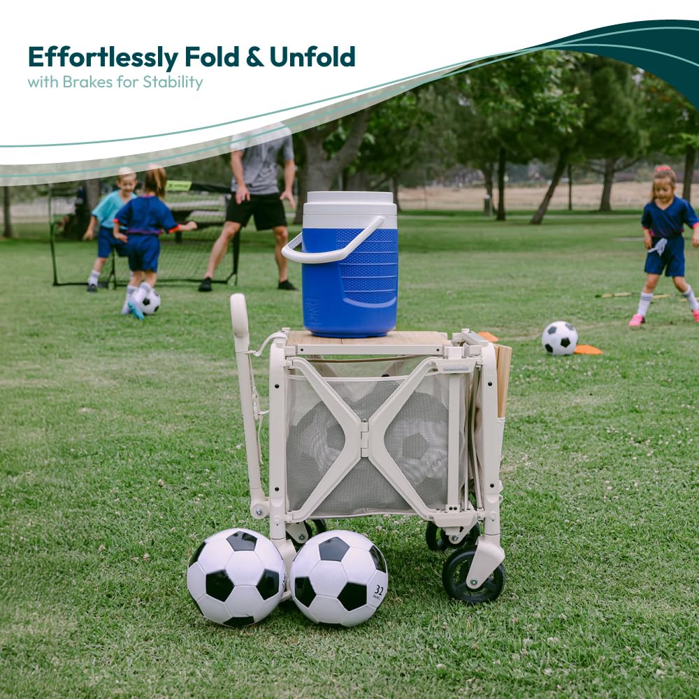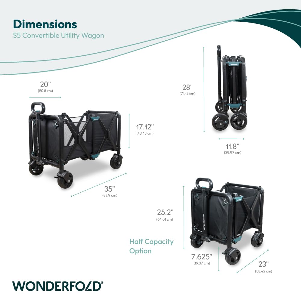 Introducing the WonderFold Convertible Utility Wagon. Your versatile outdoor companion! Effortlessly fold and unfold with brakes for stability. Attach the included table for added convenience. The S5 Canopy (sold separately) provides ultimate shade and comfort. Perfect for all your outdoor adventures!