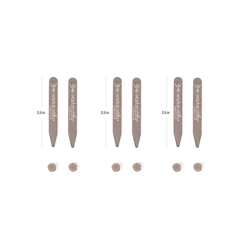 These innovative collar stays are crafted from corrosion-resistant, airport-friendly metal alloy and are paired with a set of 6 magnetic power 'buttons' to instantly tame your collar. Insert stays into collar and place the magnet under your shirt to get the perfect collar every time. If you're looking for the best collar stays on the market, look no further than Wrkin Stiffs.