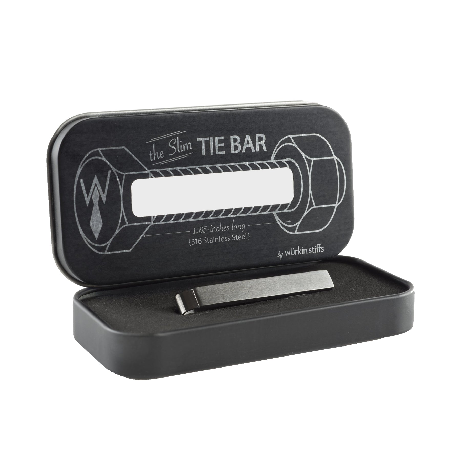 This Wurkin Stiffs Nuts & Bolts Collection The Slim Lacquered Stainless Steel Tie Bar is truly auto inspired, utilizing automotive lacquer paint over stainless steel for a modern pop of color and personality! The slim design reduces bulk and the Wurkin Spring feature adds an additional pivot point to prevent overstretching the bar. Includes tin gift box that can also be used for storage. Measures 1.65" x 0.25" x 0.25".