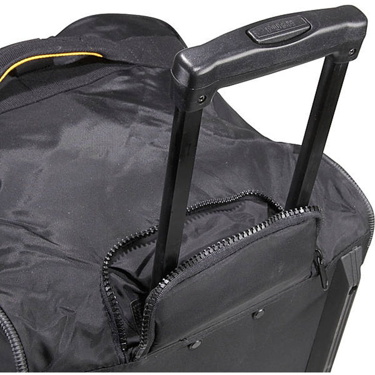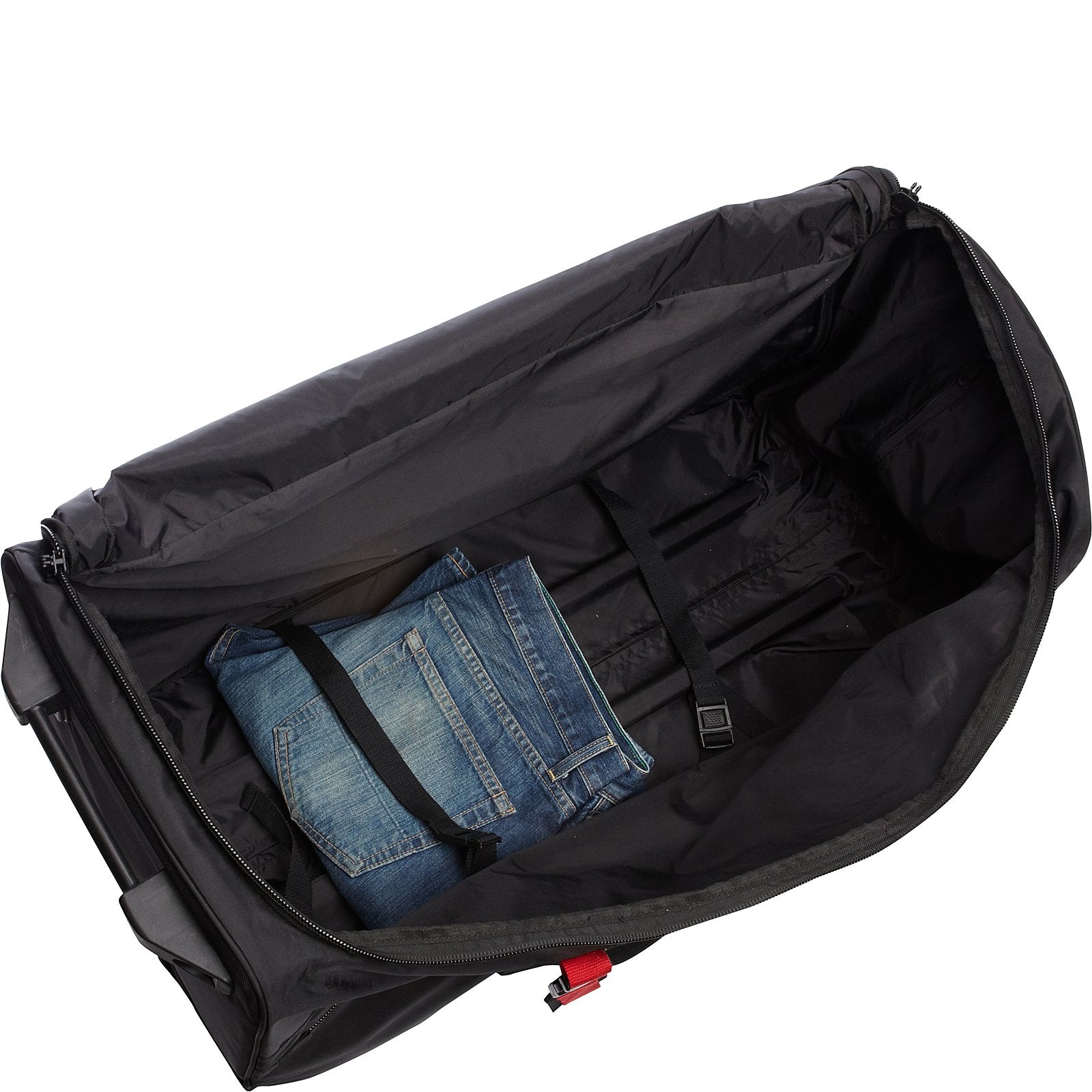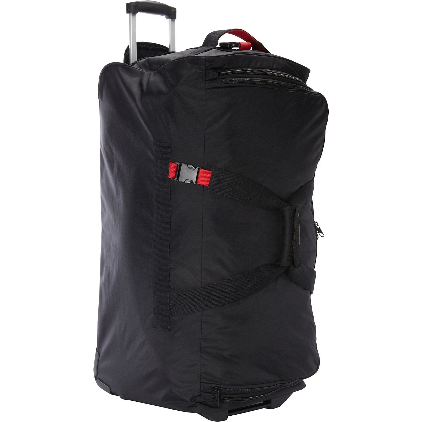 Compact, lightweight and durable, this duffel features a spacious, zippered main compartment with large U-shaped opening for easy packing, 2 exterior pockets, stow-away trolley handle, nylon carry handles, bottom lift handle and in-line skate wheels for smooth rolling.