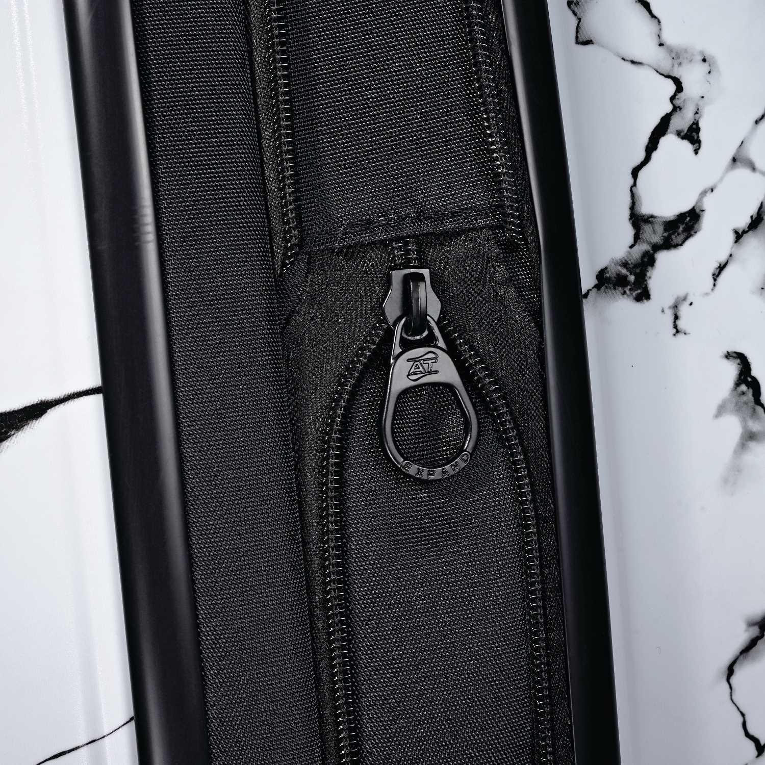 - Book opening case with mesh divider and cross straps in main coparyment with zipped modesty pocket.