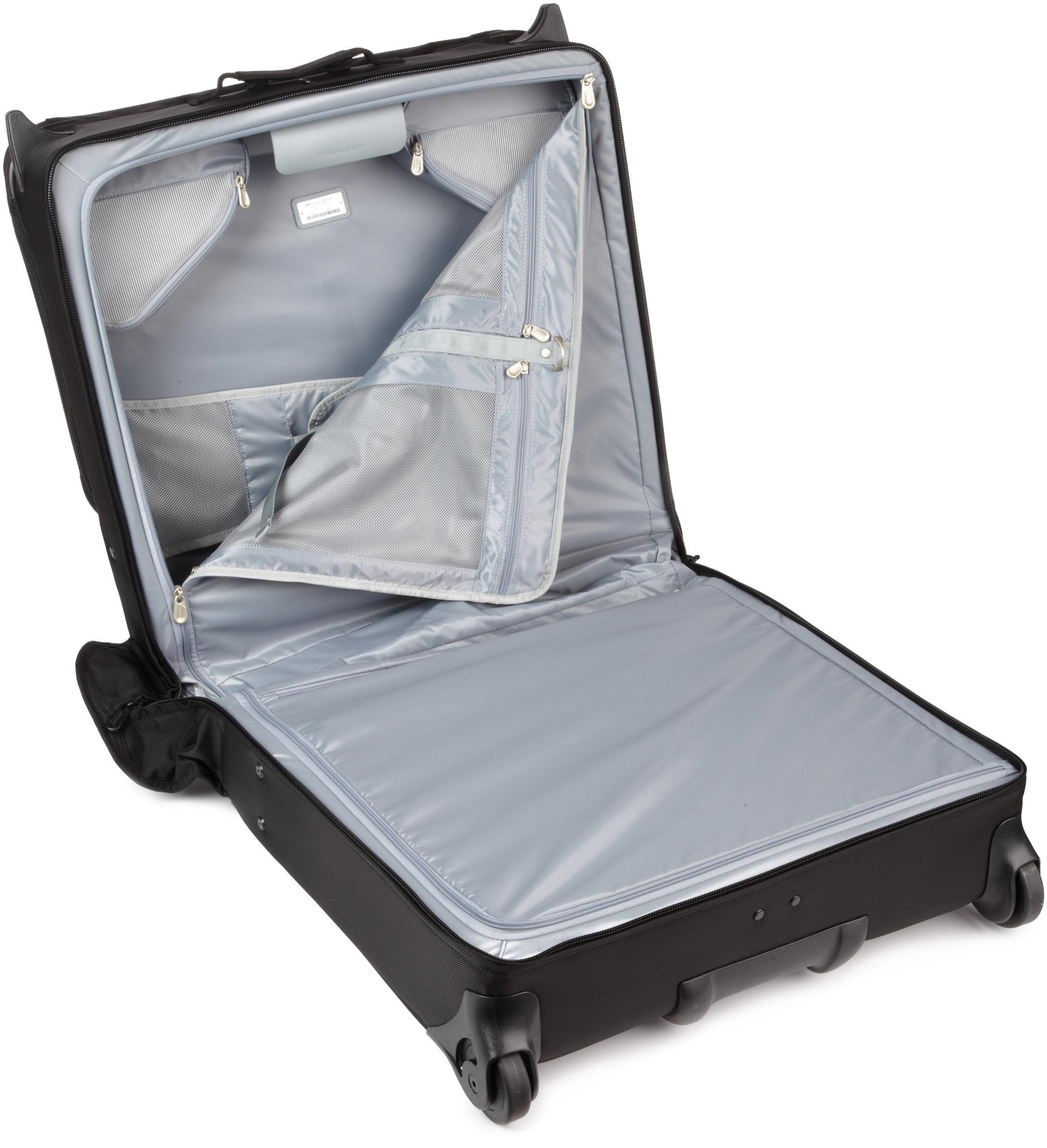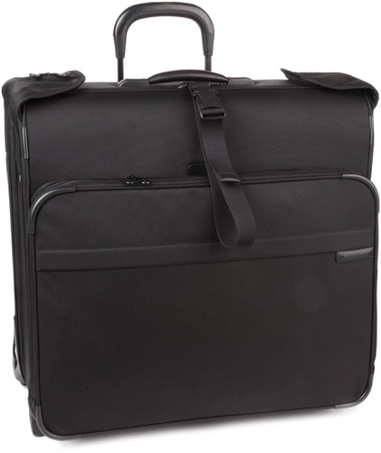 The Baseline Wheeled Wardrobe from Briggs & Riley offers optimal organization and packing capacity. Door panel features two zippered pockets perfect for laundry, two mesh pockets for undergarments, a tie/scarf pocket, and a large mesh packing pocket. Main section features three sets of Wally Hooks to securely hang 4-8 suits. Two sets of foam-centered, garment panels gently blanket clothes to minimize wrinkling. Zip-in, removable extension panel keeps longer garments neat. It features a set of foam-centered garment panels, a foam roll bar to prevent wrinkling, and two elastic slip pockets. A perfect piece for the traveling executive, this ultimate wardrobe offers optimal organization and packing capacity. Pack 4-8 suits for a full weeks worth of meetings.