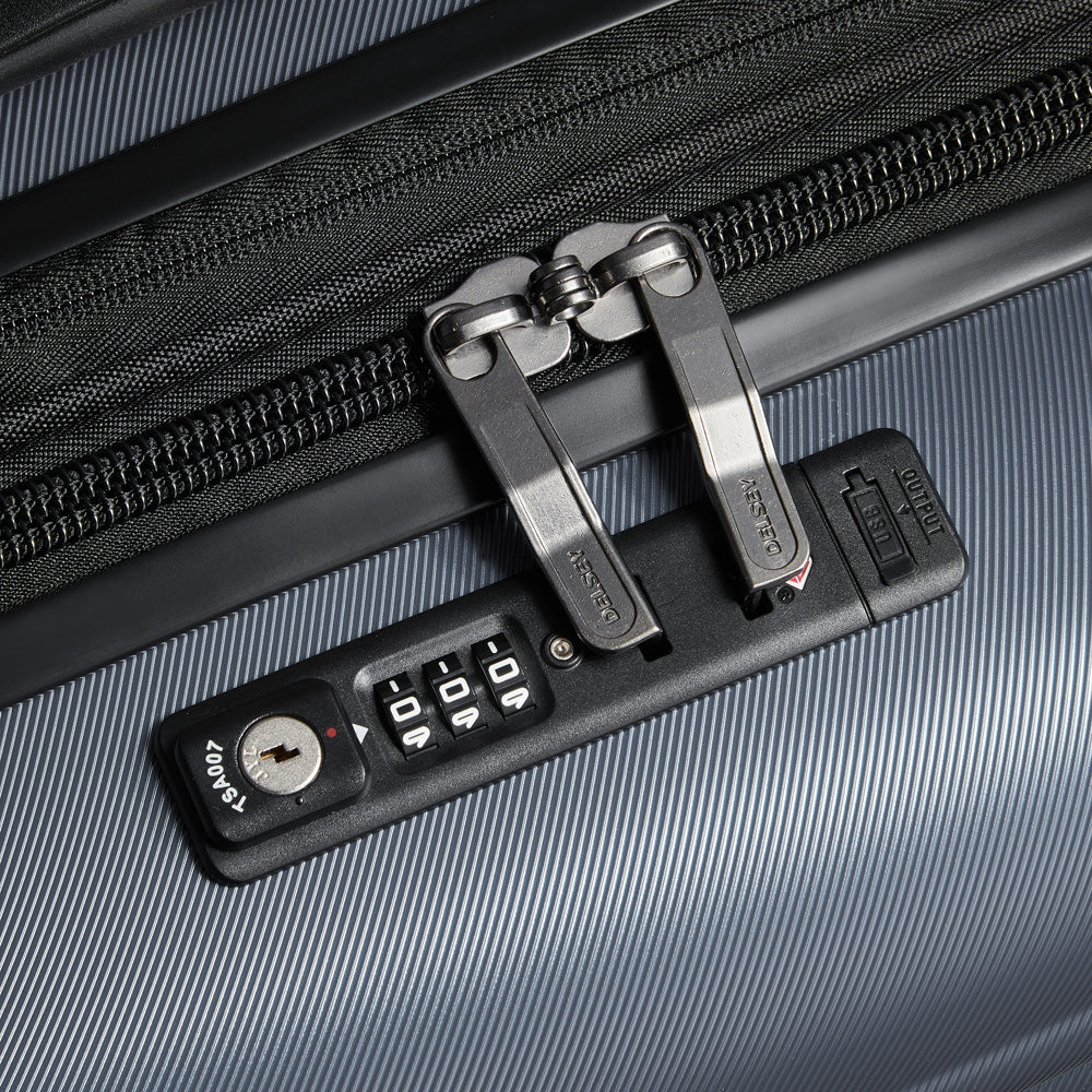 A smart collection inside and out! All bags feature dual-density spinner wheels for superior mobility and a built-in TSA-accepted lock for optimal security. The interior lining is removable and washable so you can keep the inside of your bag fresh for your next getaway. Plus the carry-on is equipped with a USB port and a power bank sleeve to power up devices on the go (power bank not included) while the medium and large sizes feature Delsey’s patented overweight indicator so you know if your luggage weighs more than 50 lbs.