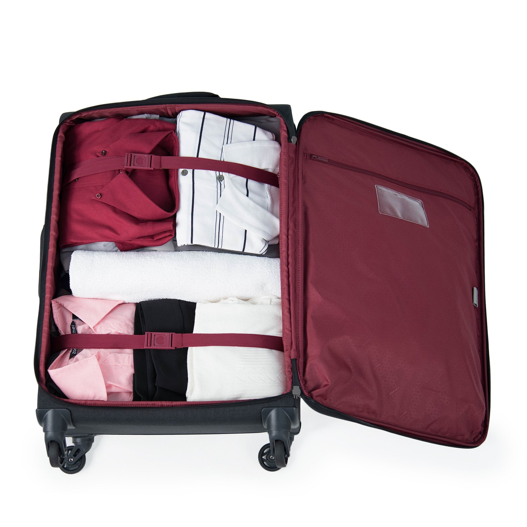 Corner protectors and PVC protection eliminate wear at key stress pointsOne large outside front pocket for extra packing flexibilityFoamed carry handles provide extra comfort when lifting a fully packed caseSelf-repairing, interlocking zippers allow securing the contents of your bag with a lockFully lined and roomy interior comes with webbing straps to minimize shifting of contents and 2 zippered pockets for delicate items and accessoriesTSA-accepted combination padlock provides secure travel -Materials: Polyester fabric
