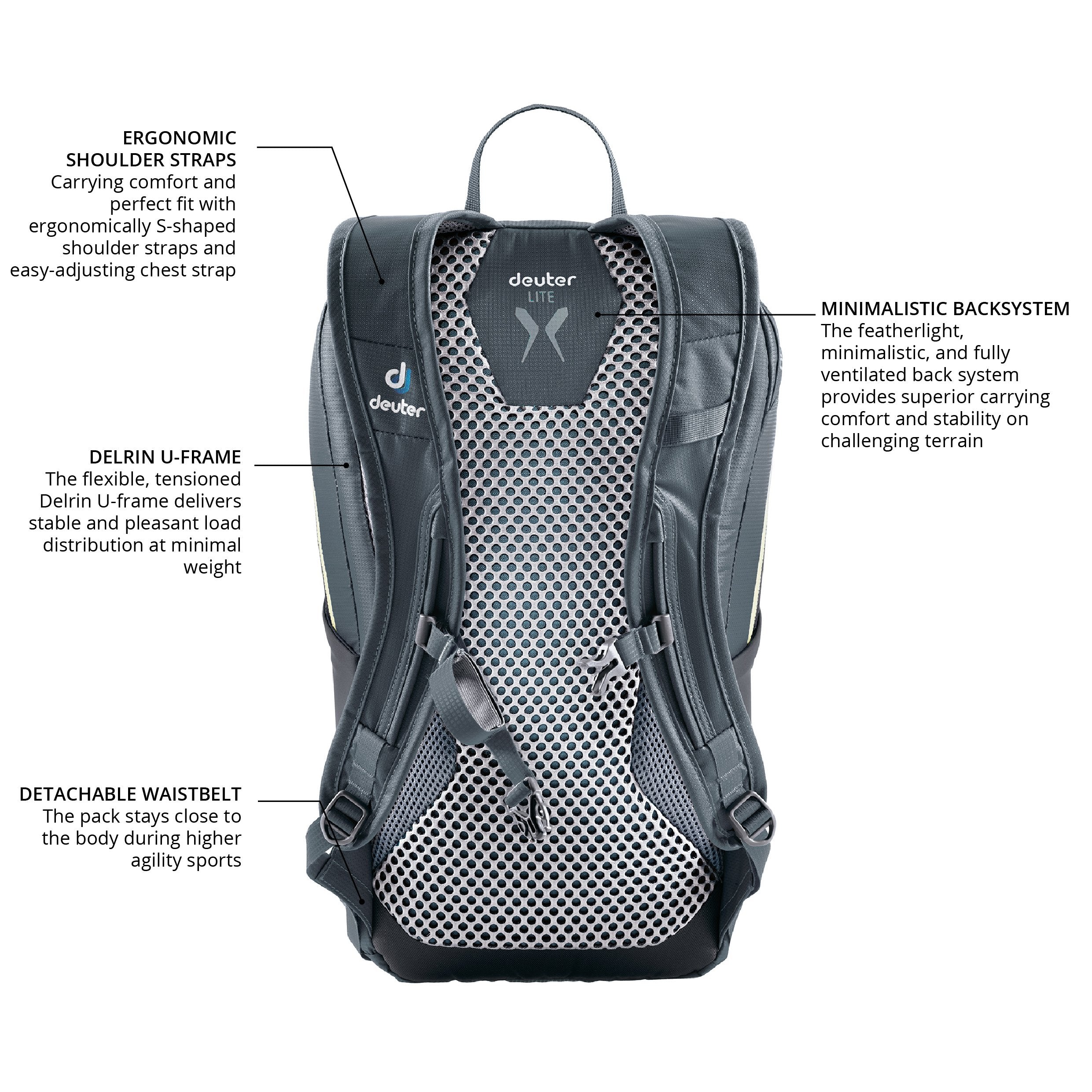 • ULTRALIGHT & VENTILATING - The Lite Backsystem is the lightest, most minimalistic back system from Deuter, providing carry comfort for light loads with a padded back panel of ventilated 3D-Air Mesh; The pack totals a miniscule 13 oz. with 16-liter capacity