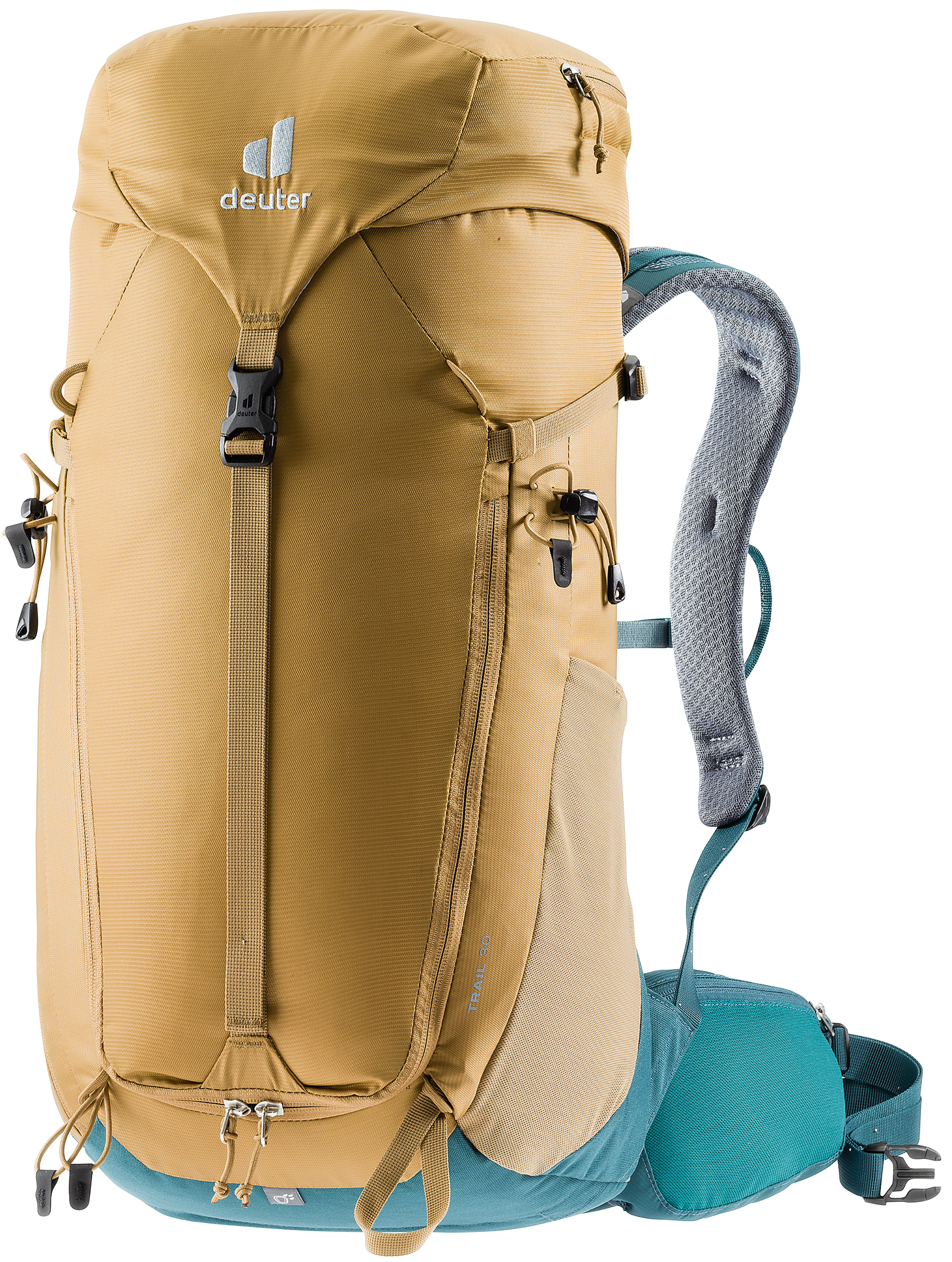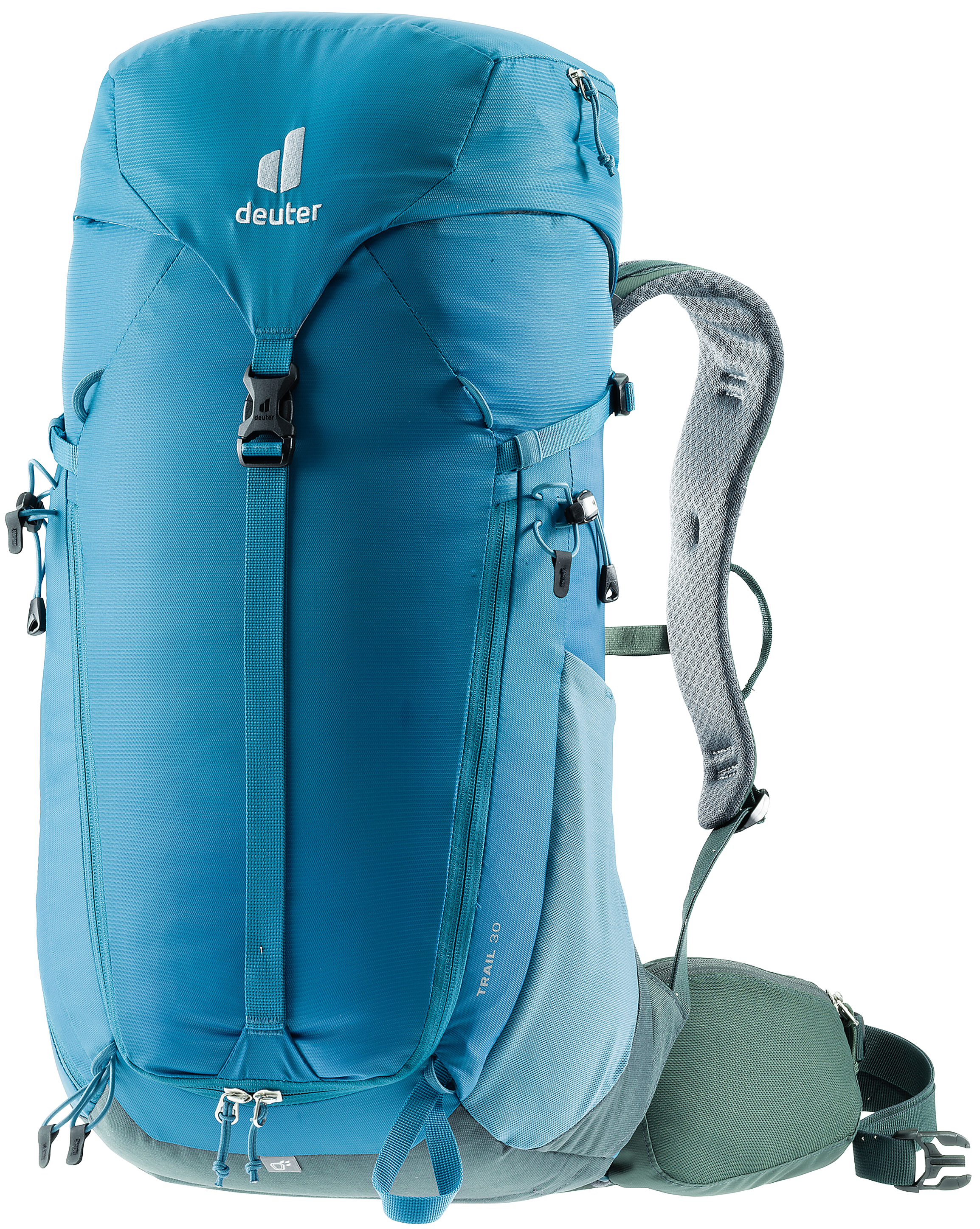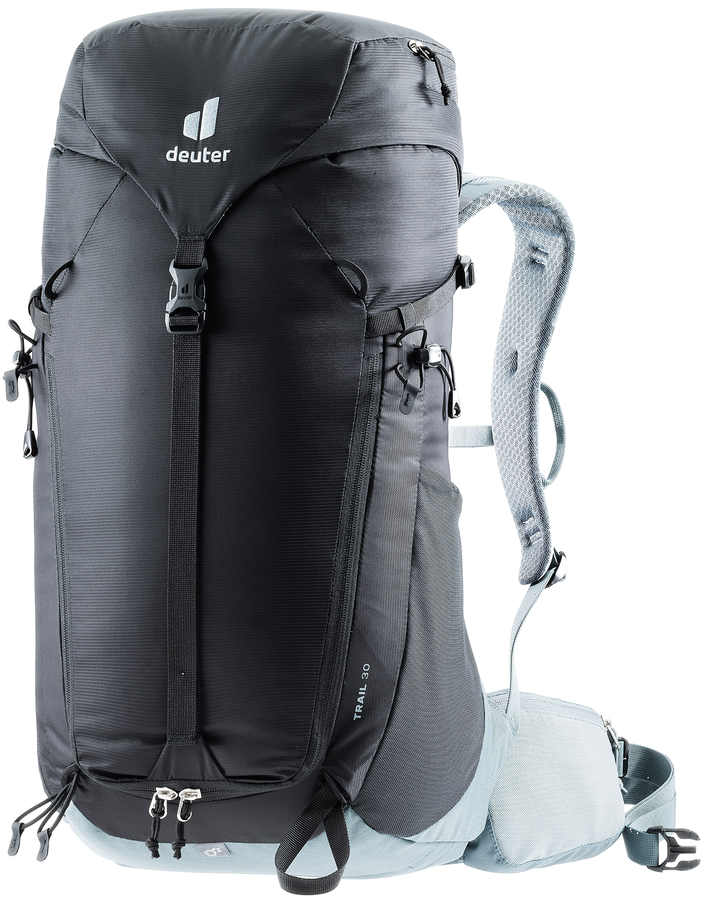 The new Trail 30 was built for alpine hikers and climbers who explore at the highest altitudes. The Trail 30 features the best of Deuters hiking and climbing packs in a lightweight, durable package. Integrated compression straps allow gear to stay in place, while additional carabiner holders on the shoulder straps, a large 2-way frontal zipper for fast access to deeper lying items, helmet holder loops, pole attachments, removable rain cover and a storable, flat lid which ensures freedom of movement even with a helmet on makes this the ideal, versatile pack for hikers and climbers who dont want to compromise on features and volume adjustability.