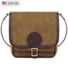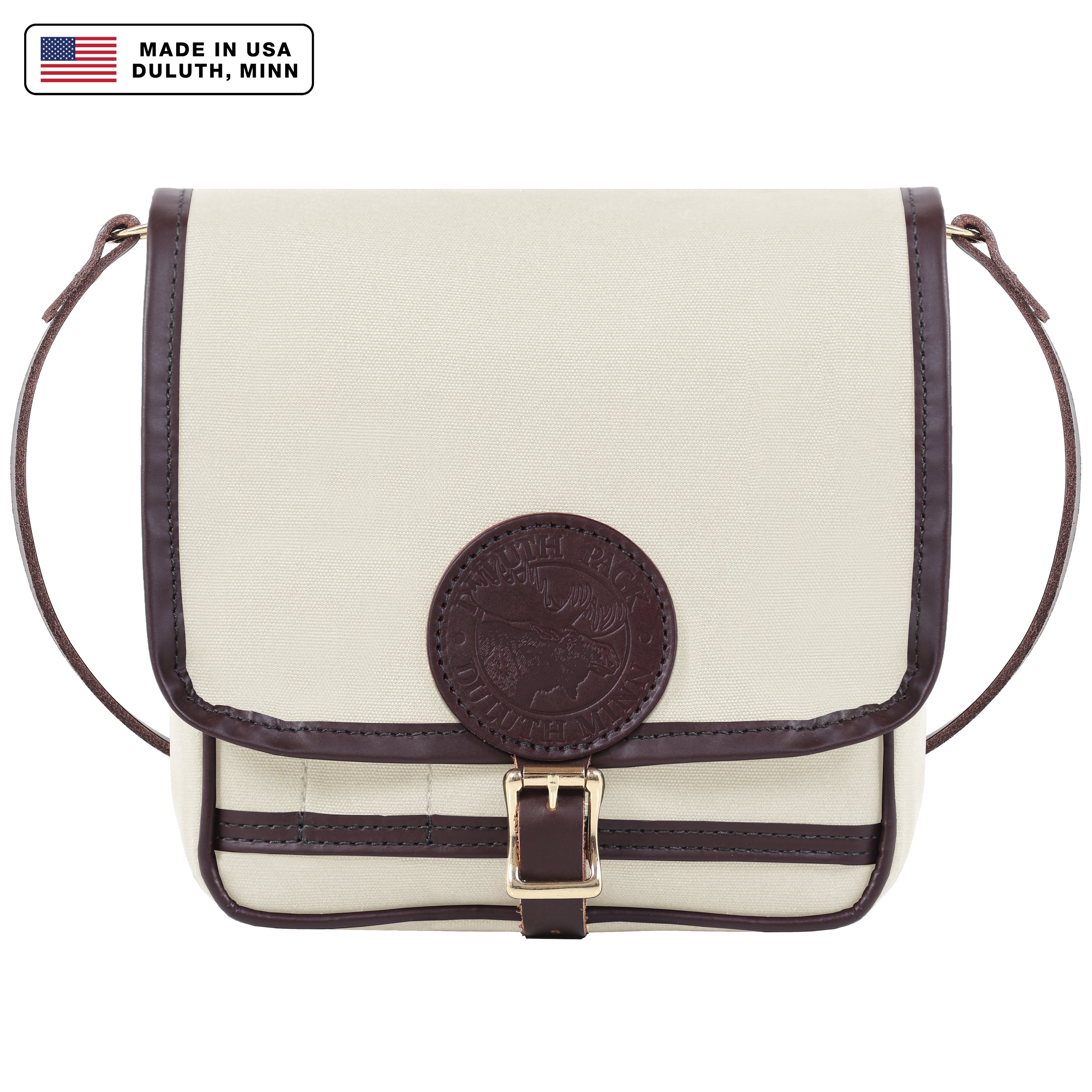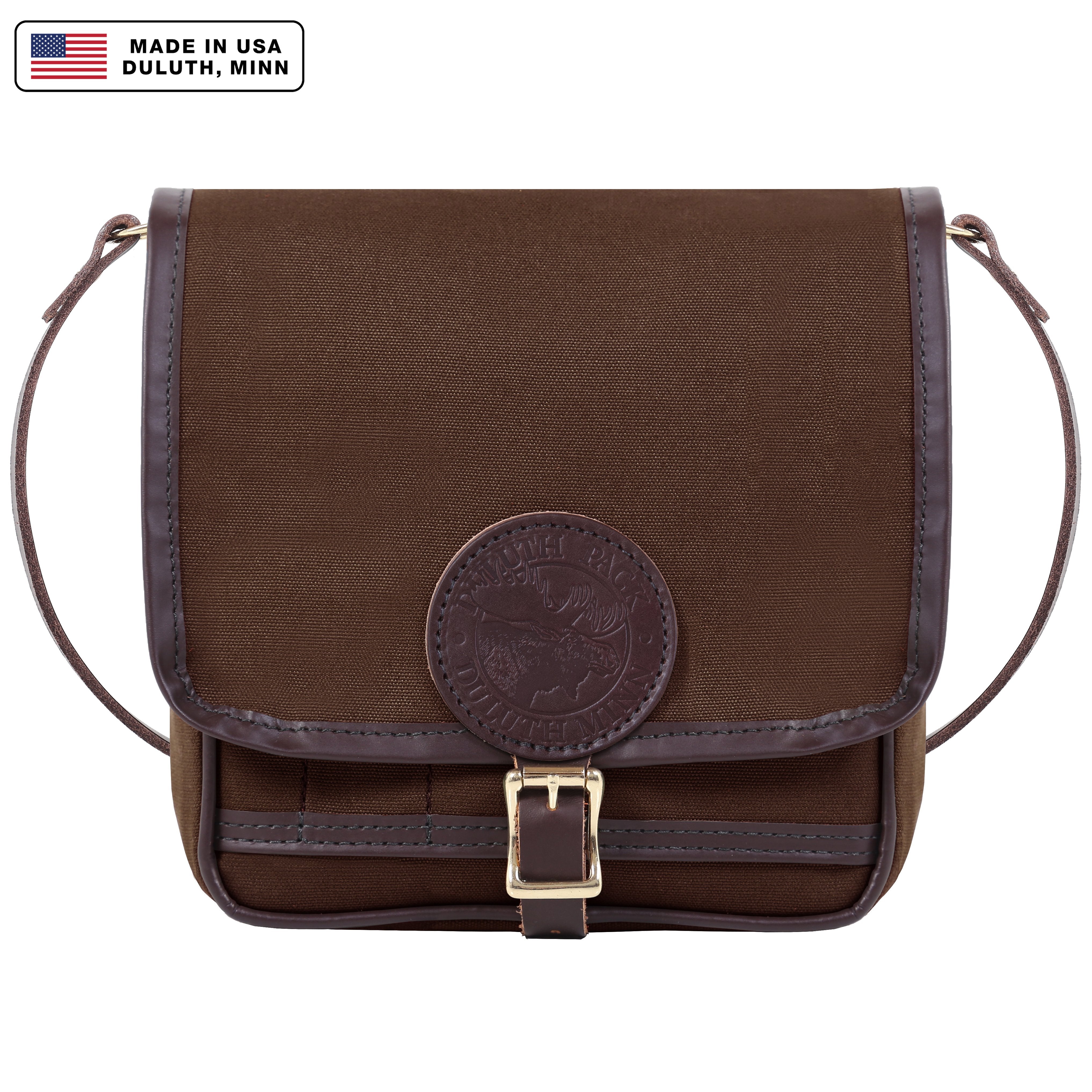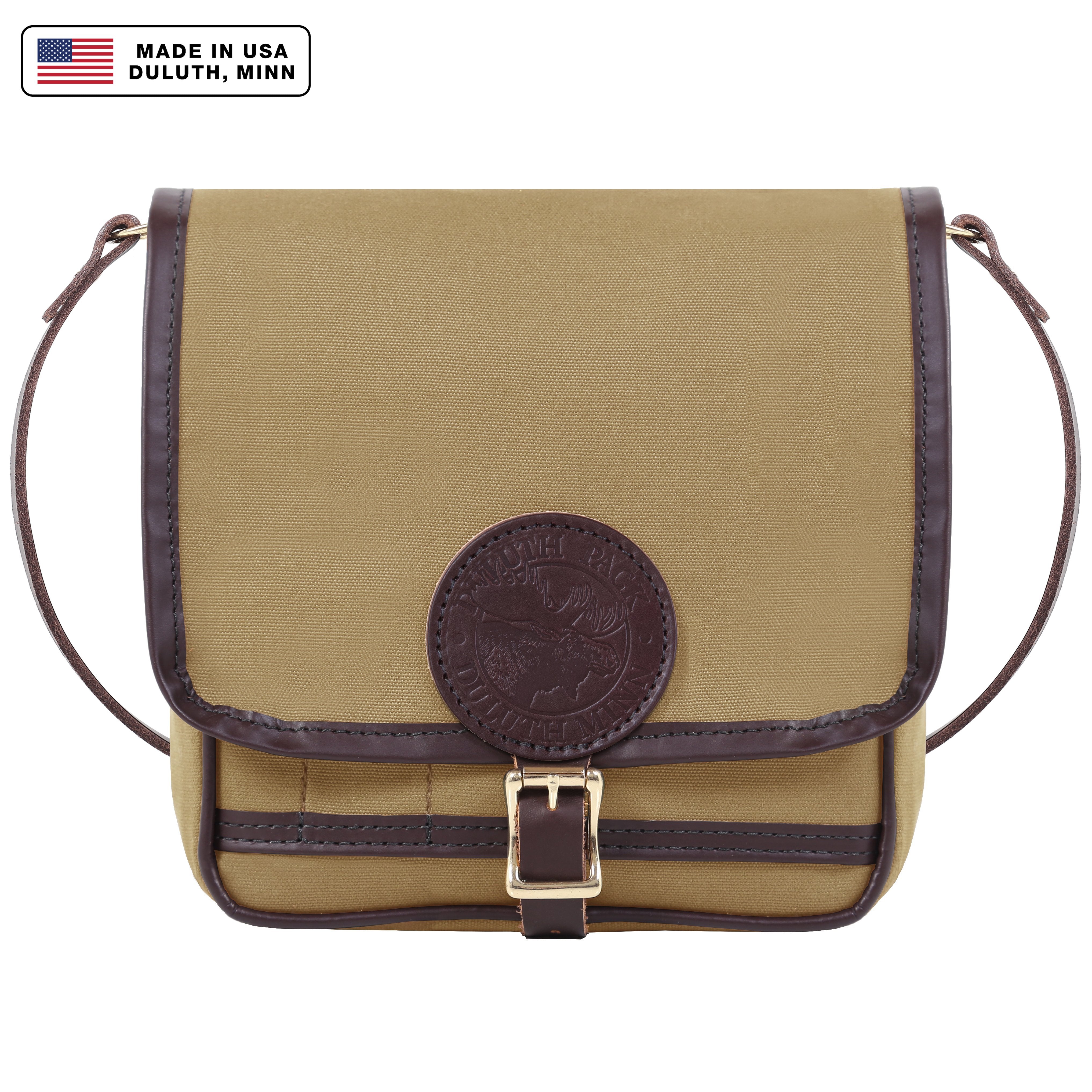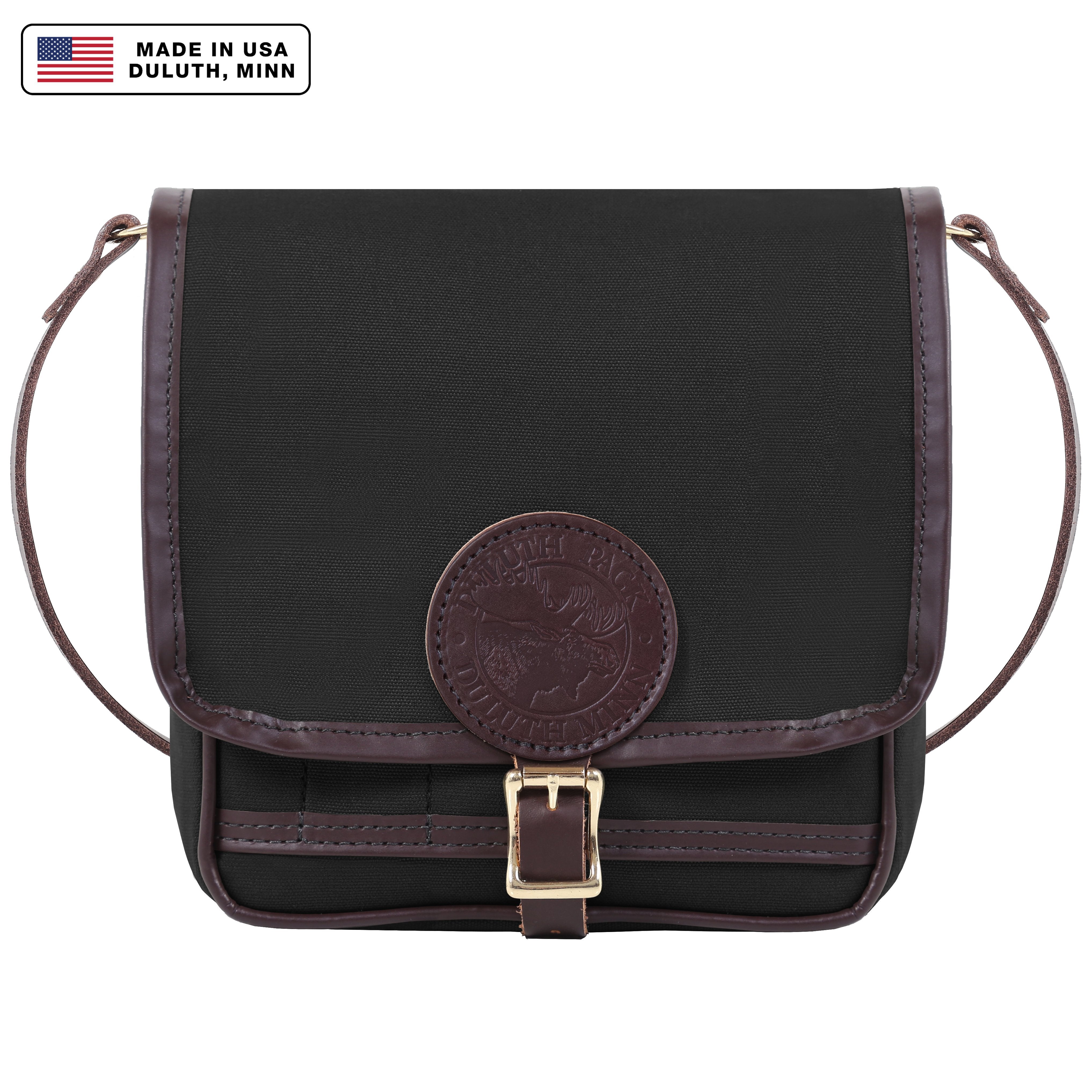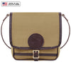Premium leather flap strap with buckling closure Internal slip pockets and back slash pocket to keep you organized. Adjustable leather shoulder strap. Tough 15 ounce cotton canvas construction. Guaranteed for life. Made in the USA.