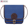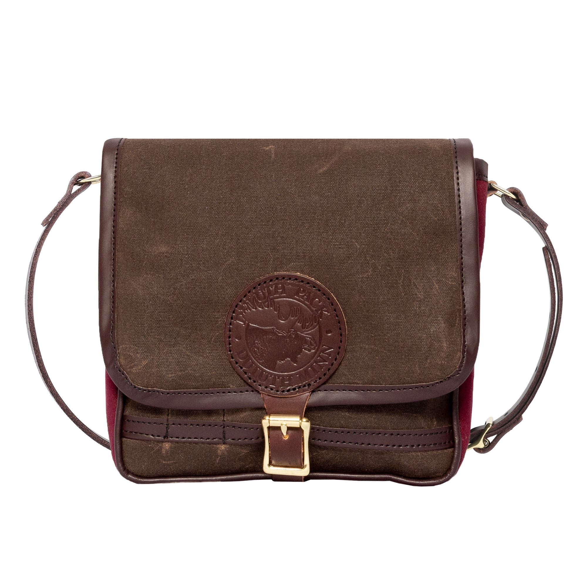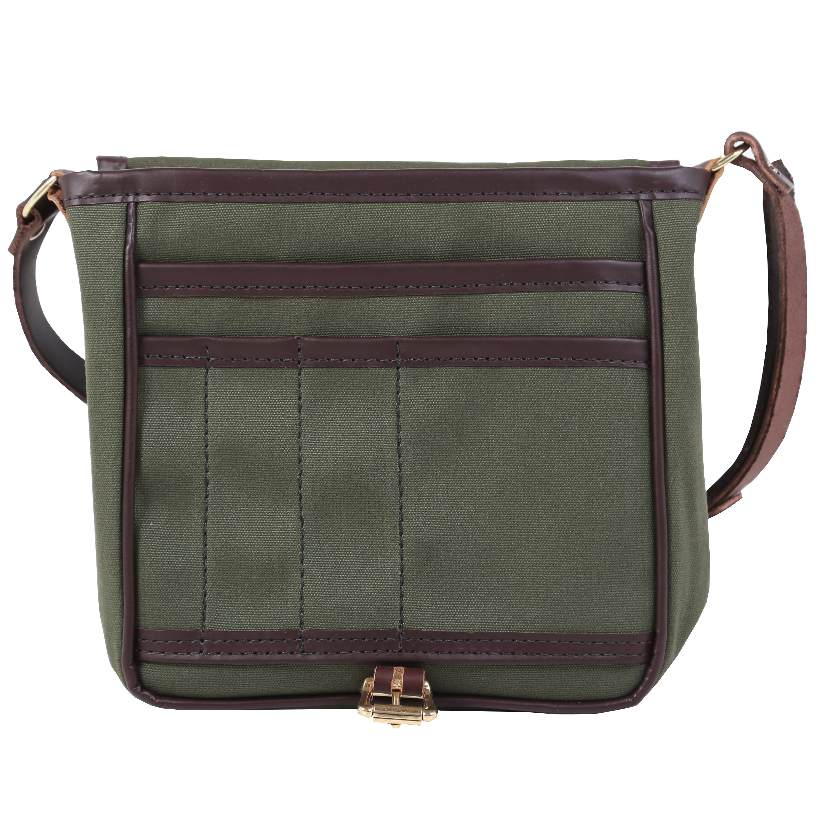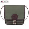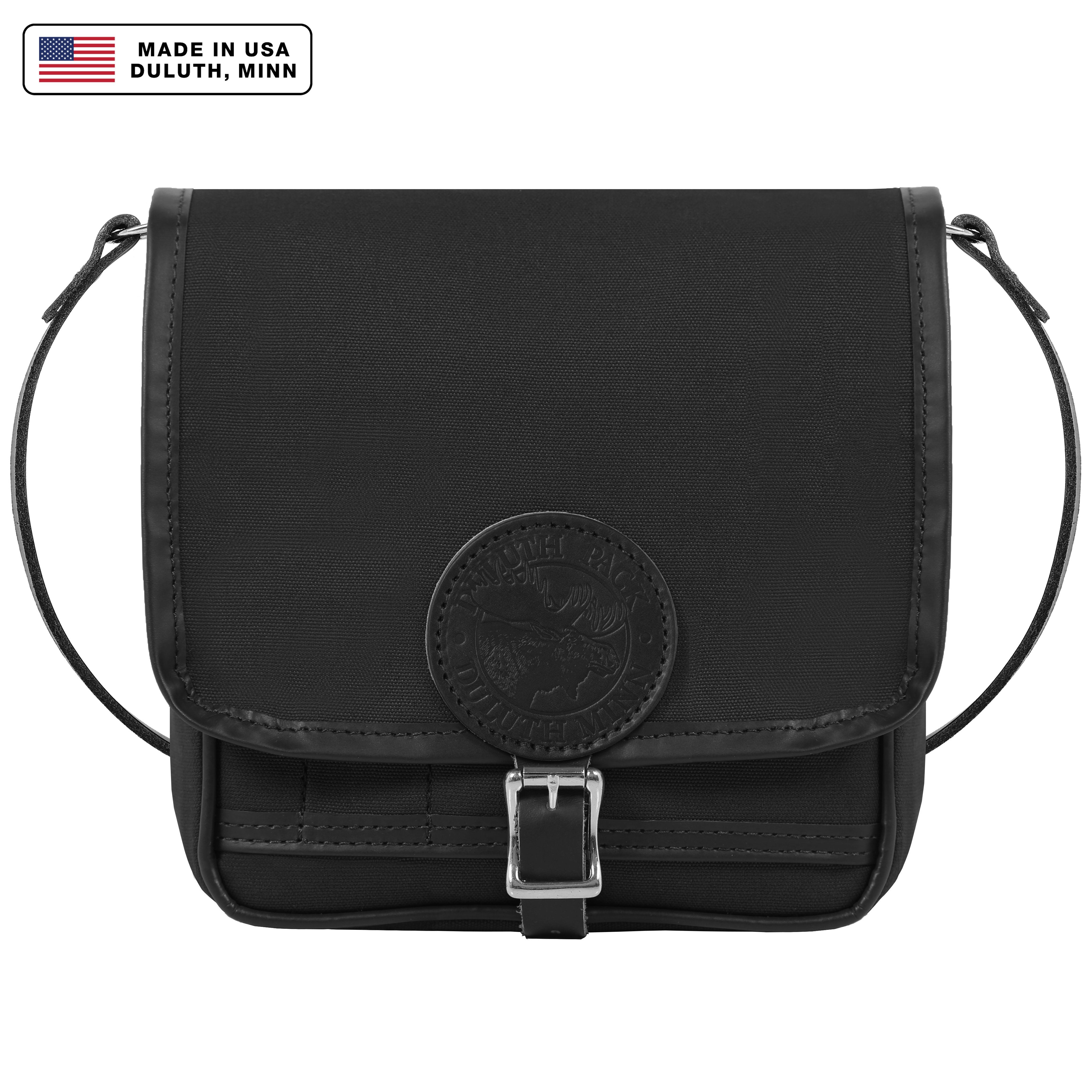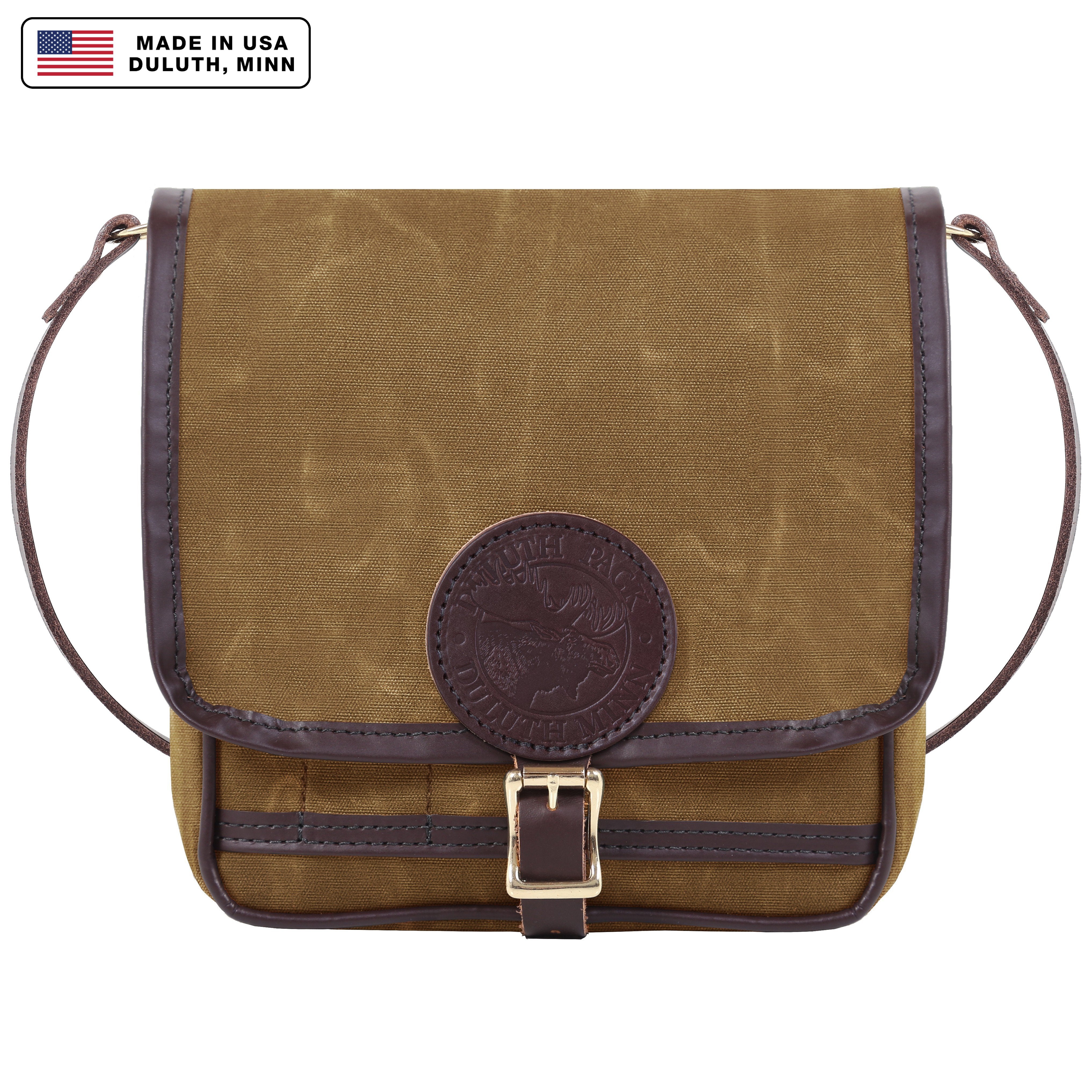 Premium leather flap strap with buckling closure Internal slip pockets and back slash pocket to keep you organized. Adjustable leather shoulder strap. Tough 15 ounce cotton canvas construction. Guaranteed for life. Made in the USA.